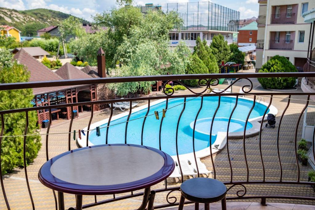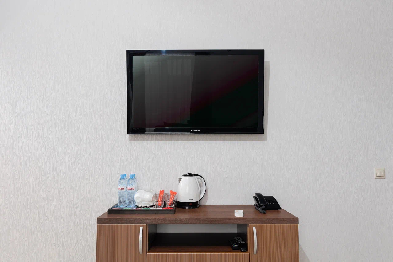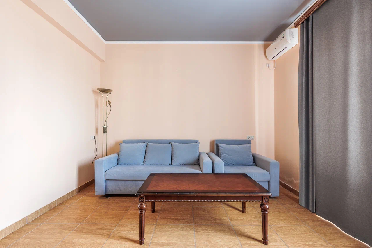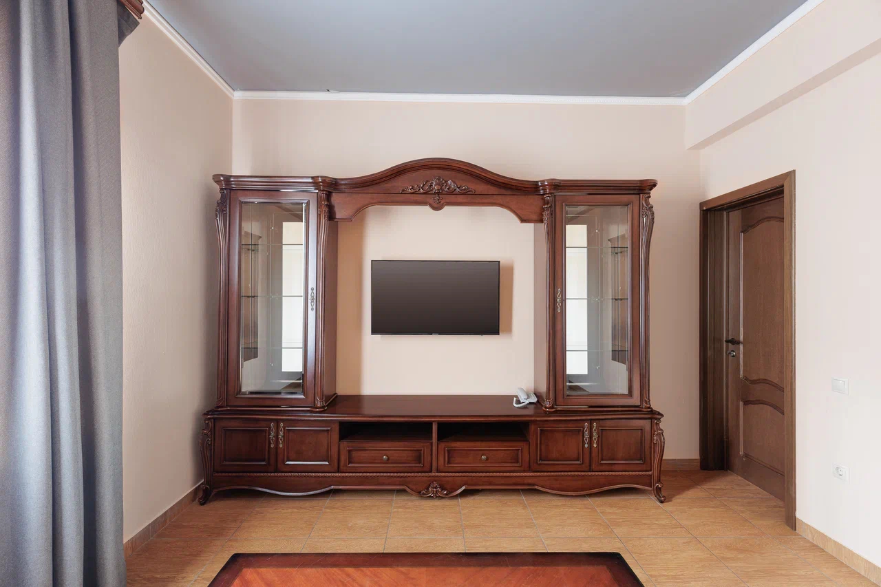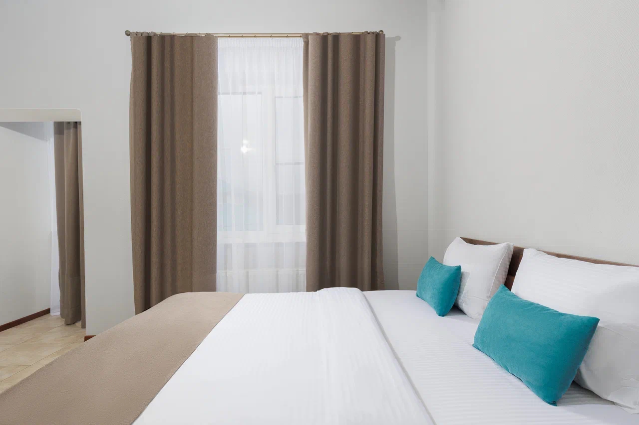 Площадь номера - 60 кв.м. 2 осн. места. 2 доп. места. Балкон. Мебель: вешалка, диван, зеркало, кровать двуспальная, прикроватные тумбочки, стол, стулья, шкаф. Мини-кухня. Оборудование: гладильная доска, микроволновая печь, мини-холодильник, набор посуды, сейф, сплит-система, телевизор ЖК, утюг, чайный набор посуды, электрочайник. Санузел: с душем, тапочки, туалетные принадлежности, фен, халат. Сервис: Wi-Fi бесплатно, смена полотенец (1 раз в 3 дня), смена постельного белья (1 раз в 3 дня), уборка номера (ежедневно).