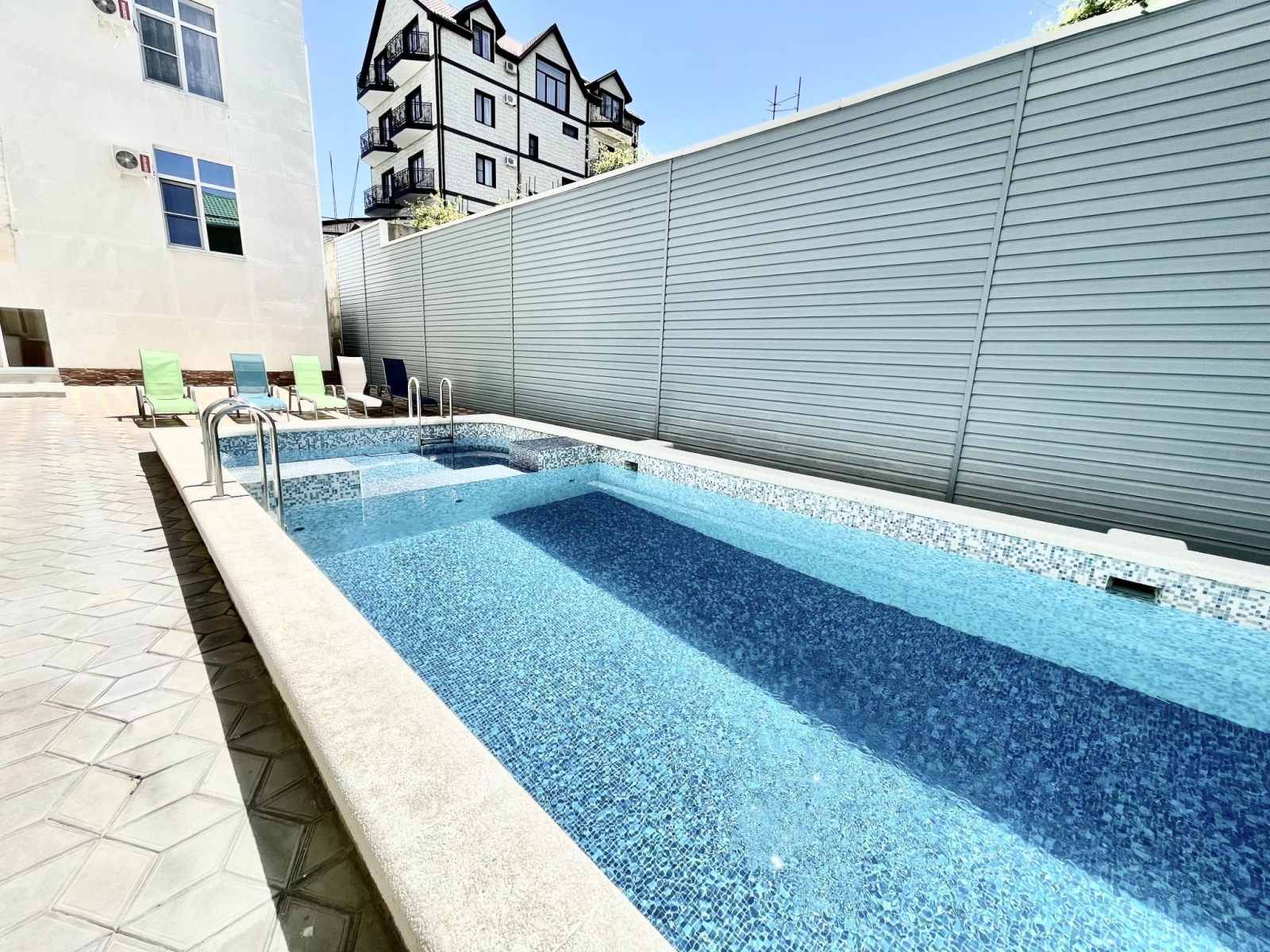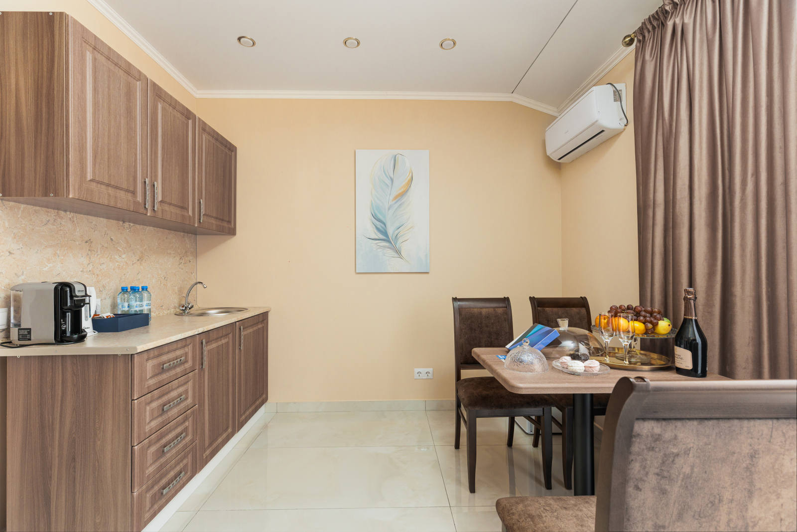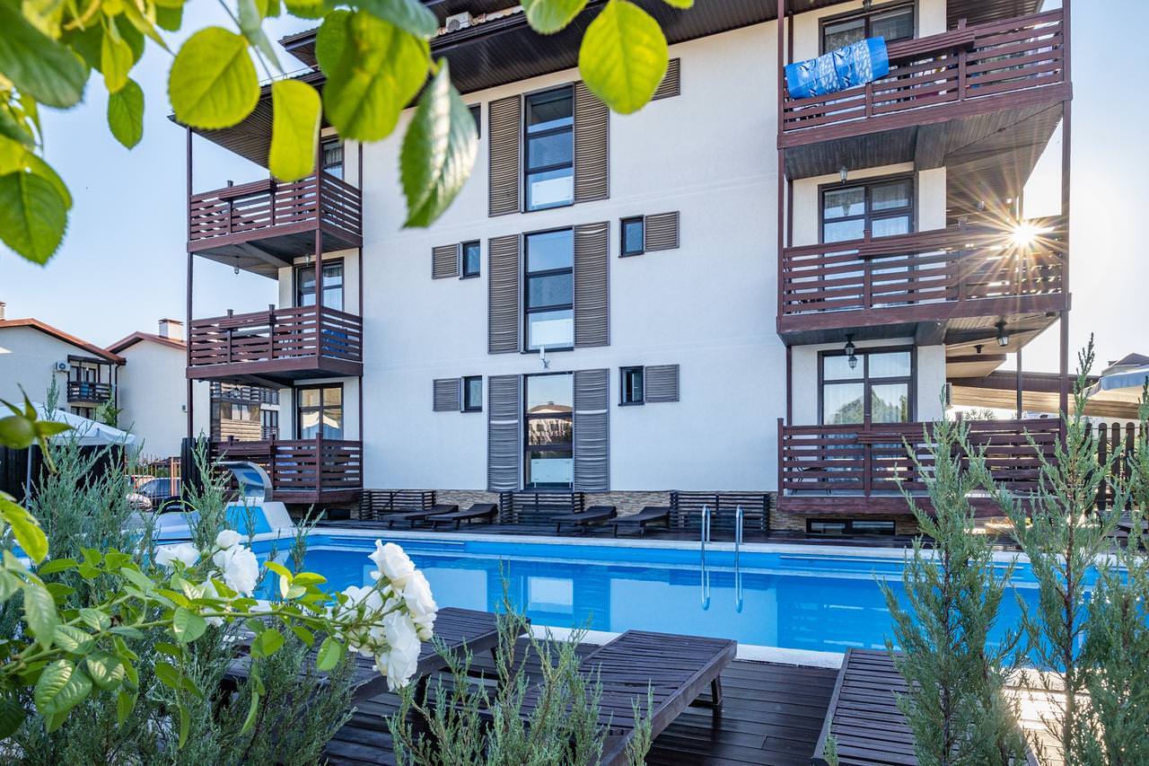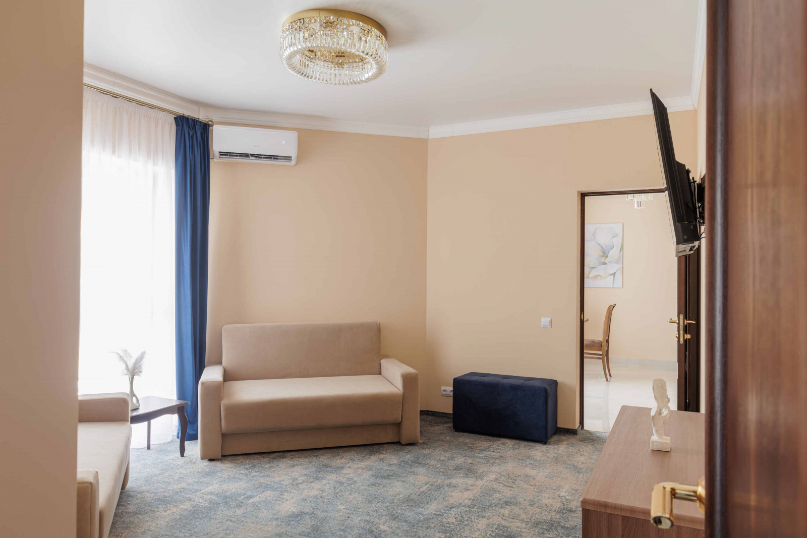 Площадь номера - 60 кв.м. 2 осн. места. 2 доп. места. Балкон. Мебель: вешалка, диван, зеркало, кровать двуспальная, прикроватные тумбочки, стол, стулья, шкаф. Мини-кухня. Оборудование: гладильная доска, микроволновая печь, мини-холодильник, набор посуды, сейф, сплит-система, телевизор ЖК, утюг, чайный набор посуды, электрочайник. Санузел: с душем, тапочки, туалетные принадлежности, фен, халат. Сервис: Wi-Fi бесплатно, смена полотенец (1 раз в 3 дня), смена постельного белья (1 раз в 3 дня), уборка номера (ежедневно).