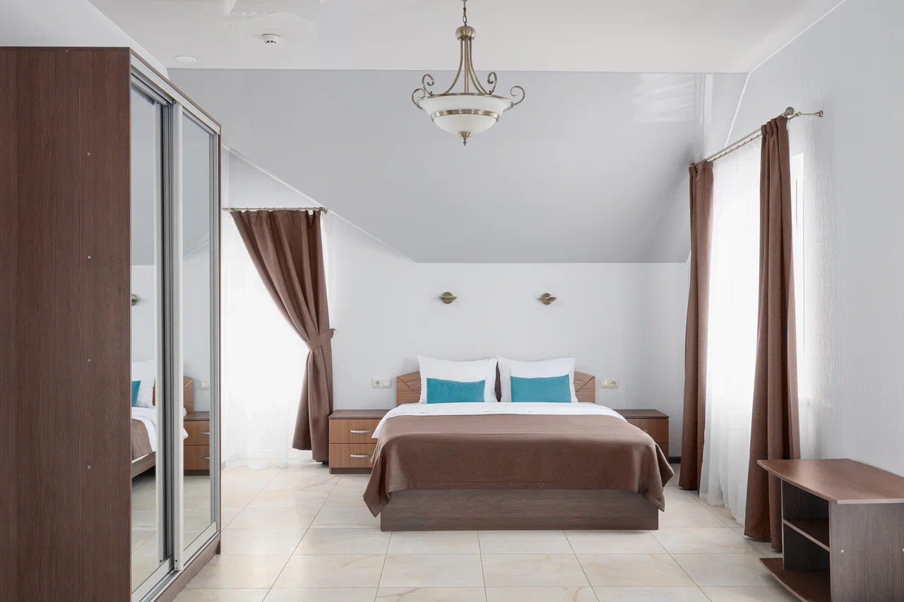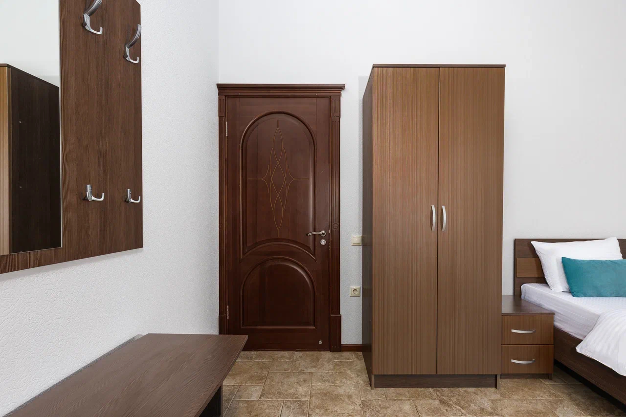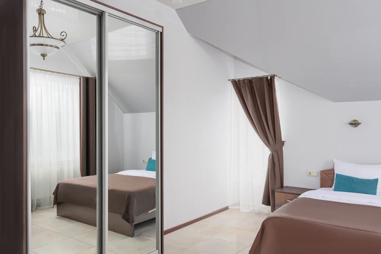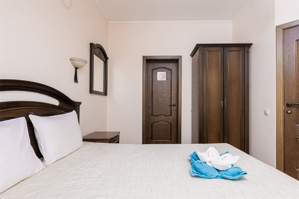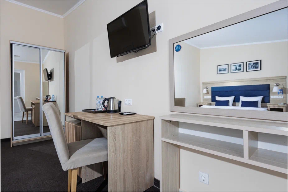 2 осн. места. Мебель: вешалка, зеркало, кровати односпальные /одна двуспальная кровать, прикроватные тумбочки, стол, стулья, шкаф. Оборудование: гладильная доска, мини-холодильник, сейф, сплит-система, телевизор ЖК, утюг, электрочайник. Санузел: с душем, тапочки, туалетные принадлежности, фен, халат. Сервис: Wi-Fi бесплатно, смена полотенец (1 раз в 3 дня), смена постельного белья (1 раз в 3 дня), уборка номера (ежедневно).