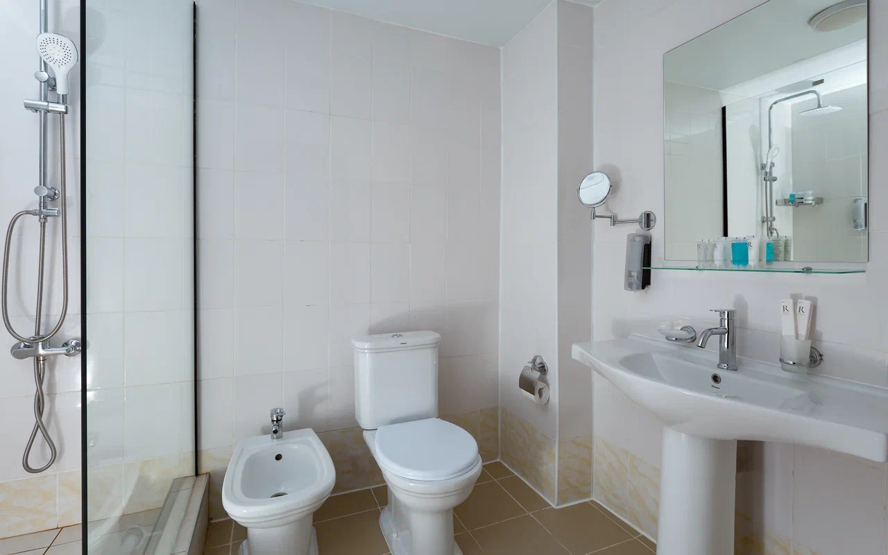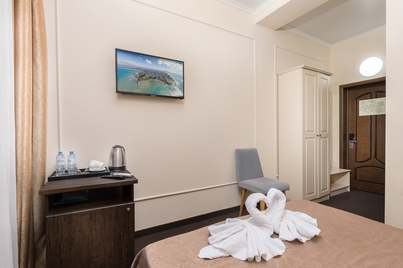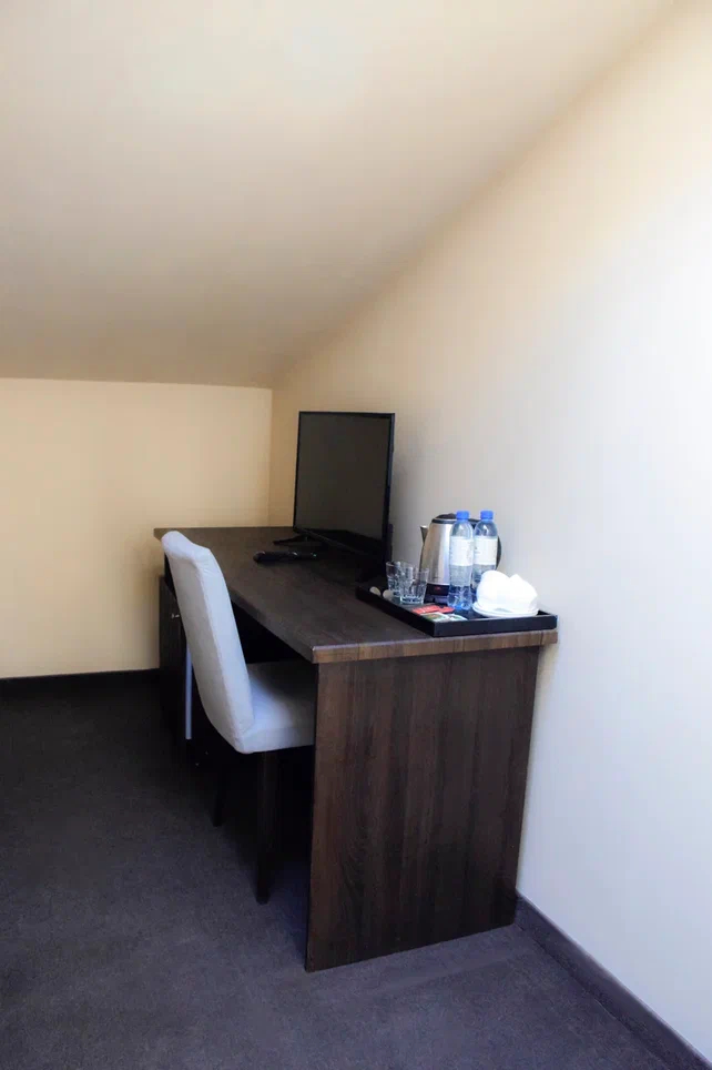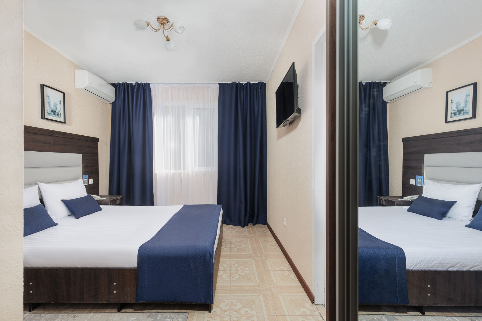 2 осн. места. Мебель: вешалка, зеркало, кровати односпальные /одна двуспальная кровать, прикроватные тумбочки, стол, стулья, шкаф. Оборудование: гладильная доска, мини-холодильник, сейф, сплит-система, телевизор ЖК, утюг, электрочайник. Санузел: с душем, тапочки, туалетные принадлежности, фен, халат. Сервис: Wi-Fi бесплатно, смена полотенец (1 раз в 3 дня), смена постельного белья (1 раз в 3 дня), уборка номера (ежедневно).