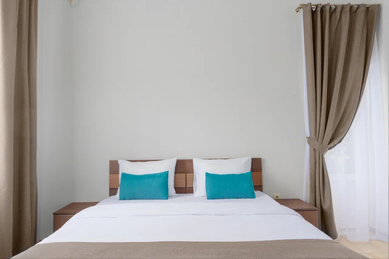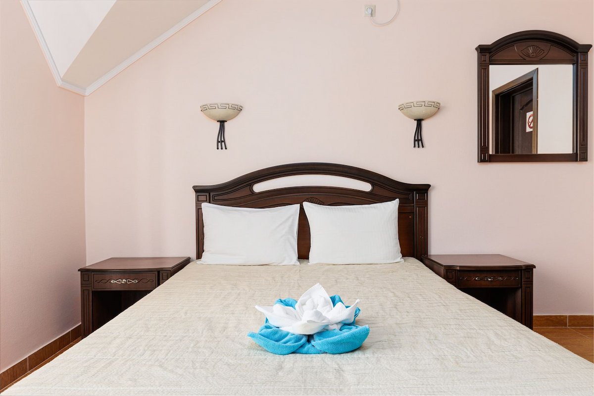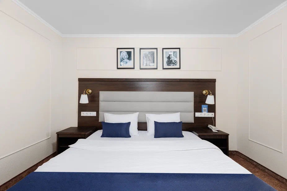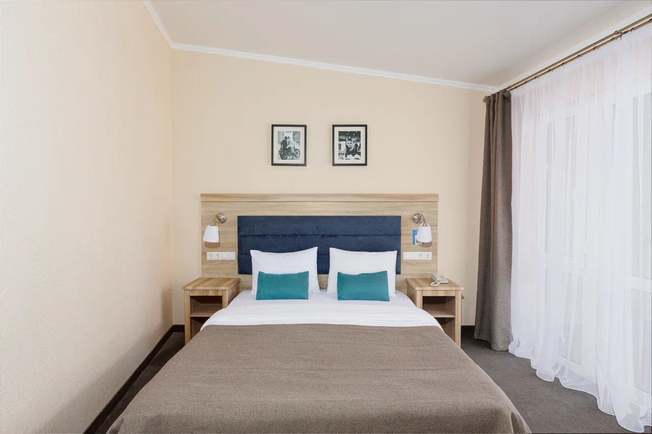 Площадь номера - 15 кв.м. 2 осн. места. Мебель: вешалка, зеркало, кровать двуспальная, прикроватные тумбочки, стол, стулья, шкаф. Оборудование: гладильная доска, мини-холодильник, сейф, сплит-система, телевизор ЖК, утюг, электрочайник. Санузел: с душем, тапочки, туалетные принадлежности, фен, халат. Сервис: Wi-Fi бесплатно, смена полотенец (1 раз в 3 дня), смена постельного белья (1 раз в 3 дня), уборка номера (ежедневно).