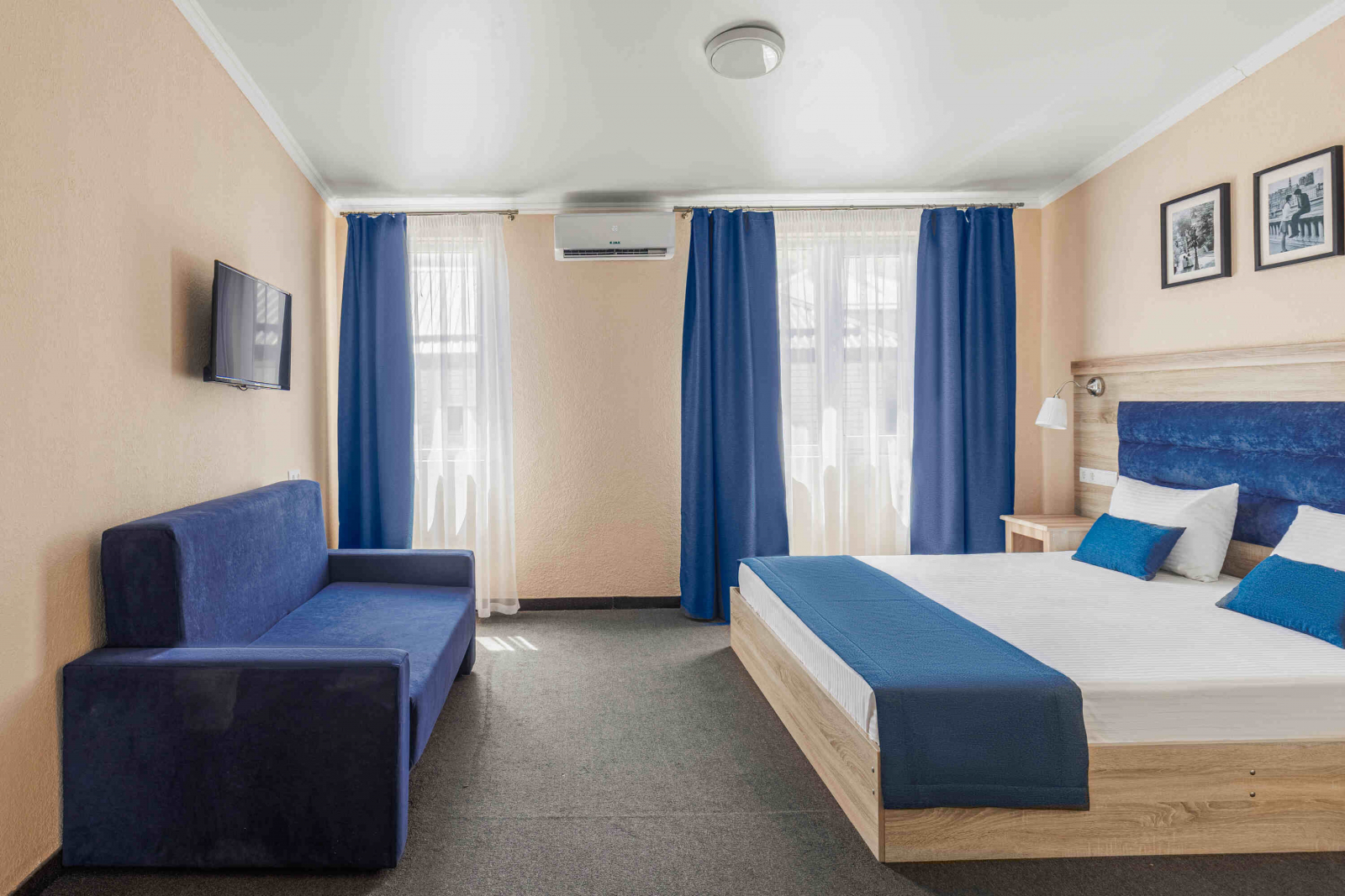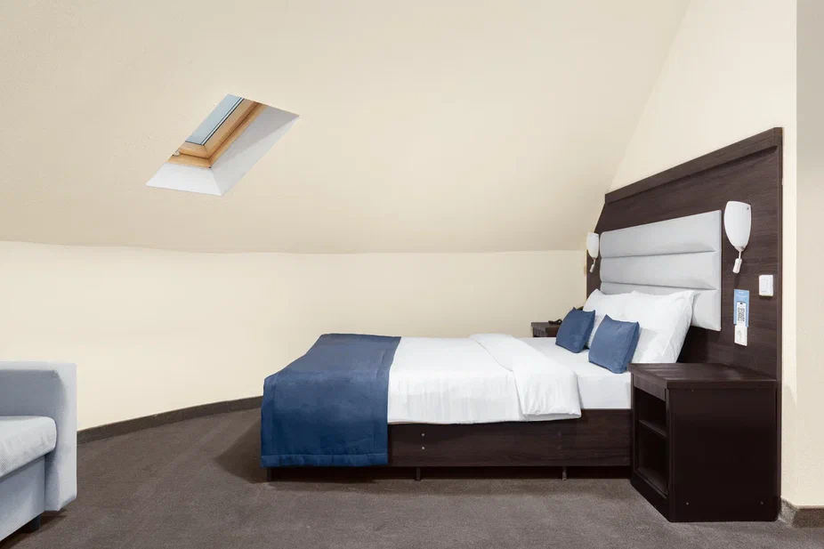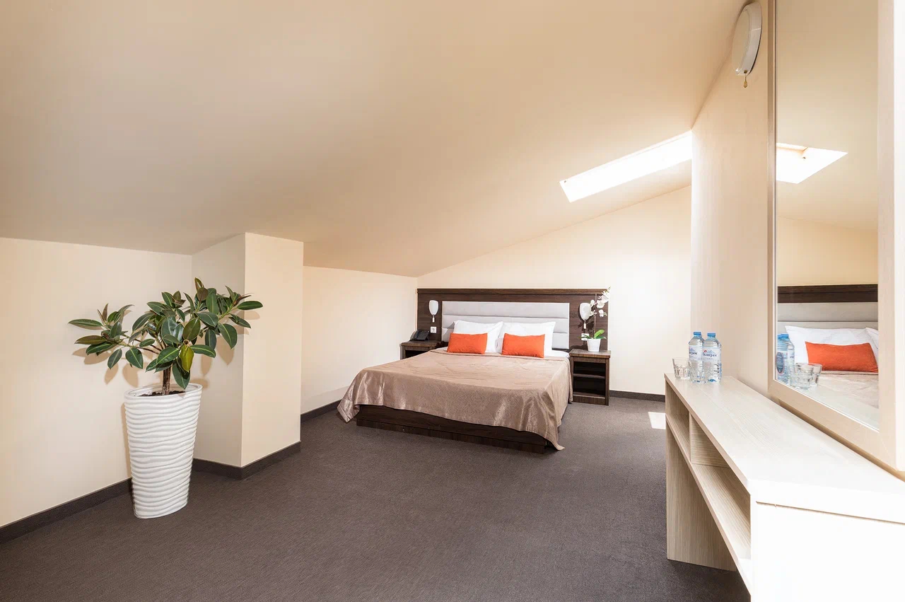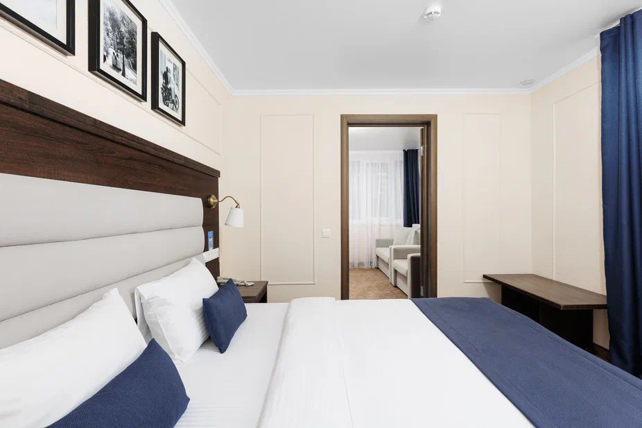 Площадь номера - 36 кв.м. 2 осн. места. 2 доп. места. Балкон. Мебель: вешалка, диван, зеркало, кровать двуспальная, прикроватные тумбочки, стол, стул, шкаф. Оборудование: гладильная доска, мини-холодильник, сейф, сплит-система, телевизор ЖК, утюг, электрочайник. Санузел: с душем, тапочки, туалетные принадлежности, фен, халат. Сервис: Wi-Fi бесплатно, смена полотенец (1 раз в 3 дня), смена постельного белья (1 раз в 3 дня), уборка номера (ежедневно).