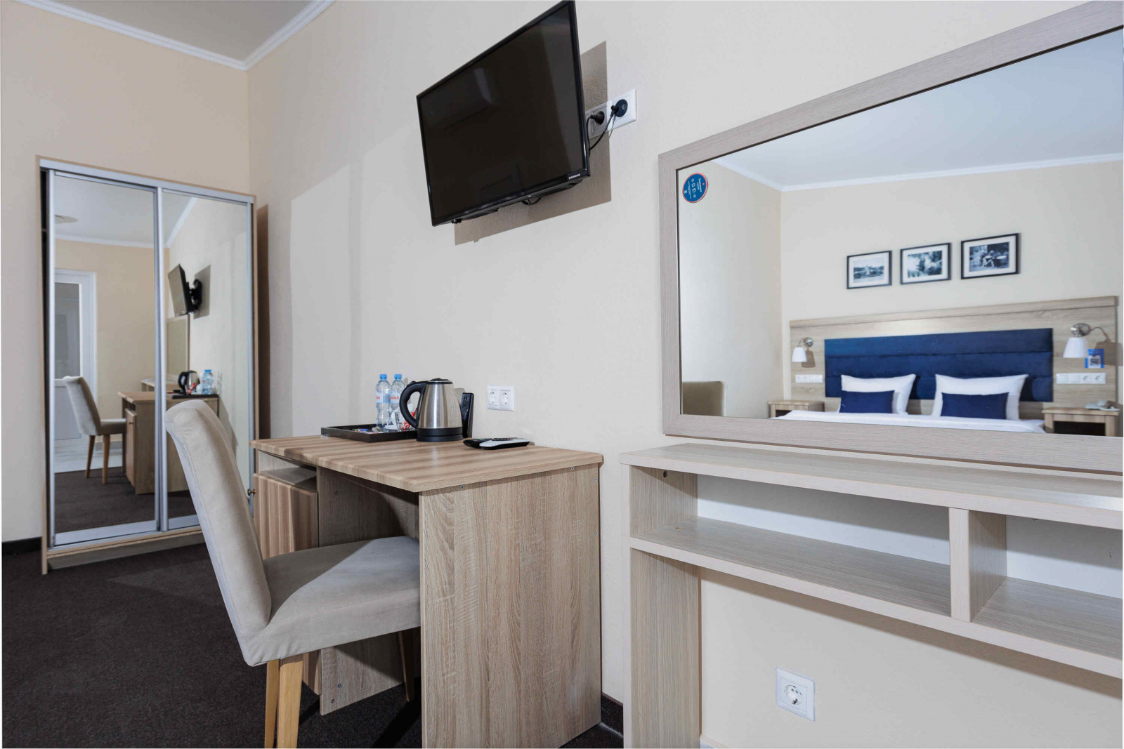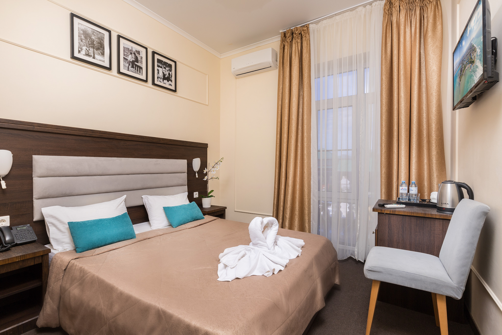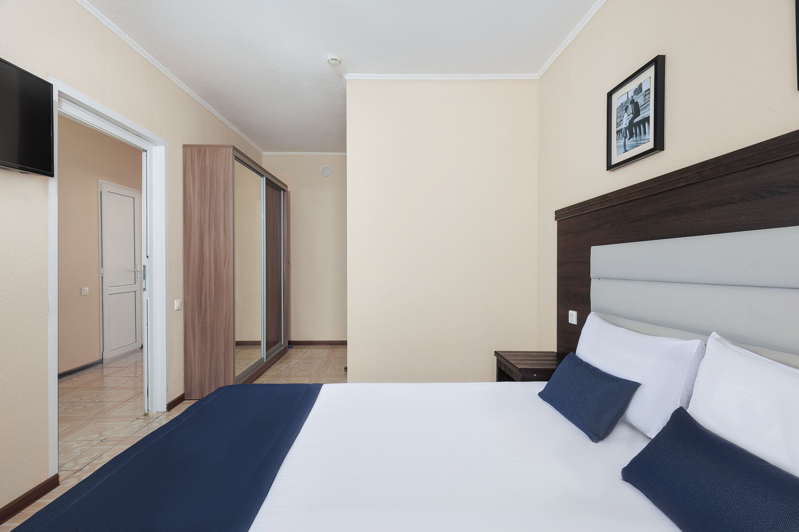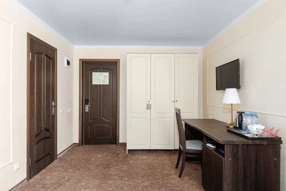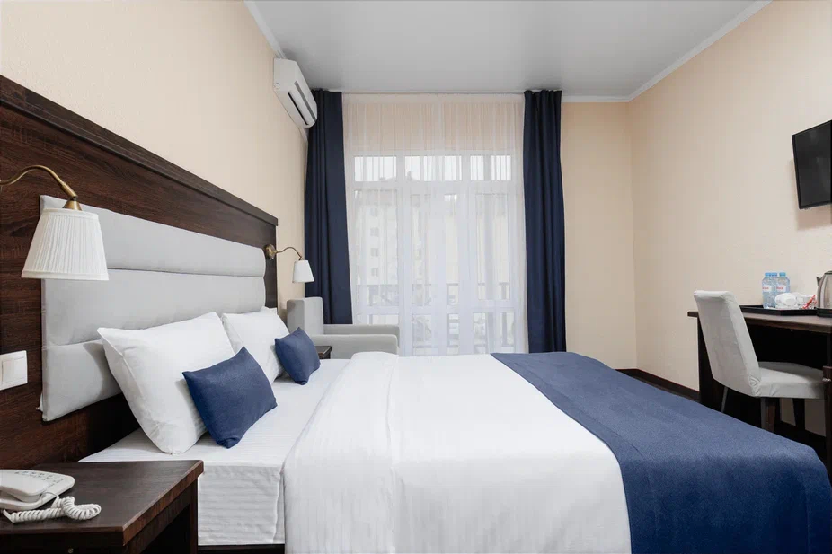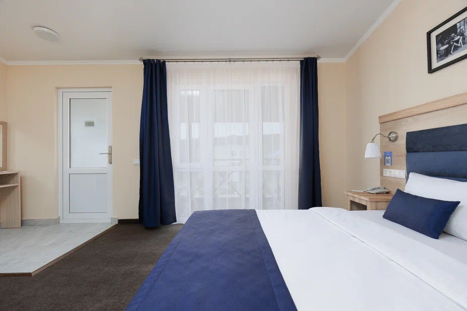 Площадь номера - 23 кв.м. 2 осн. места. 1 доп. место. Балкон. Мебель: вешалка, зеркало, кровать двуспальная, прикроватные тумбочки, стол, стул, шкаф. Оборудование: гладильная доска, мини-холодильник, сейф, сплит-система, телевизор ЖК, утюг, электрочайник. Санузел: с душем, тапочки, туалетные принадлежности, фен, халат. Сервис: Wi-Fi бесплатно, смена полотенец (1 раз в 3 дня), смена постельного белья (1 раз в 3 дня), уборка номера (ежедневно).