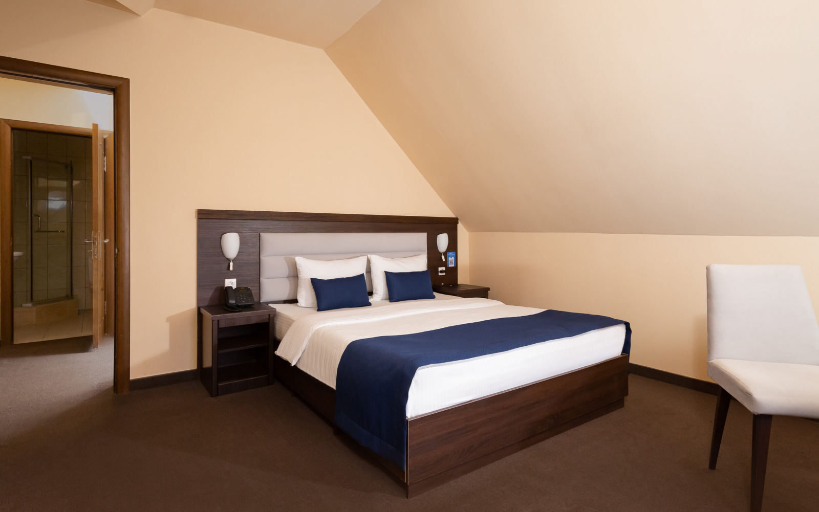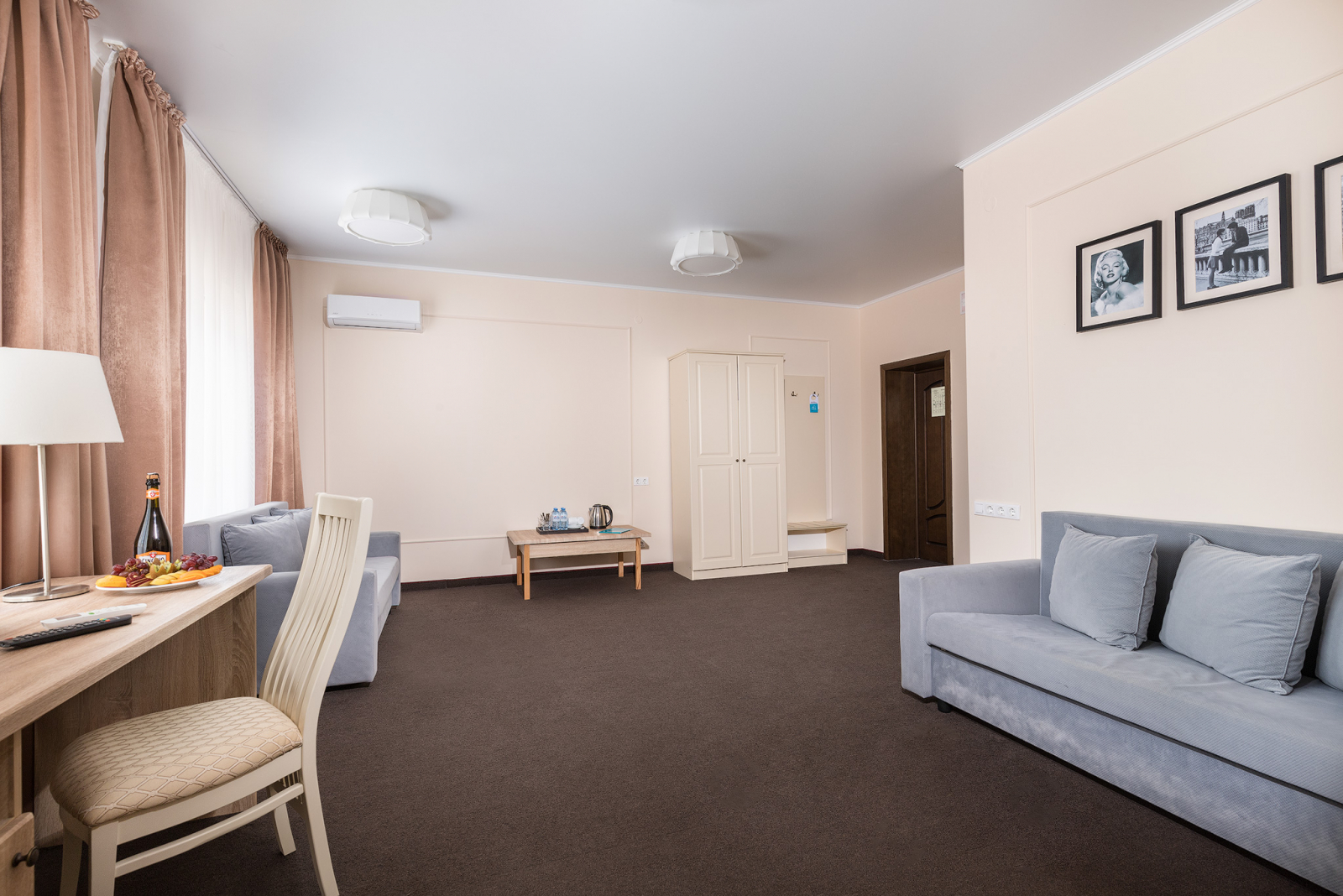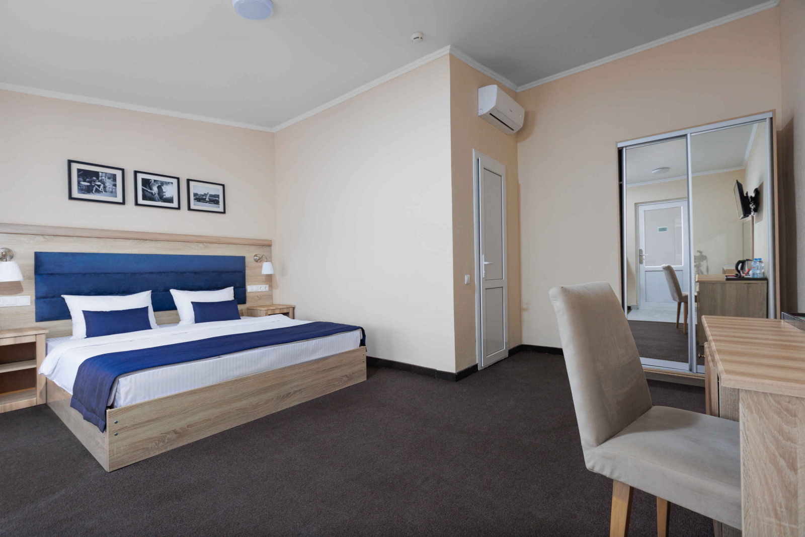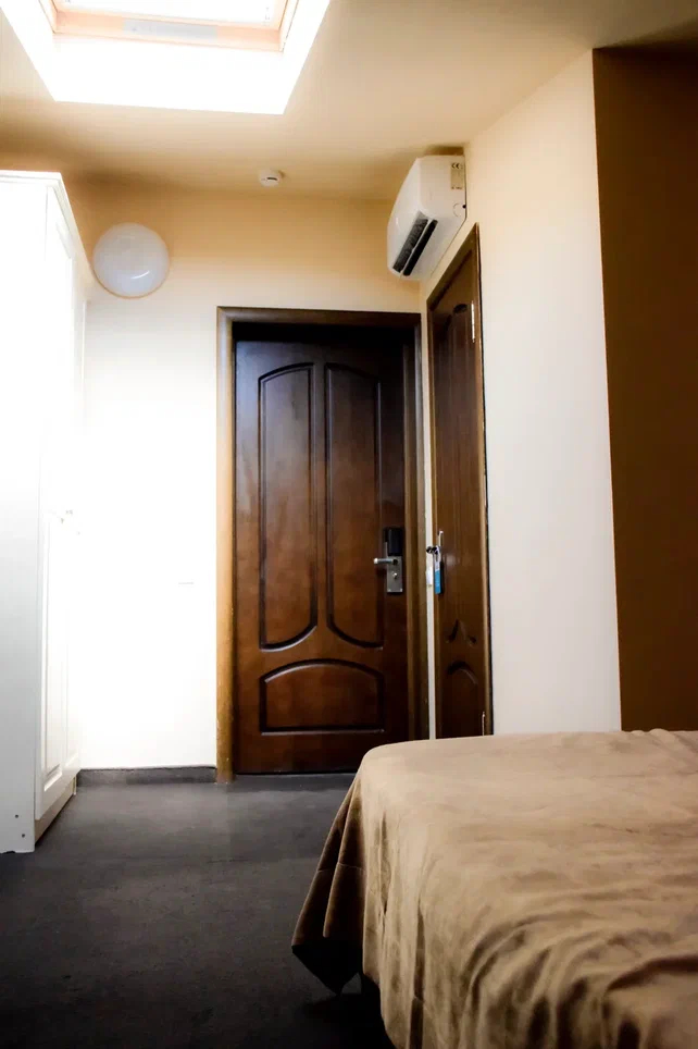2 осн. места. Мебель: вешалка, зеркало, кровать двуспальная, прикроватные тумбочки, стол, стулья, шкаф. Оборудование: гладильная доска, мини-холодильник, сейф, сплит-система, телевизор ЖК, утюг, электрочайник. Санузел: с душем, тапочки, туалетные принадлежности, фен, халат. Сервис: Wi-Fi бесплатно, смена полотенец (1 раз в 3 дня), смена постельного белья (1 раз в 3 дня), уборка номера (ежедневно).
