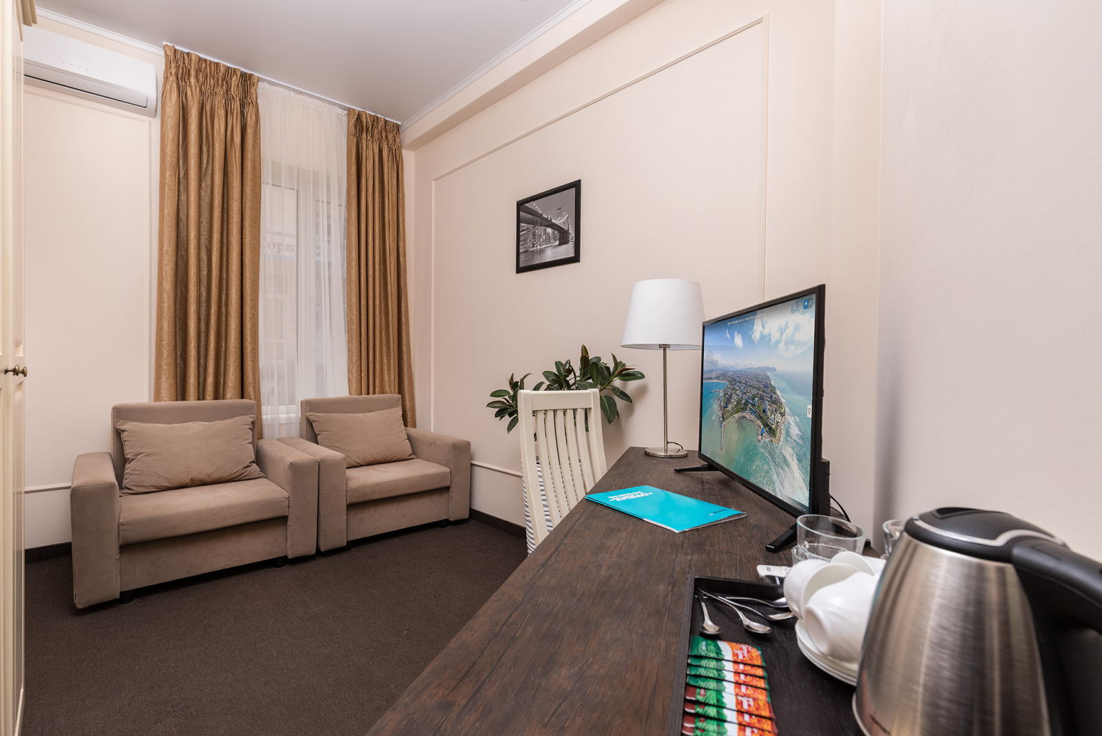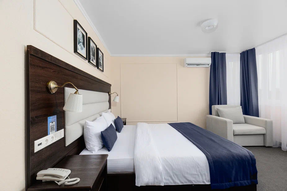 Площадь номера - 23 кв.м. 2 осн. места. 1 доп. место. Мебель: вешалка, зеркало, кресло-кровать, кровать двуспальная, прикроватные тумбочки, стол, стулья, шкаф. Оборудование: гладильная доска, мини-холодильник, сейф, сплит-система, телевизор ЖК, утюг, электрочайник. Санузел: с душем, тапочки, туалетные принадлежности, фен, халат. Сервис: Wi-Fi бесплатно, смена полотенец (1 раз в 3 дня), смена постельного белья (1 раз в 3 дня), уборка номера (ежедневно).