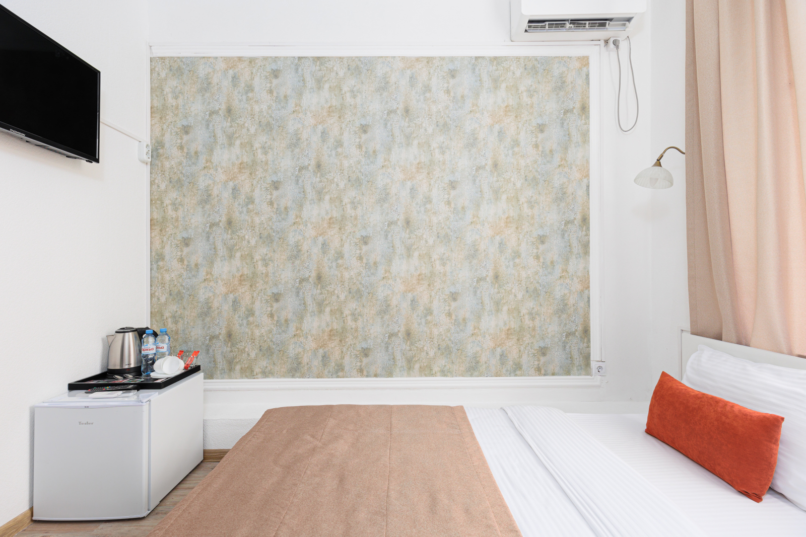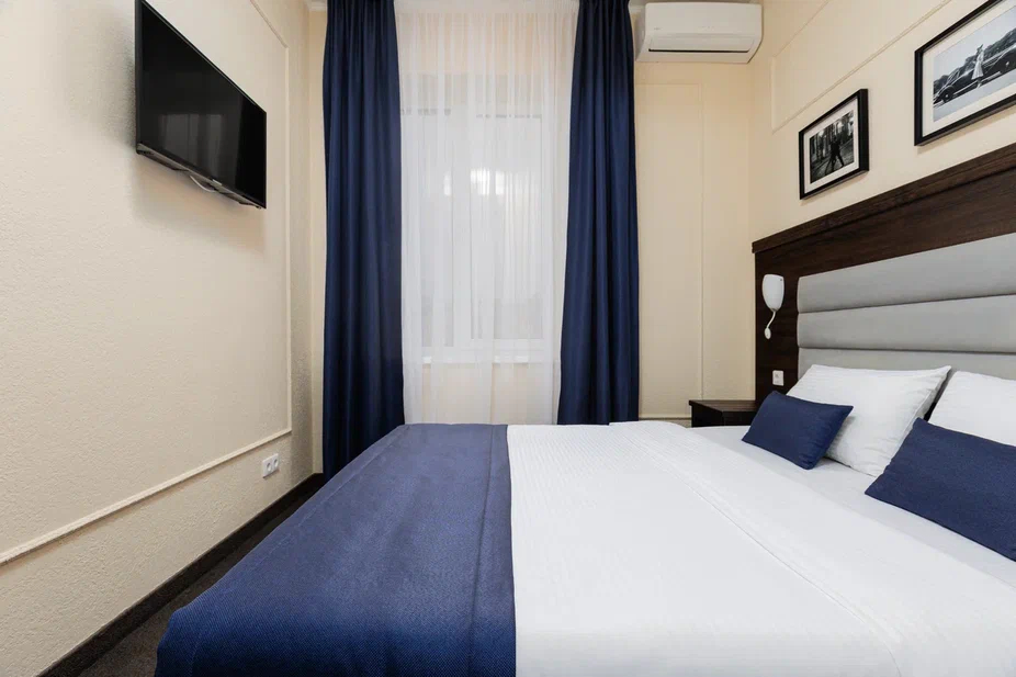 Площадь номера - 15 кв.м. 2 осн. места. Мебель: вешалка, зеркало, кровать двуспальная, прикроватные тумбочки, стол, стул, шкаф. Оборудование: гладильная доска, мини-холодильник, сейф, сплит-система, телевизор ЖК, утюг, электрочайник. Санузел: с душем, тапочки, туалетные принадлежности, фен, халат. Сервис: Wi-Fi бесплатно, смена полотенец (1 раз в 3 дня), смена постельного белья (1 раз в 3 дня), уборка номера (ежедневно).