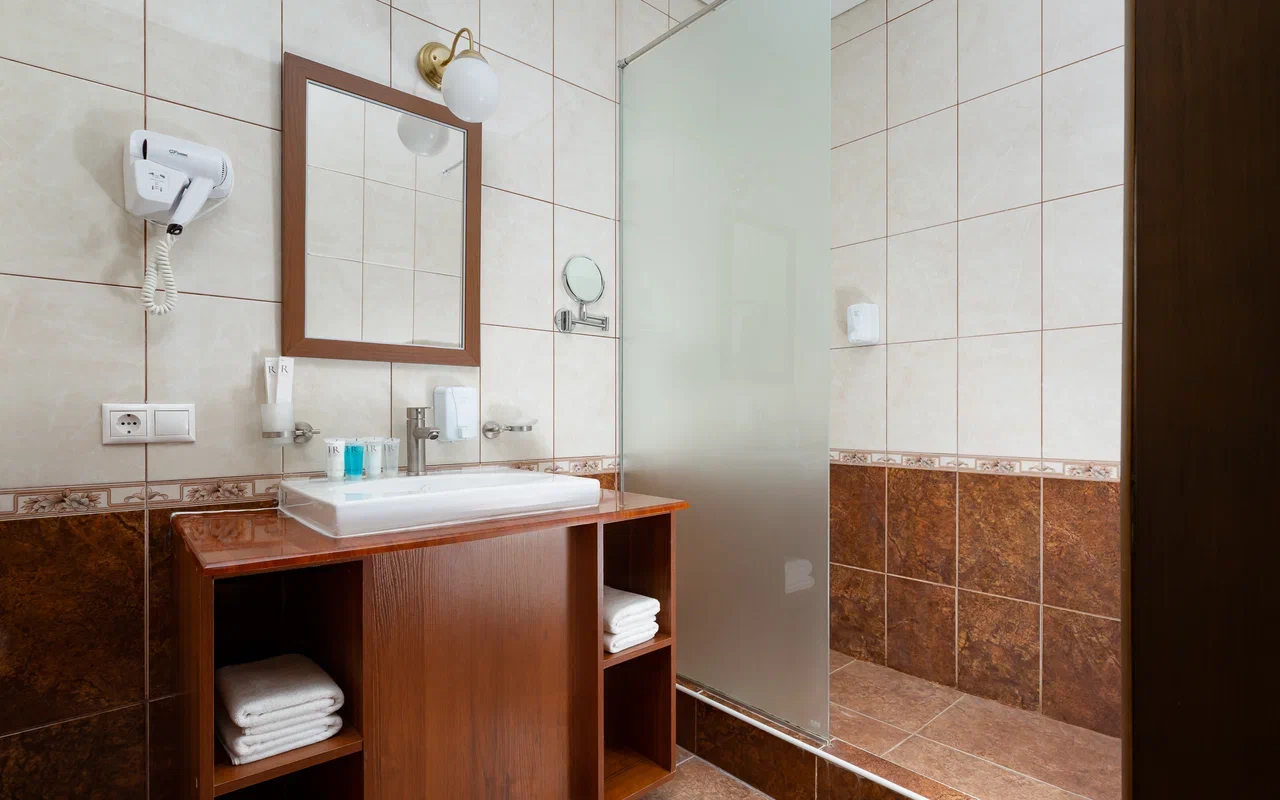 Площадь номера - 33 кв.м. 2 осн. места. 2 доп. места. Балкон. Мебель: вешалка, диван (или кресло-кровать), зеркало, кровать двуспальная, прикроватные тумбочки, стол, стул, шкаф. Оборудование: гладильная доска, мини-холодильник, сейф, сплит-система, телевизор ЖК, утюг, электрочайник. Санузел: с душем, тапочки, туалетные принадлежности, фен, халат. Сервис: Wi-Fi бесплатно, смена полотенец (1 раз в 3 дня), смена постельного белья (1 раз в 3 дня), уборка номера (ежедневно).