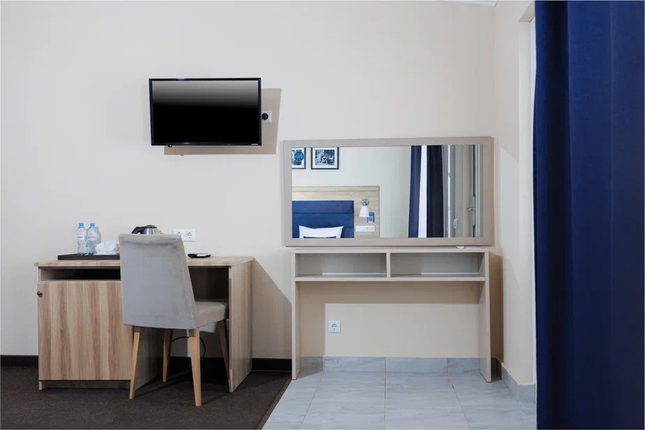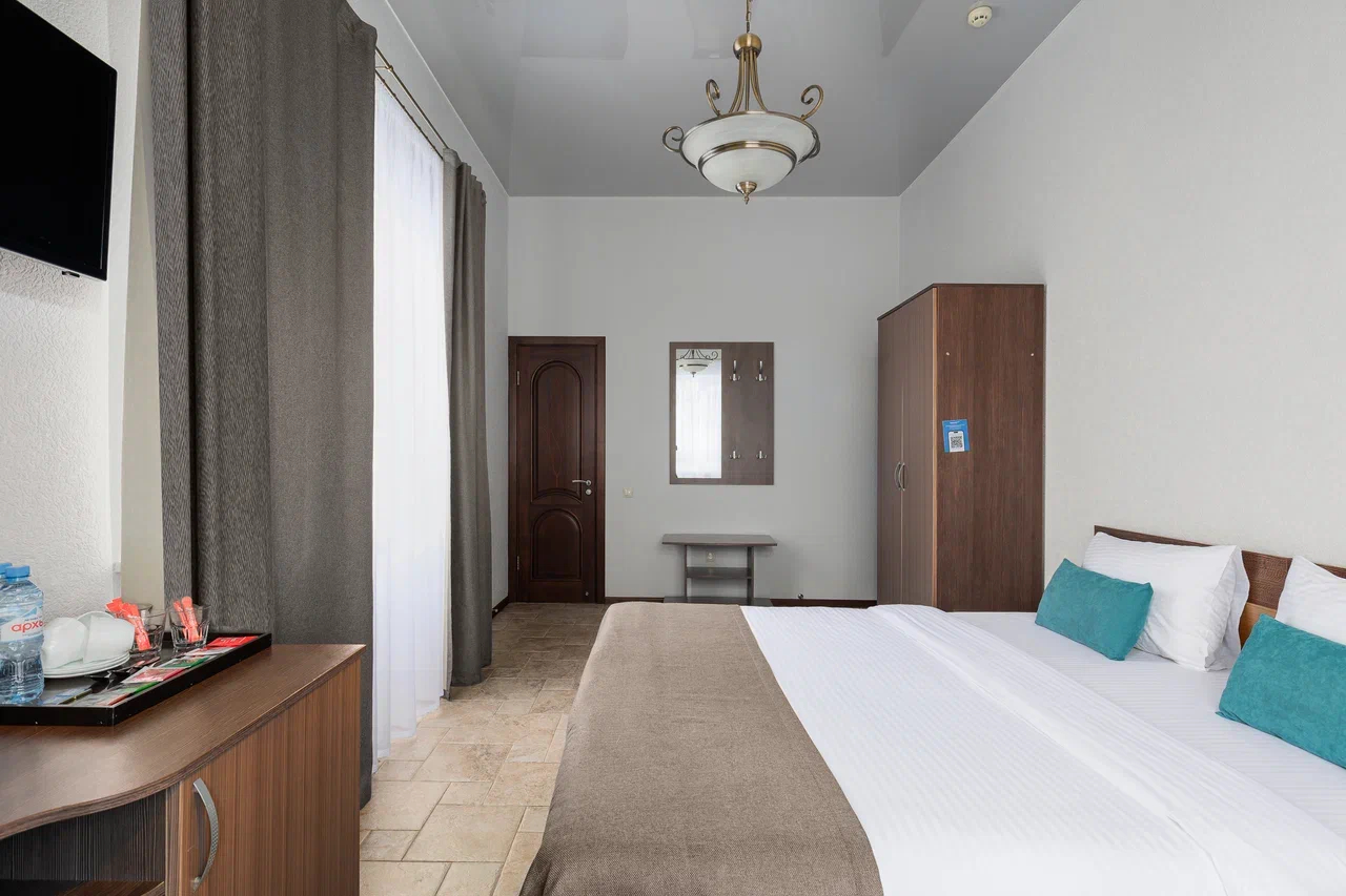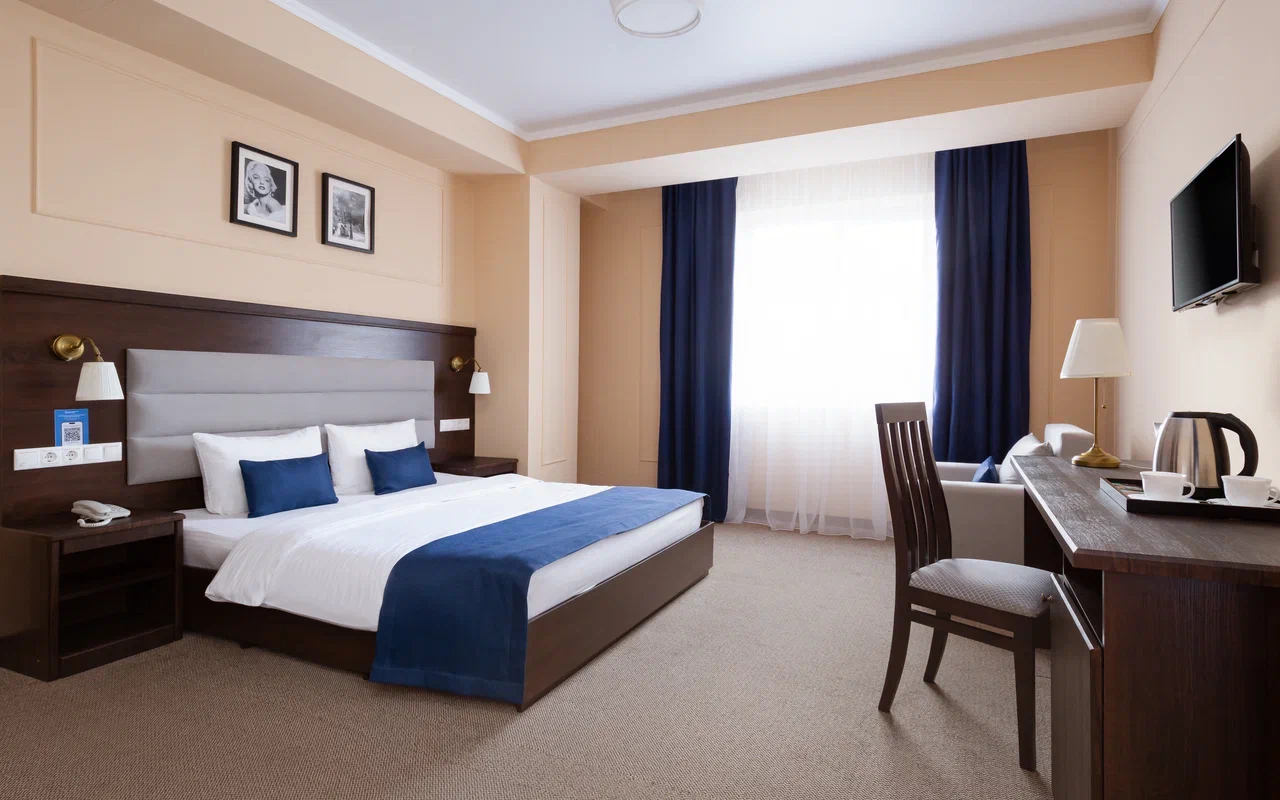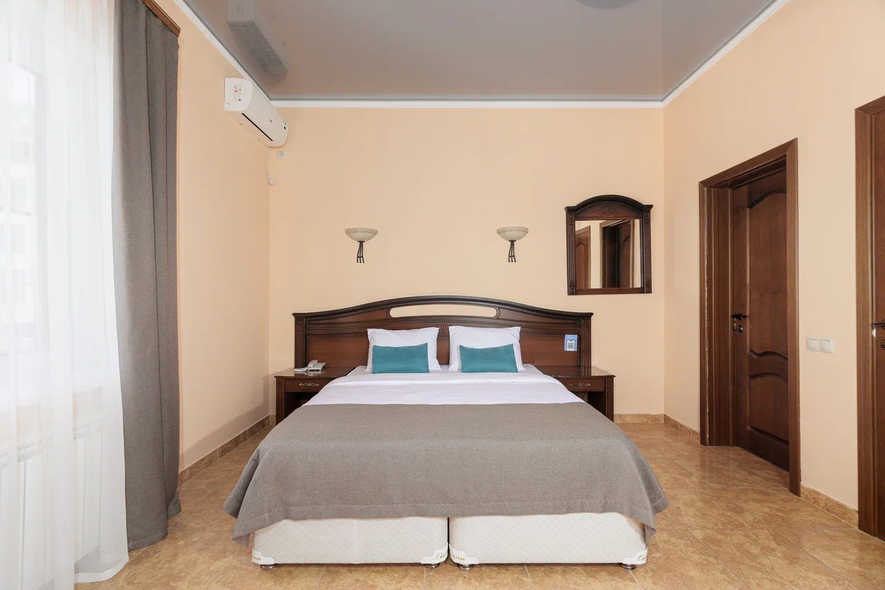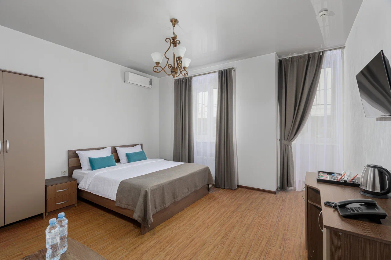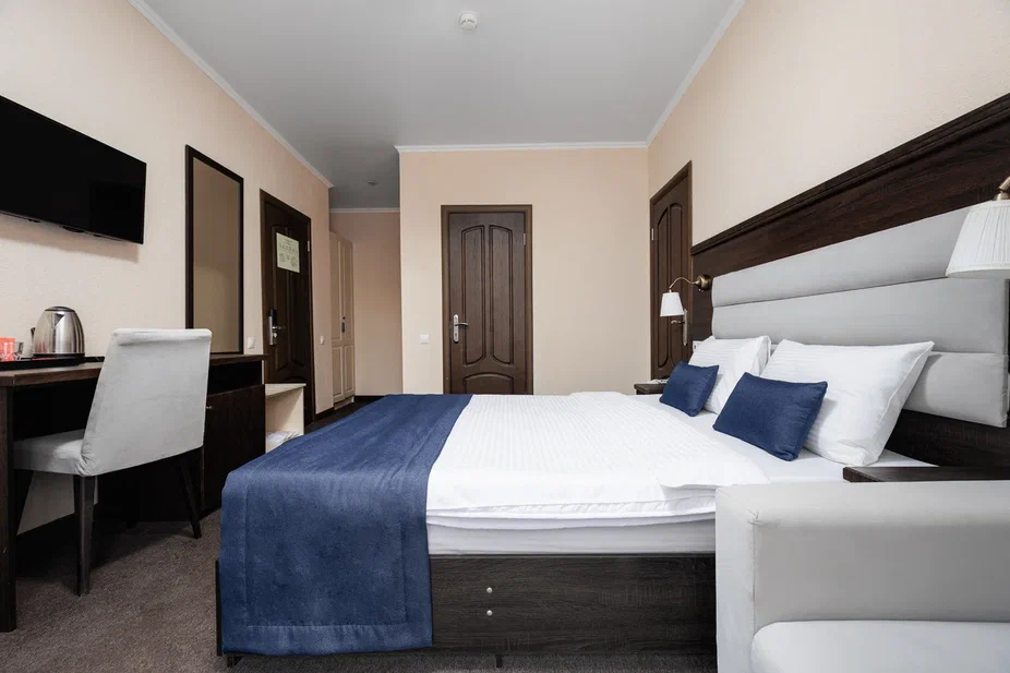 Площадь номера - 23 кв.м. 2 осн. места. 1 доп. место. Мебель: вешалка, зеркало, кровать двуспальная, прикроватные тумбочки, стол, стулья, шкаф. Оборудование: гладильная доска, мини-холодильник, сейф, сплит-система, телевизор ЖК, утюг, электрочайник. Санузел: с душем, тапочки, туалетные принадлежности, фен, халат. Сервис: Wi-Fi бесплатно, смена полотенец (1 раз в 3 дня), смена постельного белья (1 раз в 3 дня), уборка номера (ежедневно).