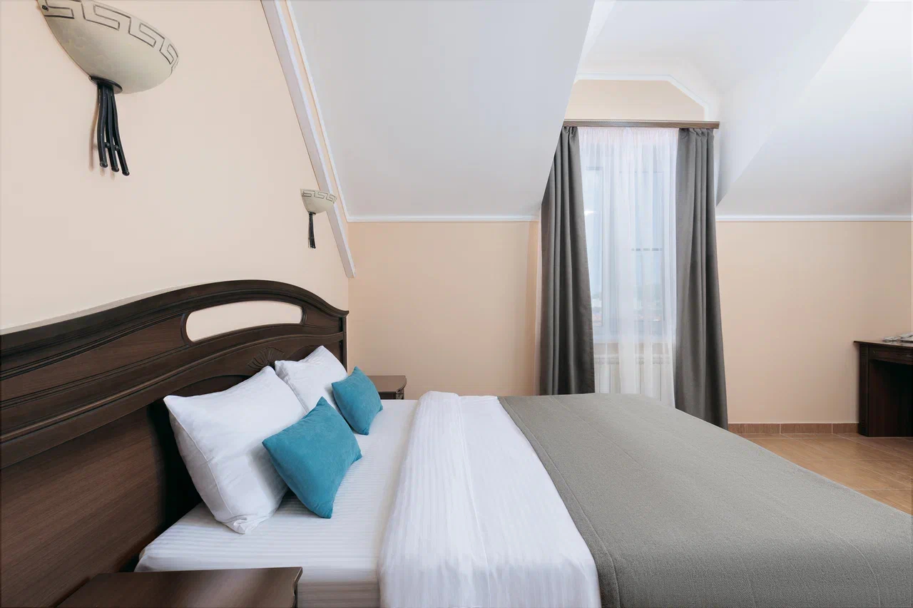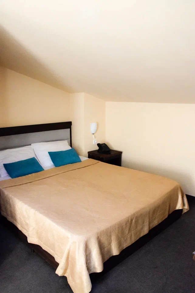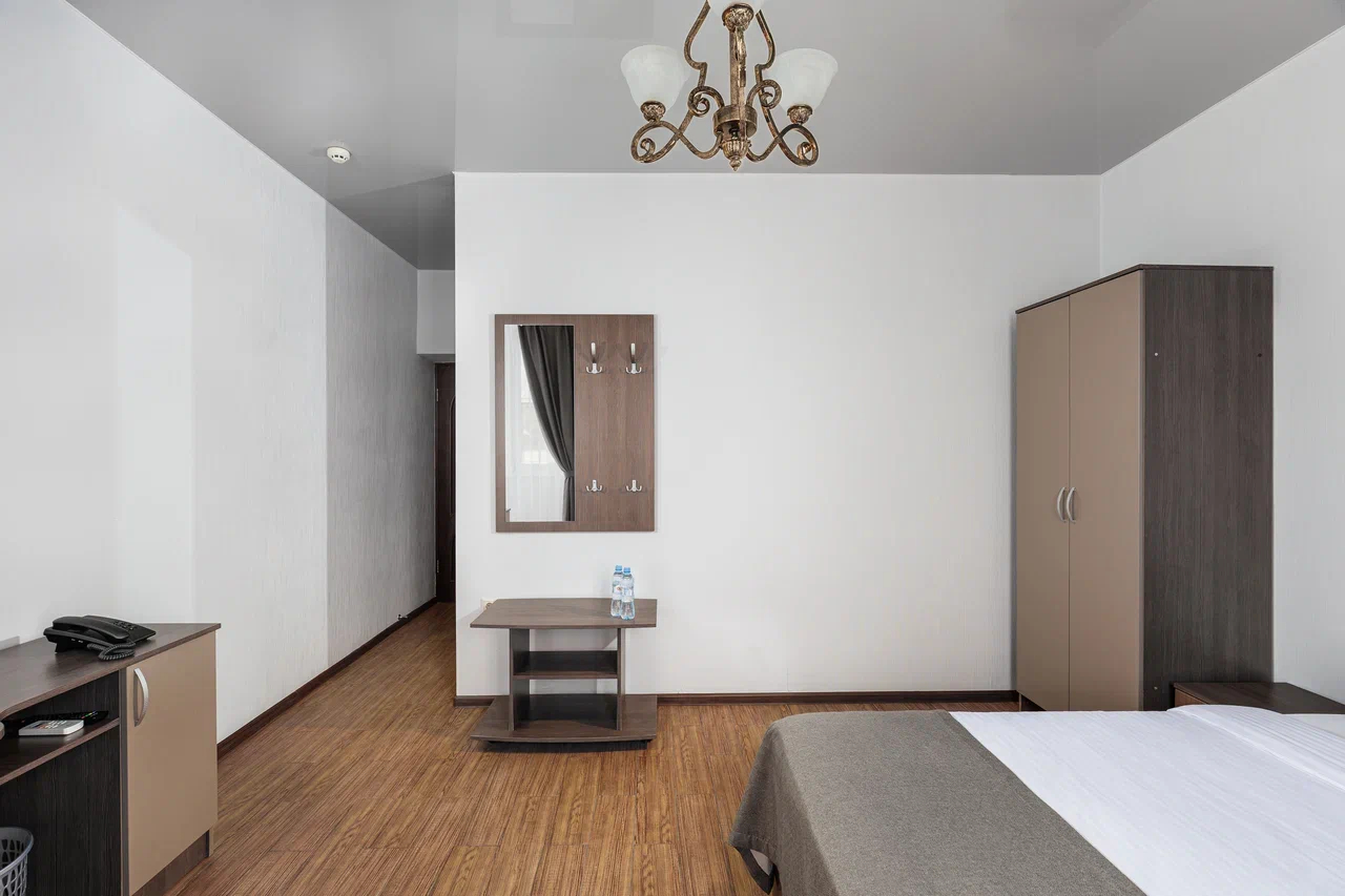 Площадь номера - 15 кв.м. 2 осн. места. 1 доп. место. Мебель: вешалка, зеркало, кровать двуспальная, прикроватные тумбочки, стол, стулья, шкаф. Оборудование: гладильная доска, мини-холодильник, сейф, сплит-система, телевизор ЖК, утюг, электрочайник. Санузел: с душем, тапочки, туалетные принадлежности, фен, халат. Сервис: Wi-Fi бесплатно, смена полотенец (1 раз в 3 дня), смена постельного белья (1 раз в 3 дня), уборка номера (ежедневно).