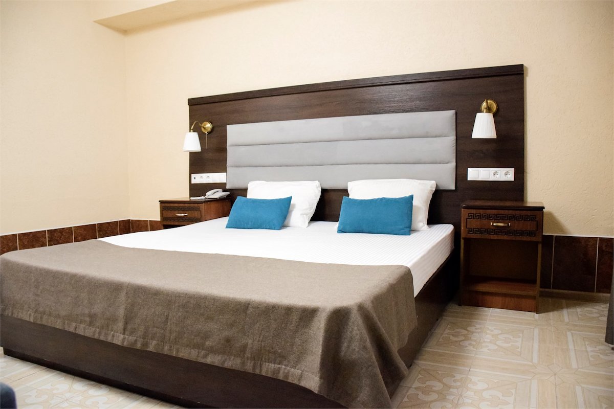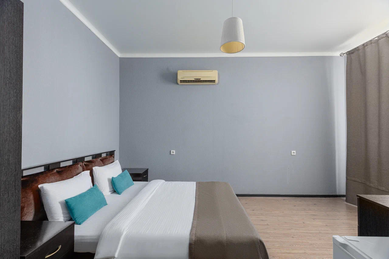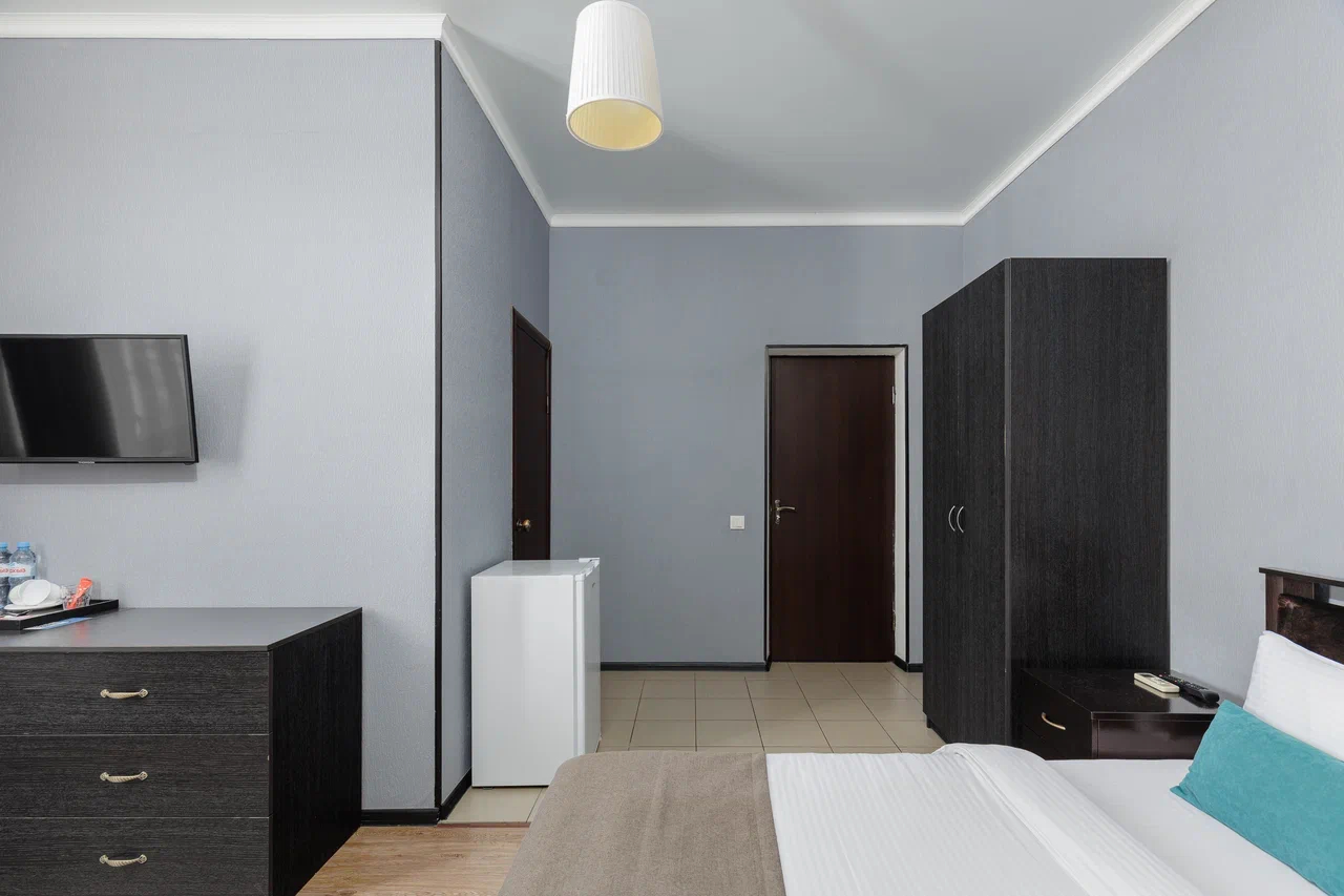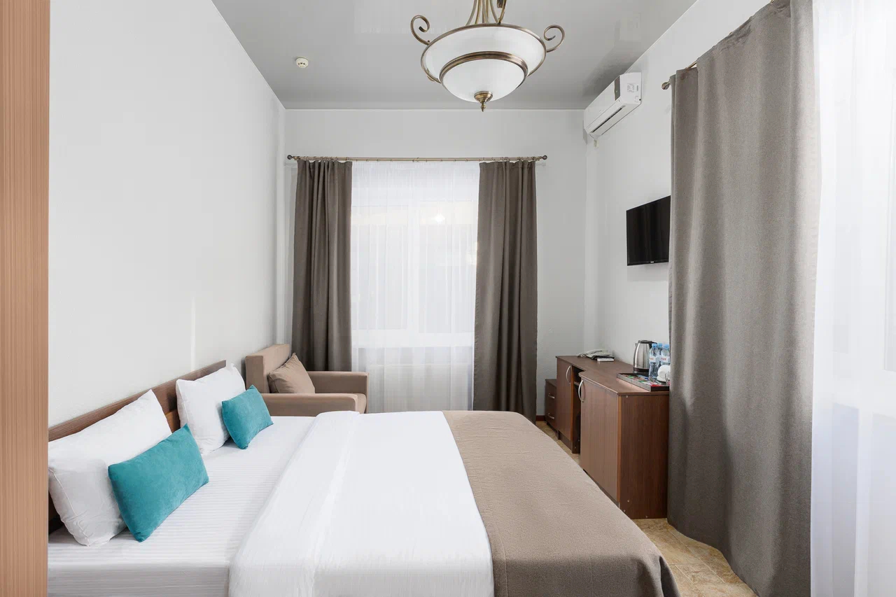 Площадь номера - 12 кв.м. 2 осн. места. Мебель: вешалка, зеркало, кровать двуспальная, прикроватные тумбочки, стол, стулья, шкаф. Оборудование: гладильная доска, мини-холодильник, сейф, сплит-система, телевизор ЖК, утюг, электрочайник. Санузел: с душем, тапочки, туалетные принадлежности, фен, халат. Сервис: Wi-Fi бесплатно, смена полотенец (1 раз в 3 дня), смена постельного белья (1 раз в 3 дня), уборка номера (ежедневно).