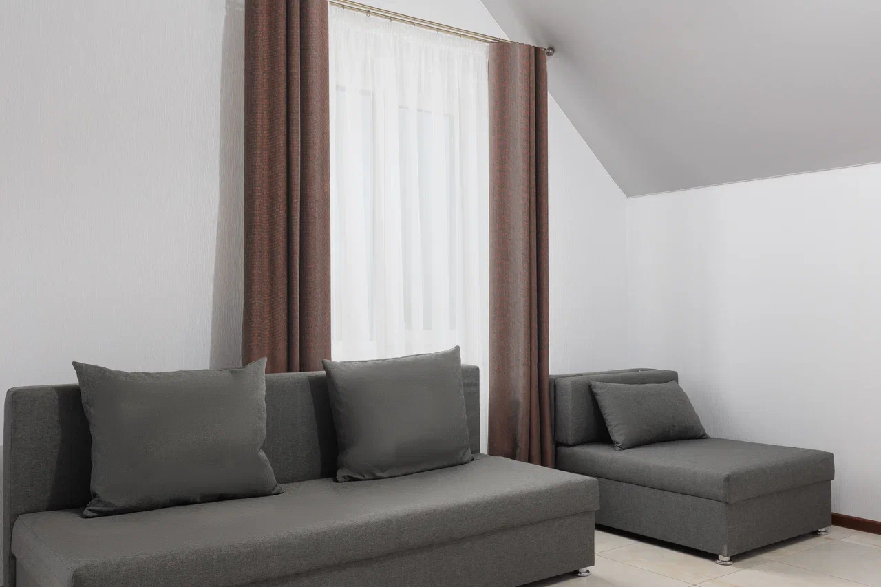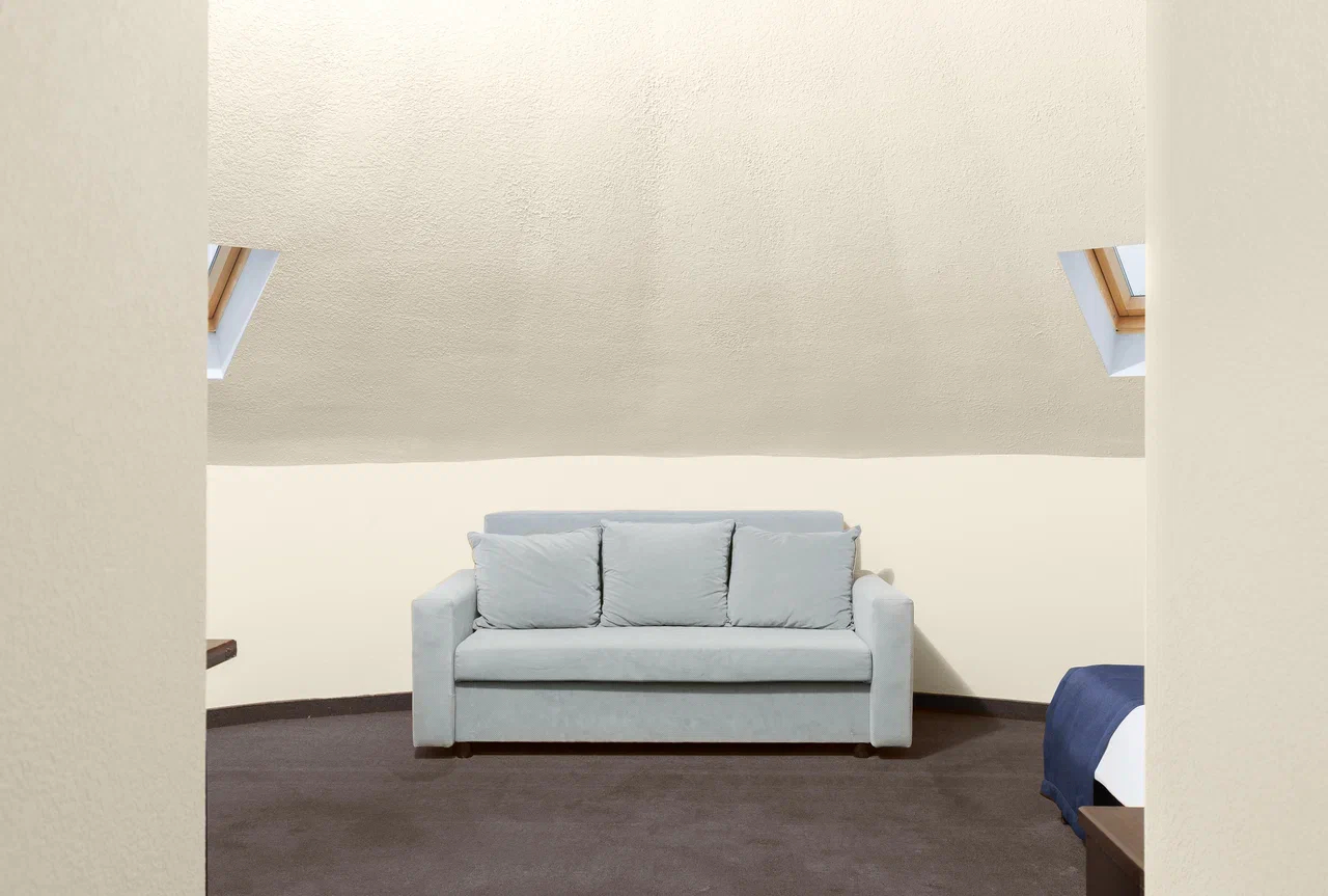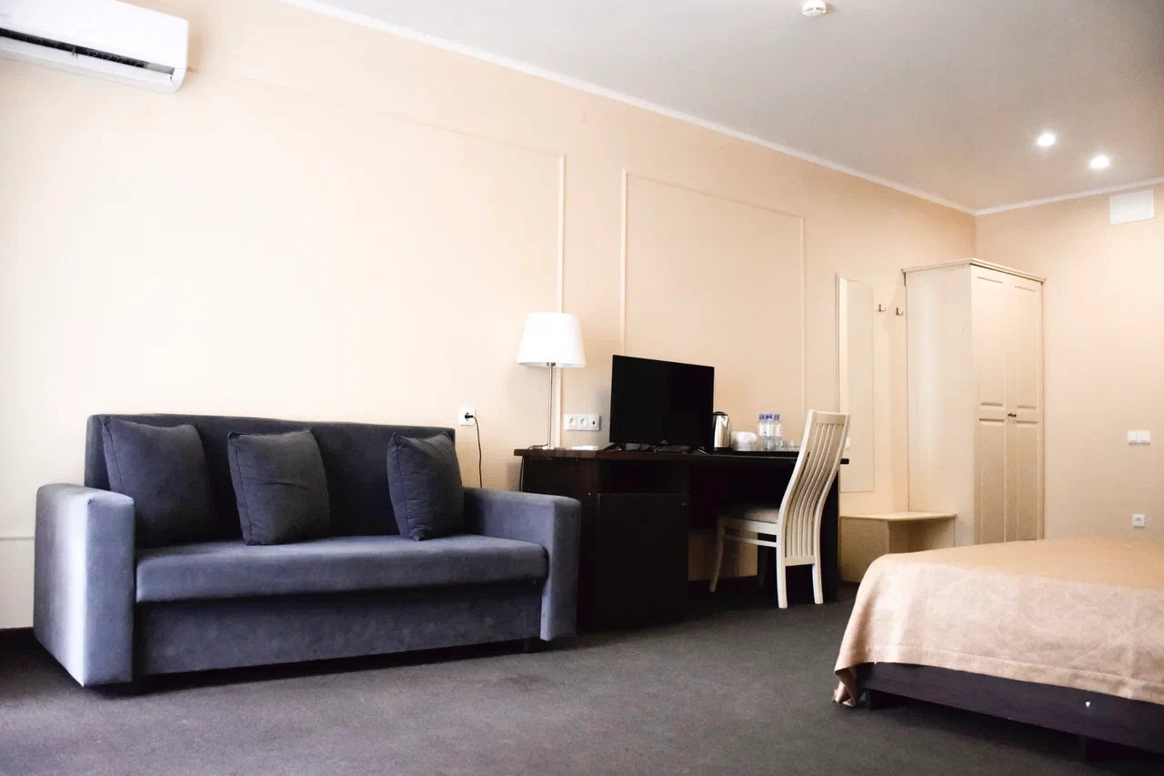 Площадь номера - 36 кв.м. 2 осн. места. 2 доп. места. Мебель: вешалка, диван, кровать двуспальная, прикроватные тумбочки, стол, стул, шкаф. Оборудование: гладильная доска, мини-холодильник, сейф, сплит-система, телевизор, утюг, электрочайник. Санузел: с душем, тапочки, туалетные принадлежности, фен, халат. Сервис: Wi-Fi бесплатно, смена полотенец (1 раз в 3 дня), смена постельного белья (1 раз в 3 дня), уборка номера (ежедневно).