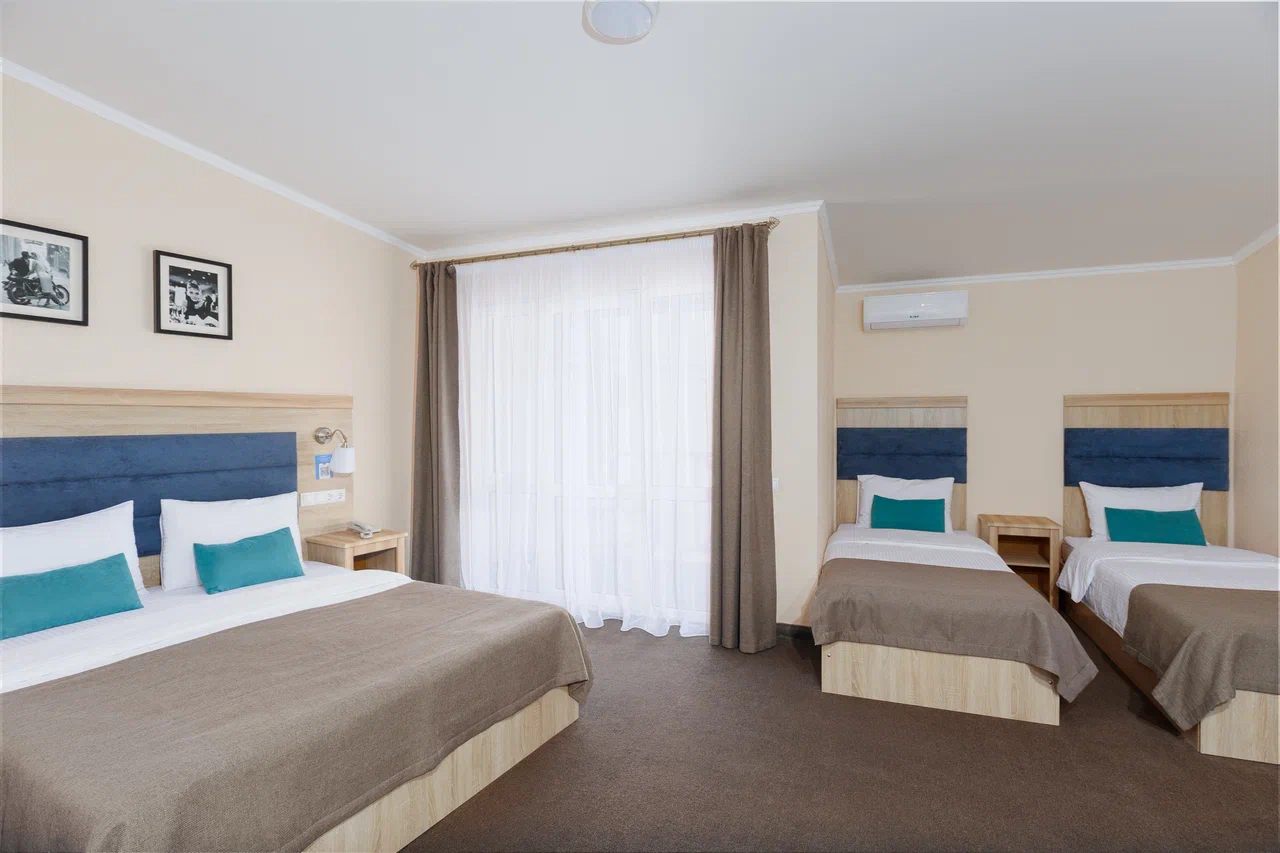 4 осн. места. Балкон. Мебель: вешалка, зеркало, кровати односпальные, кровать двуспальная, прикроватные тумбочки, стол, стулья, шкаф. Оборудование: гладильная доска, мини-холодильник, сейф, сплит-система, телевизор ЖК, утюг, электрочайник. Санузел: с душем, тапочки, туалетные принадлежности, фен, халат. Сервис: Wi-Fi бесплатно, смена полотенец (1 раз в 3 дня), смена постельного белья (1 раз в 3 дня), уборка номера (ежедневно).