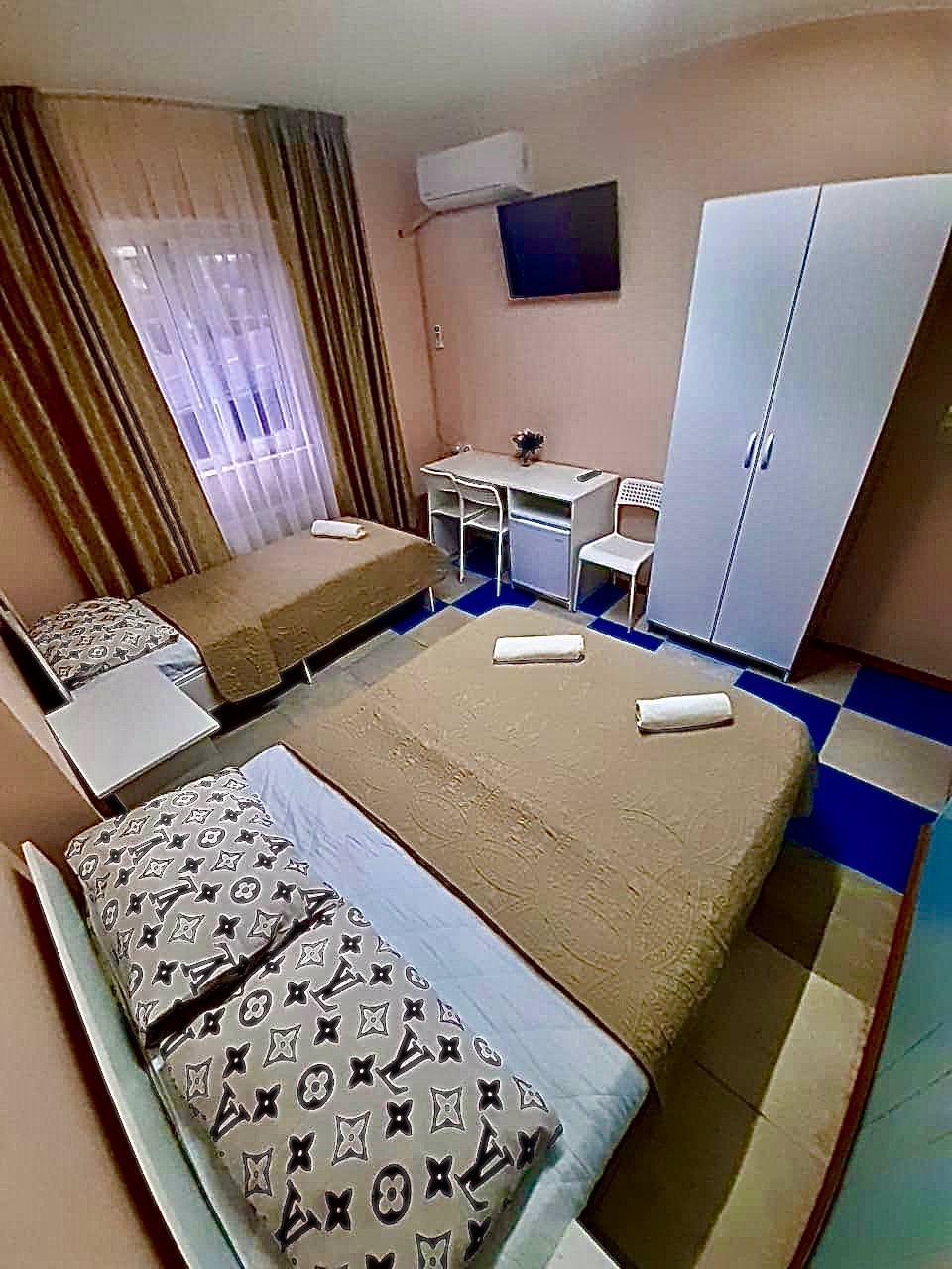 Трехместная комната комфорт общей площадью 16 кв.м. Оснащение: двухспальная кровать, односпальная кровать, телевизор, кондиционер, холодильник, шкаф, стол, ванная комната с душем.
