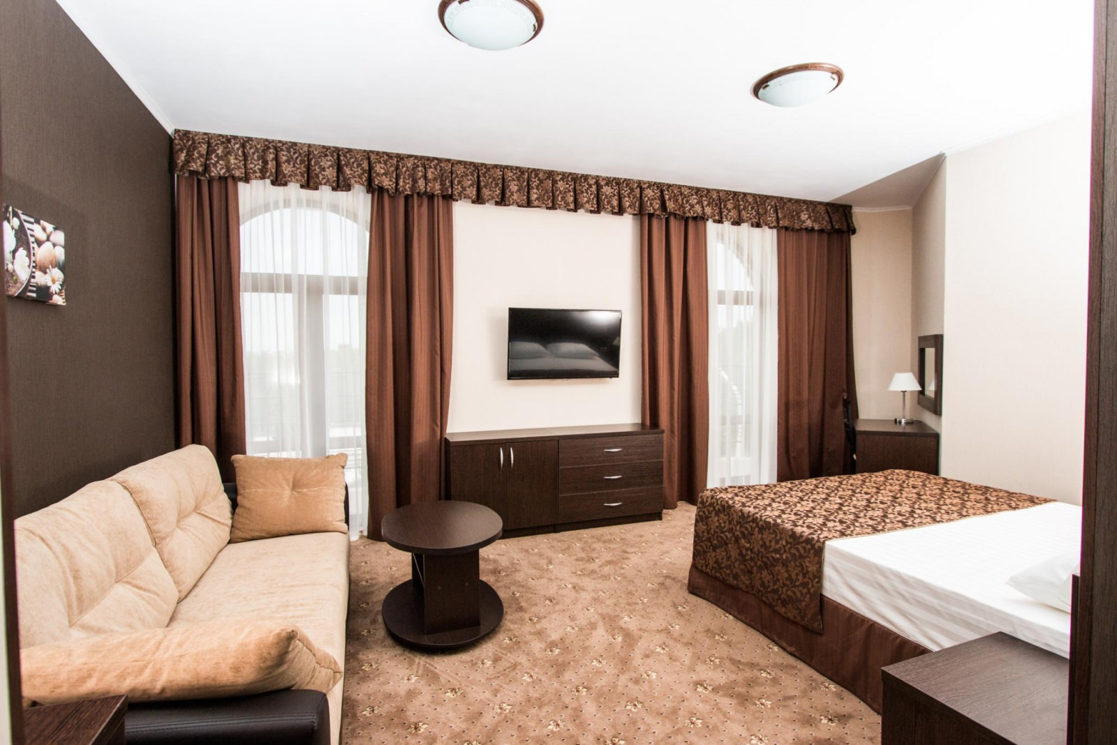 Номер категории "Полулюкс" это однокомнатный номер площадью 26 кв.м. с совмещенный гостинной и спальной зоной, отдельным санузлом. В номере двуспальная кровать, 2 прикроватные тумбы, ЖК ТВ, комод, тумба общего назначения, стол письменный с зеркалом, тумба под холодильник со встроенным минибаром, диван-кровать, журнальный стол, шкаф для одежды, багажная тумба, прихожая с зеркалом. В номере своя система климат-контроля, большой балкон с видом на море.