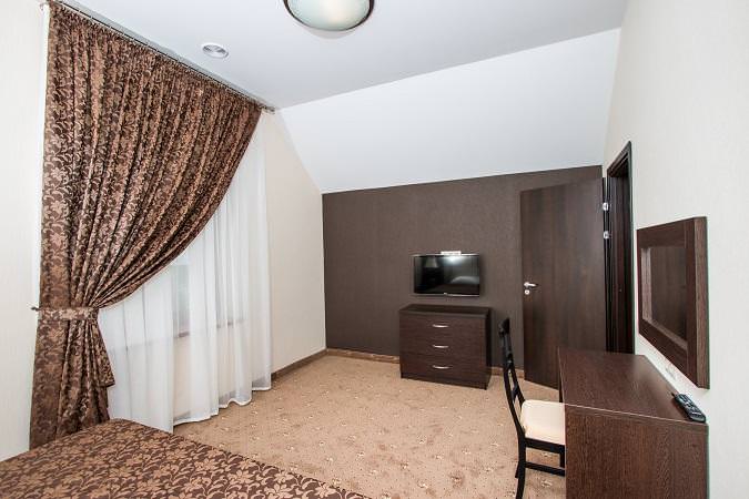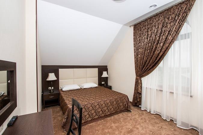 Номер стандарт на цокольном этаже это однокомнатный номер площадью 18 кв.мв цокольном этаже с небольшим окном. На полу плитка. В номере двуспальная кровать, либо 2 односпальные кровати, 2 прикроватные тумбы, ЖК ТВ., письменный/туалетный стол с зеркалом и тумбой под холодильник, мини-холодильник, небольшой прикроватный столик, шкаф для одежды, багажная тумба, прихожая с зеркалом. В санузле имеется душ. Все номера категории "стандарт" оборудованы центральной системой климат-контроля.
