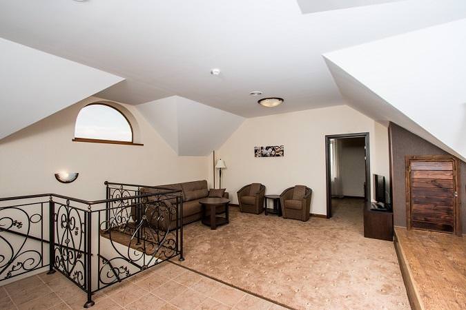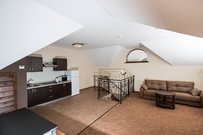 Номер категории "Апартаменты" это двухуровневый номер площадью 74 кв.м. с кухонной зоной, отдельной гостиной и спальней. На первом уровне расположена прихожая с гардеробом и большой санузел с ванной и встроенной стиральной машиной. На втором уровне расположены 2 комнаты: гостиная и спальня. В гостиной полноценная кухонная зона (встроенная варочная плита, холодильник, вытяжка, мойка, микроволновая печь, чайник), обеденый стол, два кресла, диван-кровать, 2 журнальных столика, ЖК ТВ., из окна открывается прекрасный вид на море. Спальня с большой двуспальной кроватью и мягким изголовьем, 2 прикроватные тумбы, комод, стол с зеркалом, отдельный ЖК ТВ. Номер оборудован отдельной системой климат-контроля.
