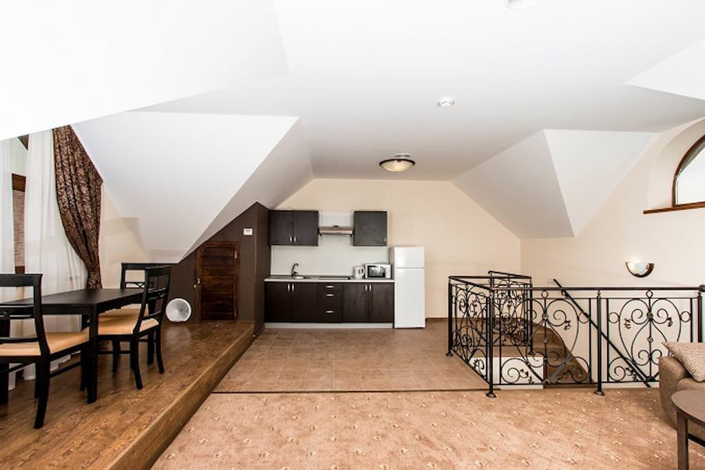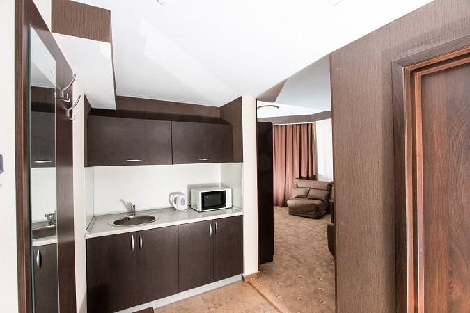 Номера категории "люкс с мини-кухней" представляют собой двухкомнатные номера площадью 47 кв.м. с прихожей и небольшой встроенной кухонной зоной (мойка, холодильник, микроволновая печь, чайник). Также в номерах имеется 2 отдельных балкона, в каждой комнате отдельный ЖК ТВ. Количество спальных мест: 2 ( 3).