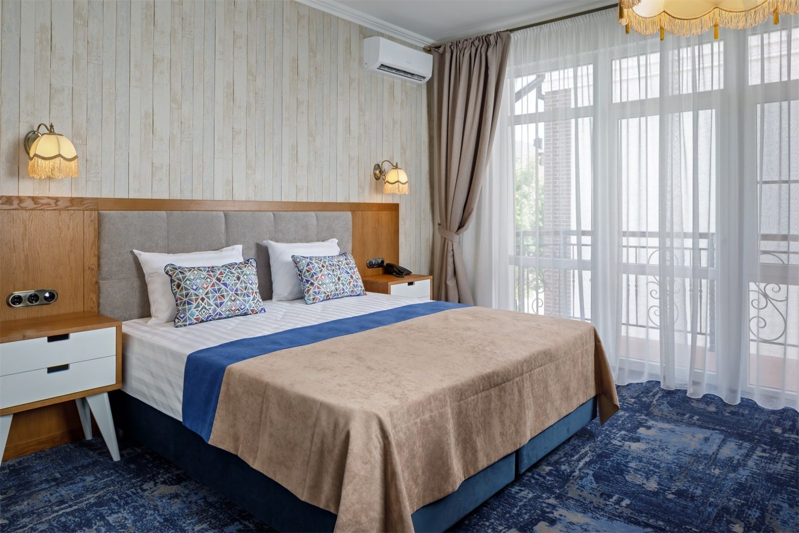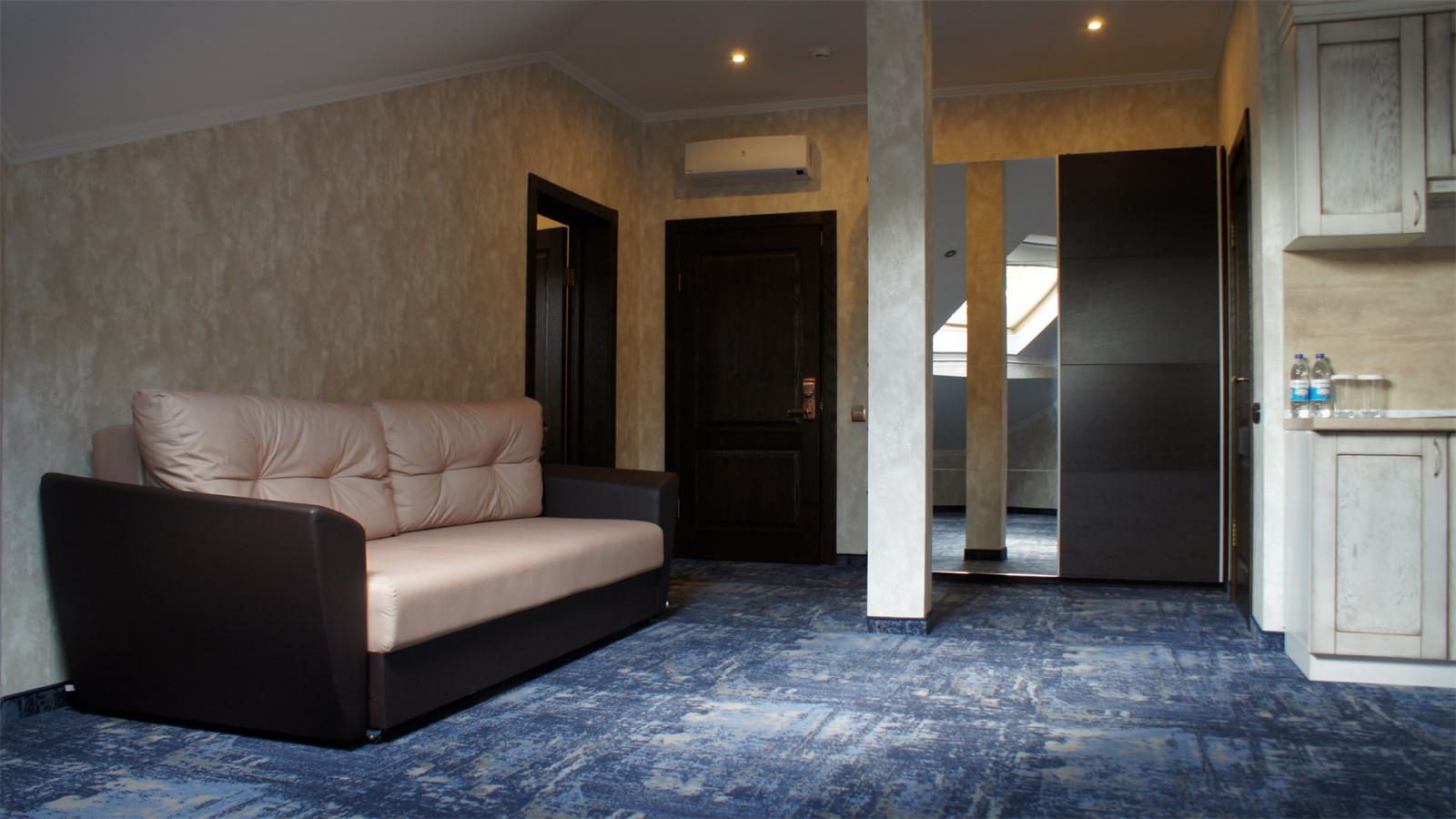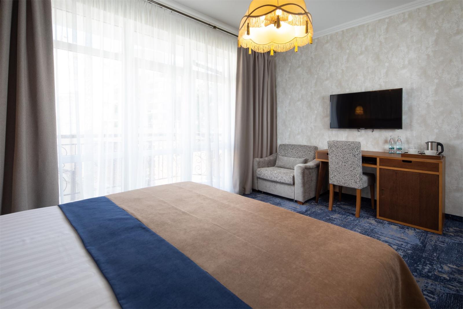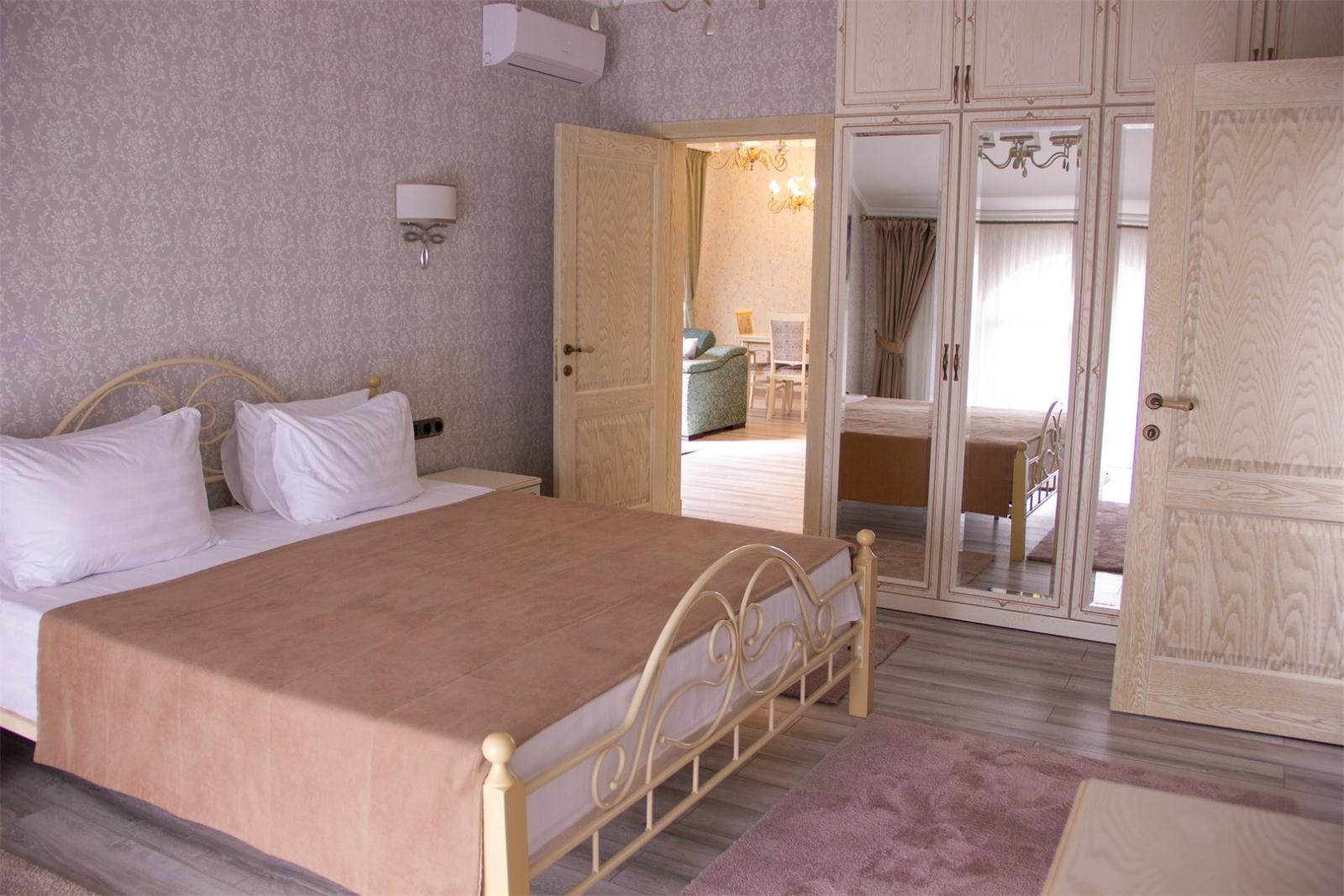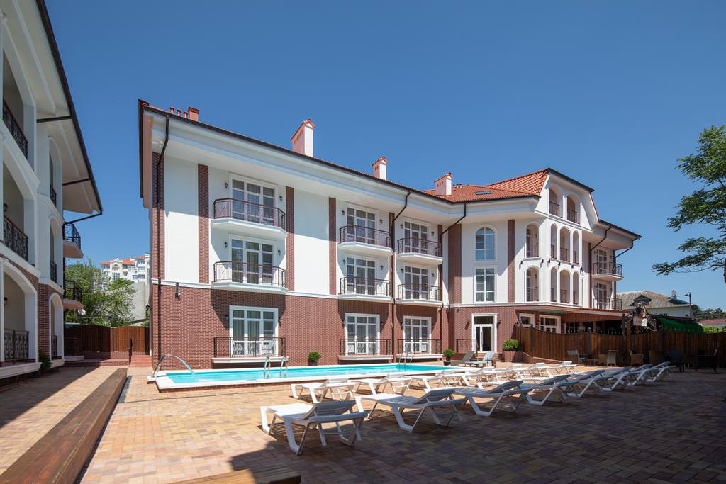 Трехэтажные жилые корпуса с мансардами разместились на благоустроенной закрытой территории гостиничного комплекса. Отель предлагает отдыхающим девять категорий номеров, способных вместить до 162 человек. Светлые номера в стиле прованс оснащены современной техникой и укомплектованы удобным мебельным гарнитуром с прикроватными тумбочками и шкафом-купе, в ванных комнатах гостей ожидают косметические принадлежности, тапочки, фен.