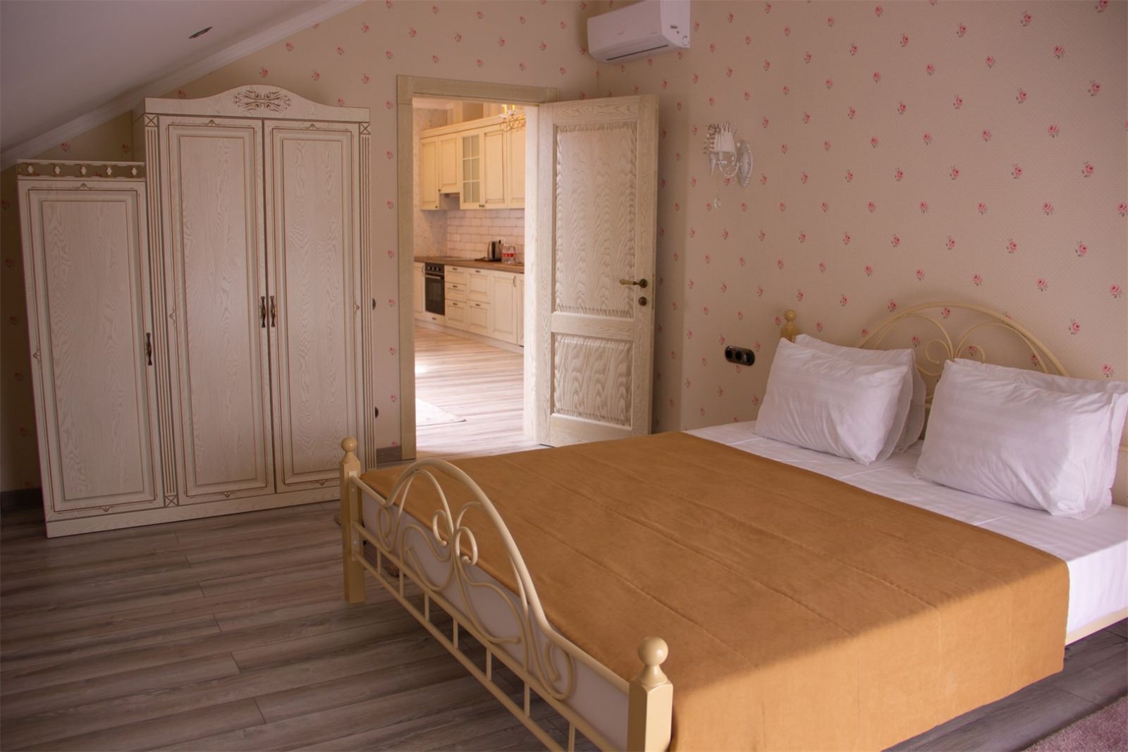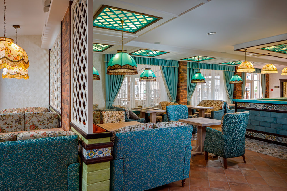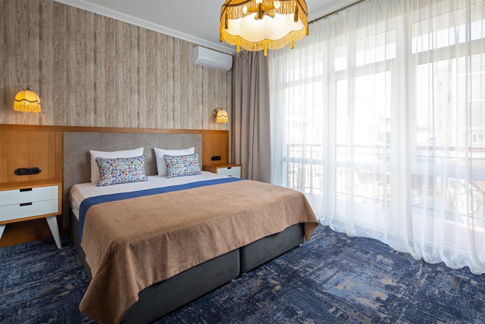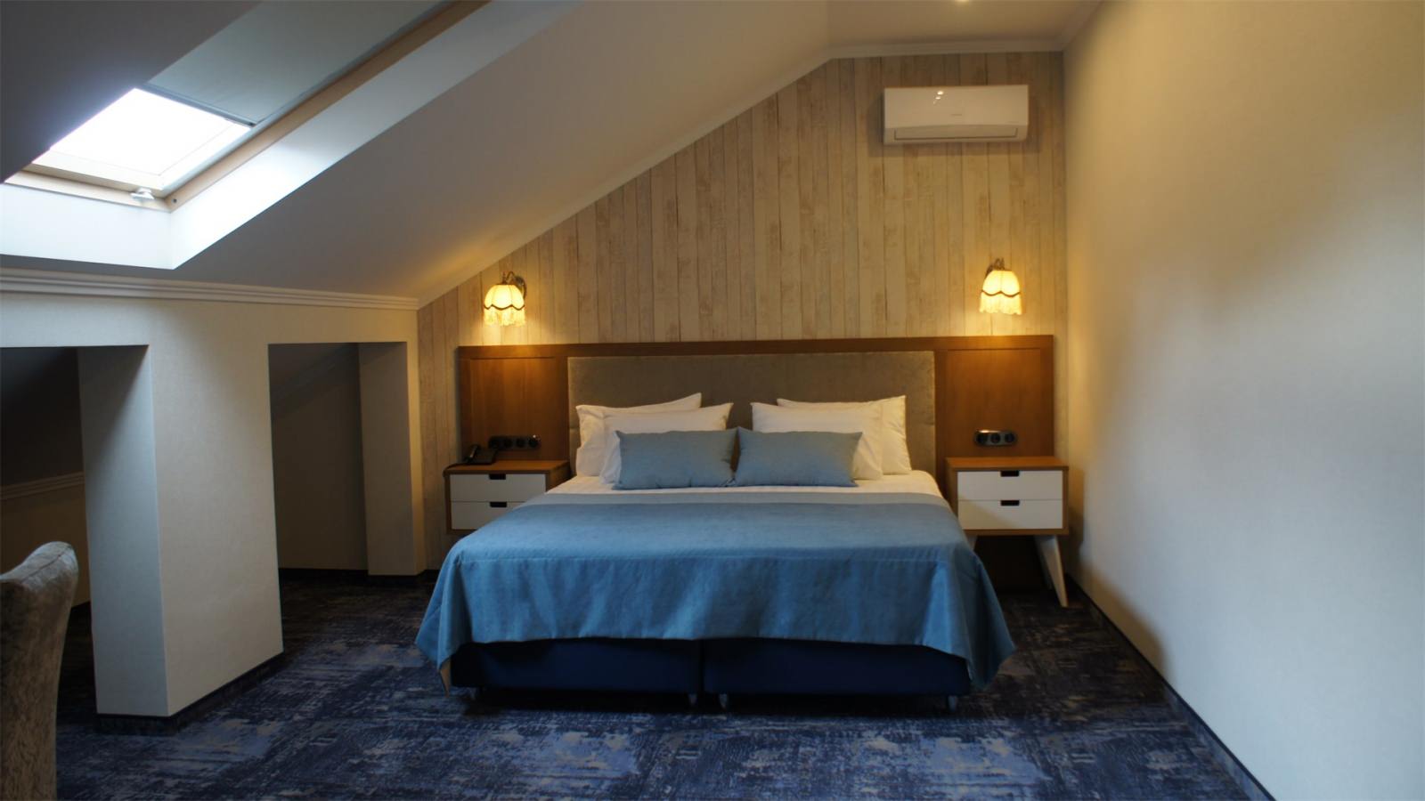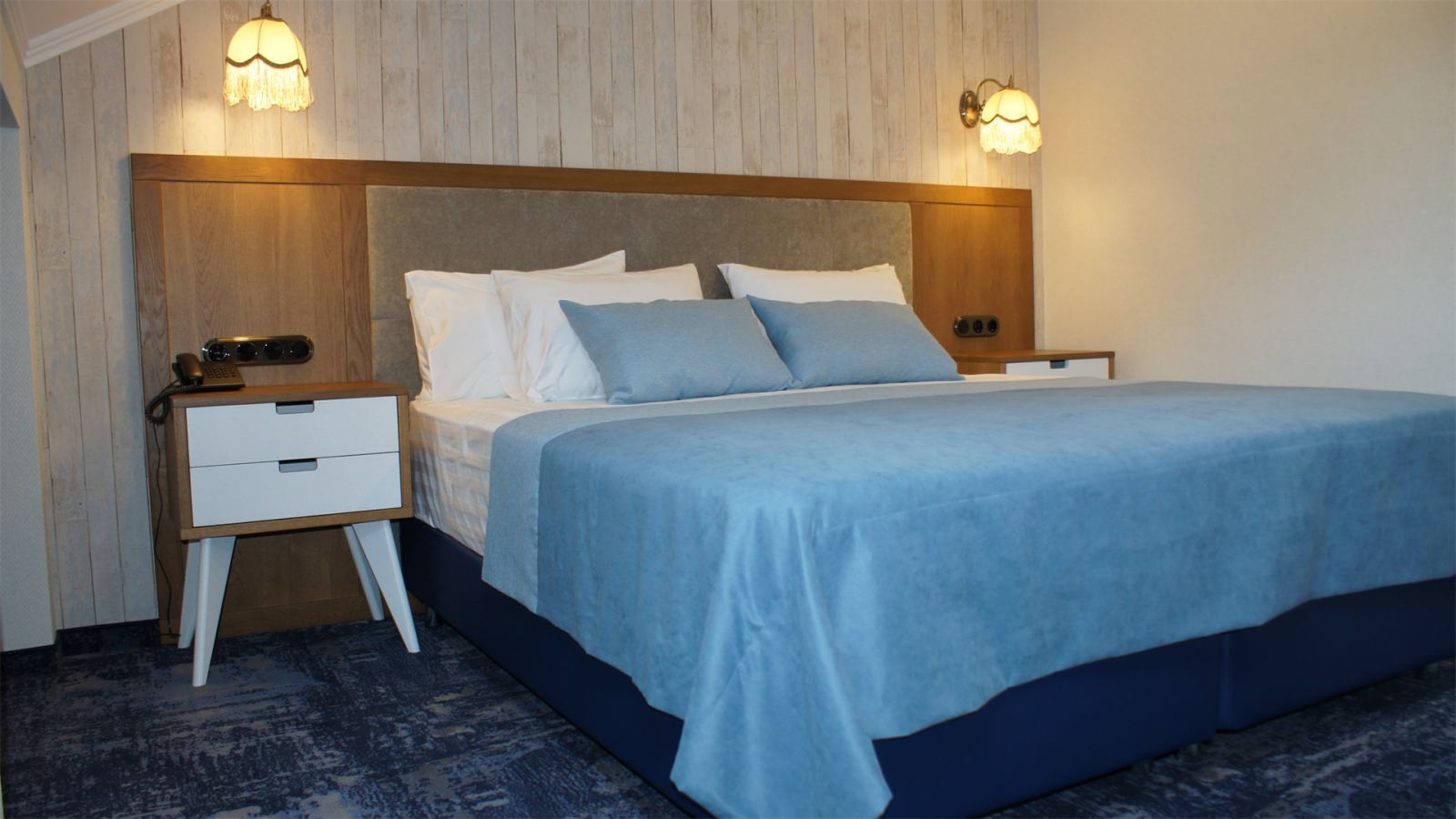 Трехэтажные жилые корпуса с мансардами разместились на благоустроенной закрытой территории гостиничного комплекса. Отель предлагает отдыхающим девять категорий номеров, способных вместить до 162 человек. Светлые номера в стиле прованс оснащены современной техникой и укомплектованы удобным мебельным гарнитуром с прикроватными тумбочками и шкафом-купе, в ванных комнатах гостей ожидают косметические принадлежности, тапочки, фен.