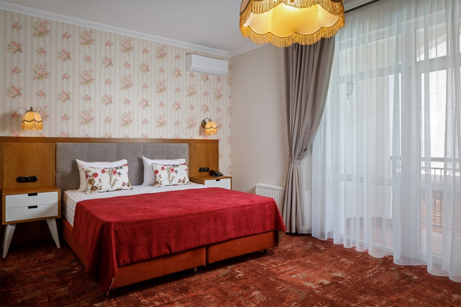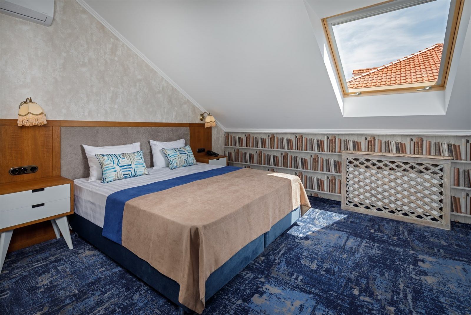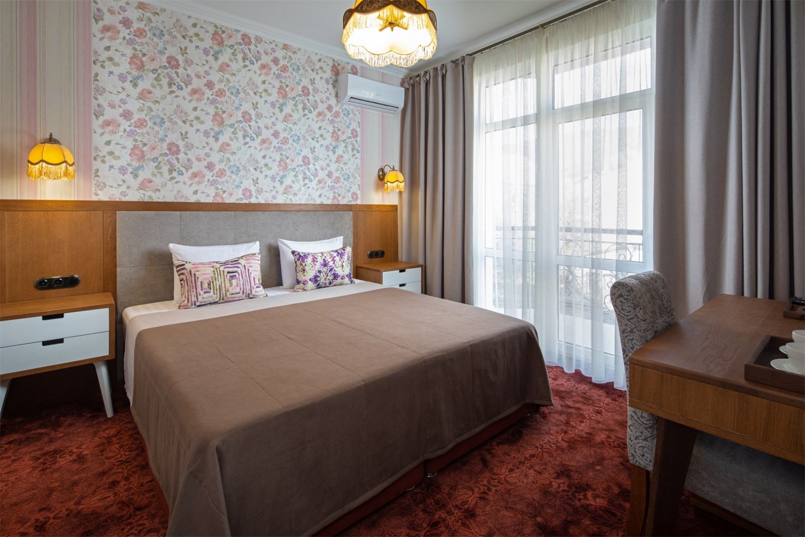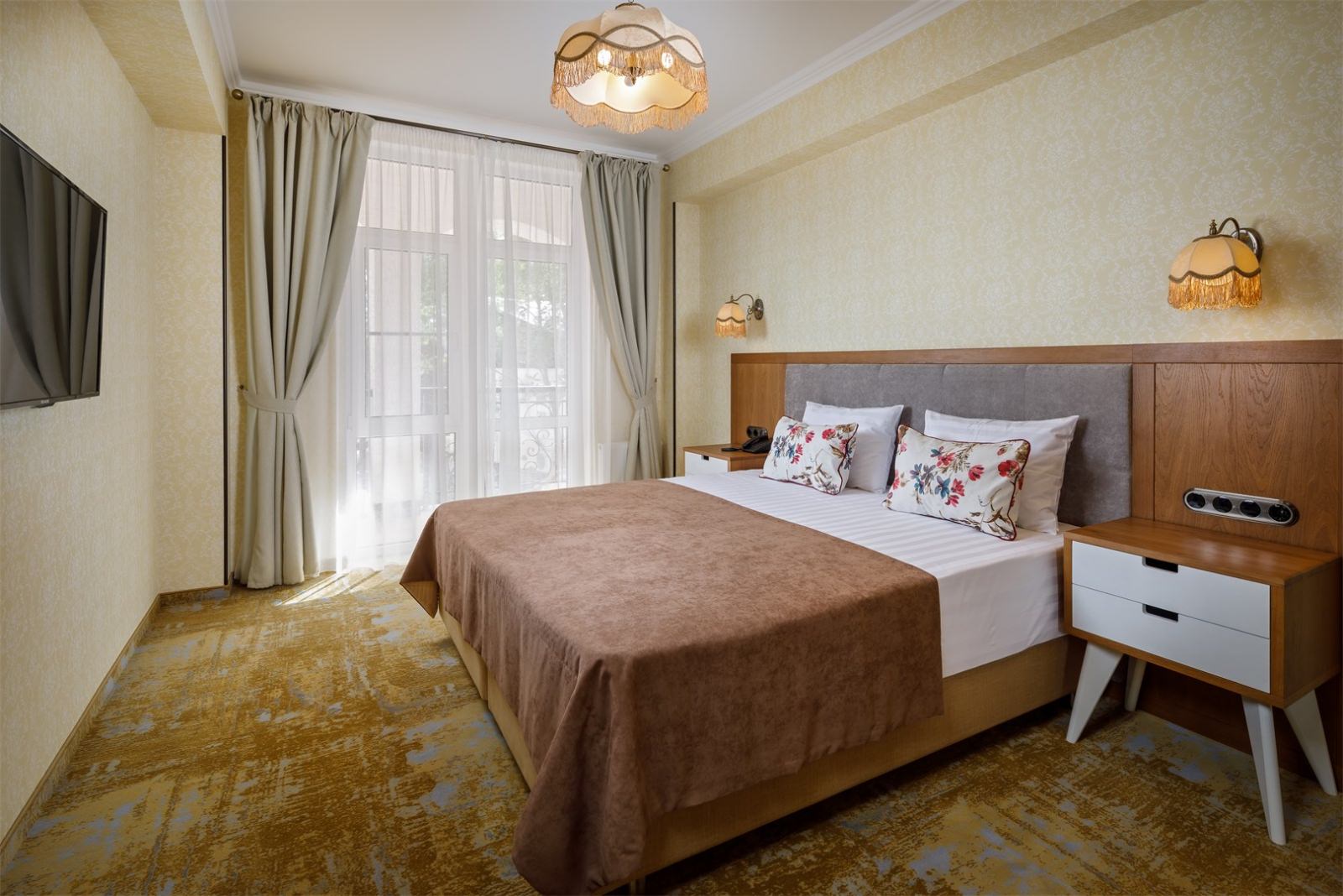 Трехэтажные жилые корпуса с мансардами разместились на благоустроенной закрытой территории гостиничного комплекса. Отель предлагает отдыхающим девять категорий номеров, способных вместить до 162 человек. Светлые номера в стиле прованс оснащены современной техникой и укомплектованы удобным мебельным гарнитуром с прикроватными тумбочками и шкафом-купе, в ванных комнатах гостей ожидают косметические принадлежности, тапочки, фен.