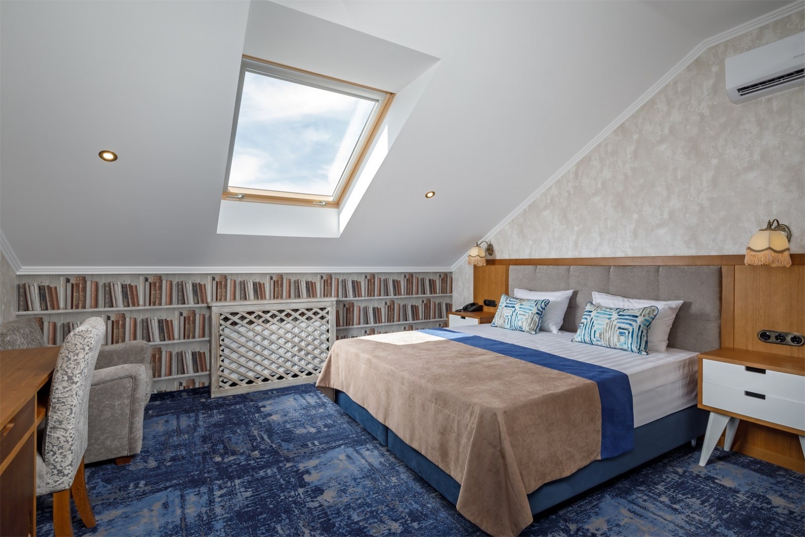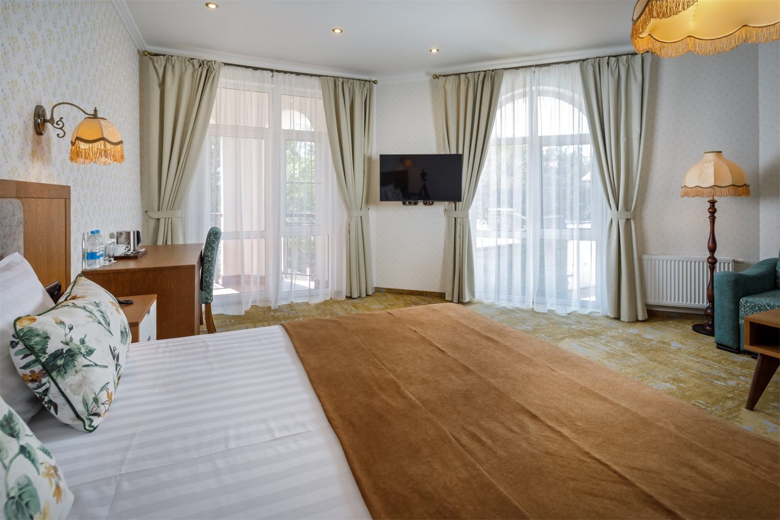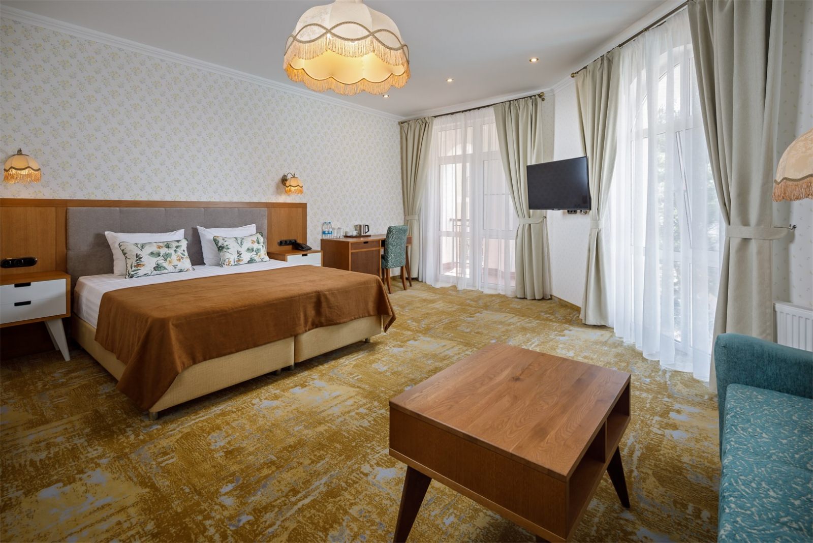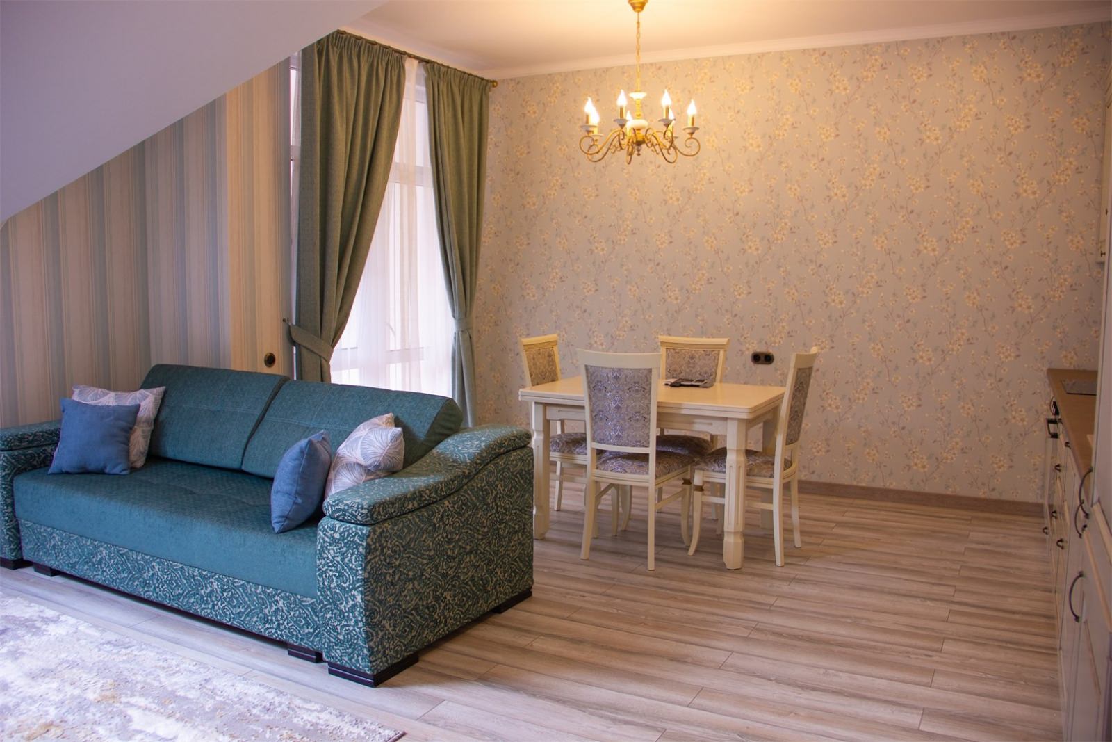 Трехэтажные жилые корпуса с мансардами разместились на благоустроенной закрытой территории гостиничного комплекса. Отель предлагает отдыхающим девять категорий номеров, способных вместить до 162 человек. Светлые номера в стиле прованс оснащены современной техникой и укомплектованы удобным мебельным гарнитуром с прикроватными тумбочками и шкафом-купе, в ванных комнатах гостей ожидают косметические принадлежности, тапочки, фен.