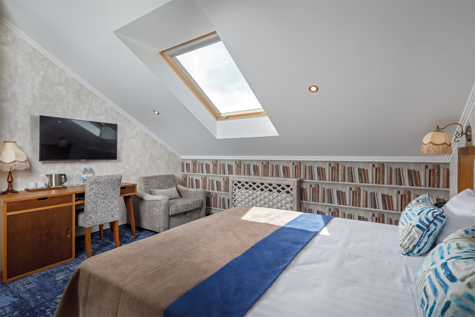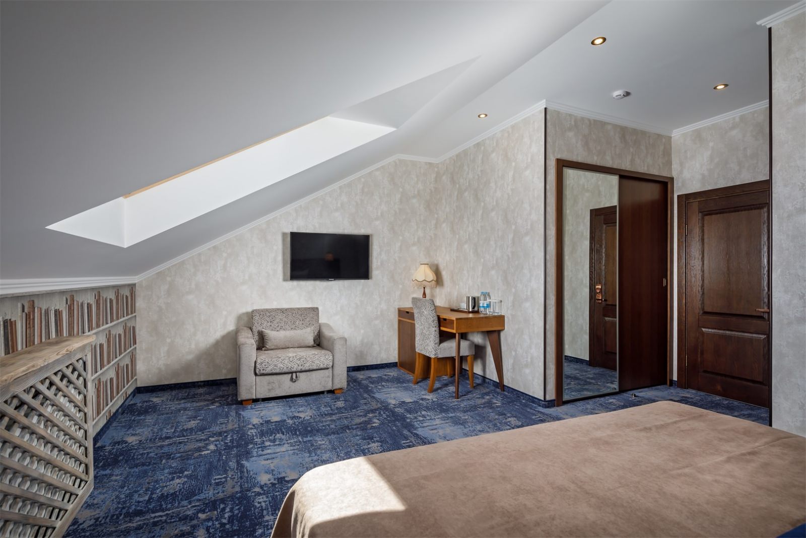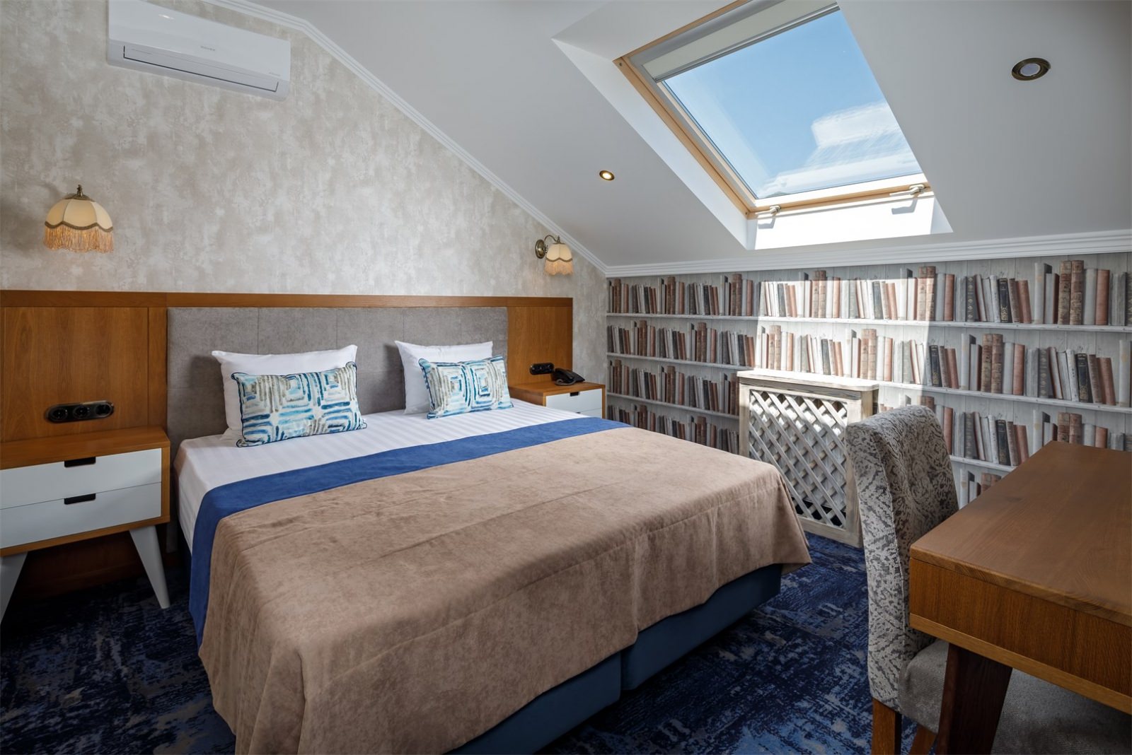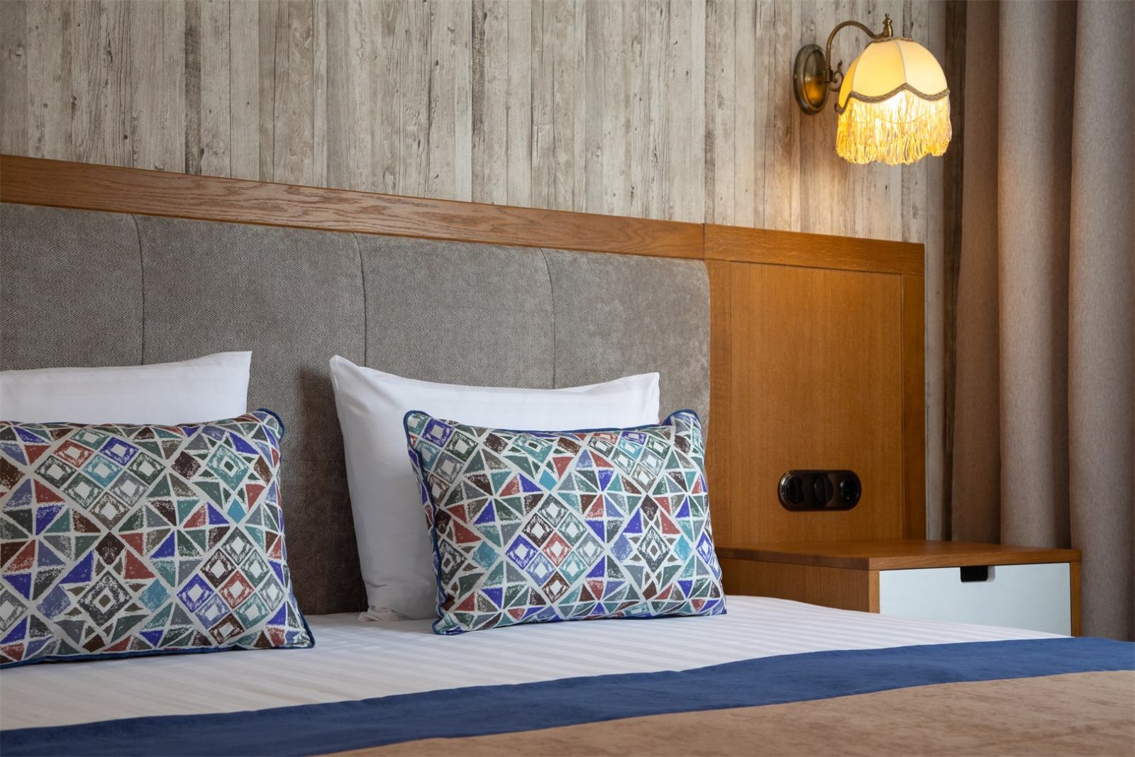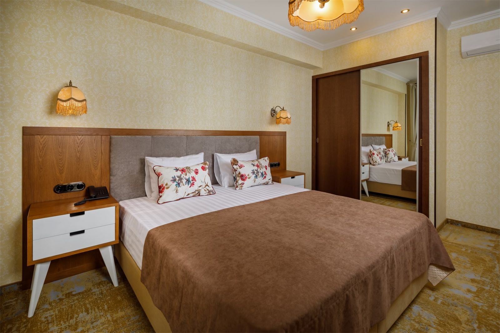 Трехэтажные жилые корпуса с мансардами разместились на благоустроенной закрытой территории гостиничного комплекса. Отель предлагает отдыхающим девять категорий номеров, способных вместить до 162 человек. Светлые номера в стиле прованс оснащены современной техникой и укомплектованы удобным мебельным гарнитуром с прикроватными тумбочками и шкафом-купе, в ванных комнатах гостей ожидают косметические принадлежности, тапочки, фен.