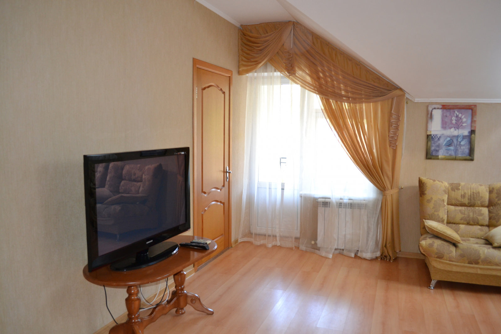 2 осн. места. 3 доп. места. Кухня. Мебель: вешалка, диван раскладной, зеркало, кресла, кровать двуспальная, кухонная мебель, прикроватные тумбочки, стол, столик журнальный, стол обеденный, стулья, тумба, шкаф. Оборудование: кондиционер, микроволновая печь, набор посуды, плита электрическая, телевизор, холодильник, электрочайник. Санузел. Сервис: Wi-Fi бесплатно, смена полотенец, смена постельного белья, уборка номера. Терраса.