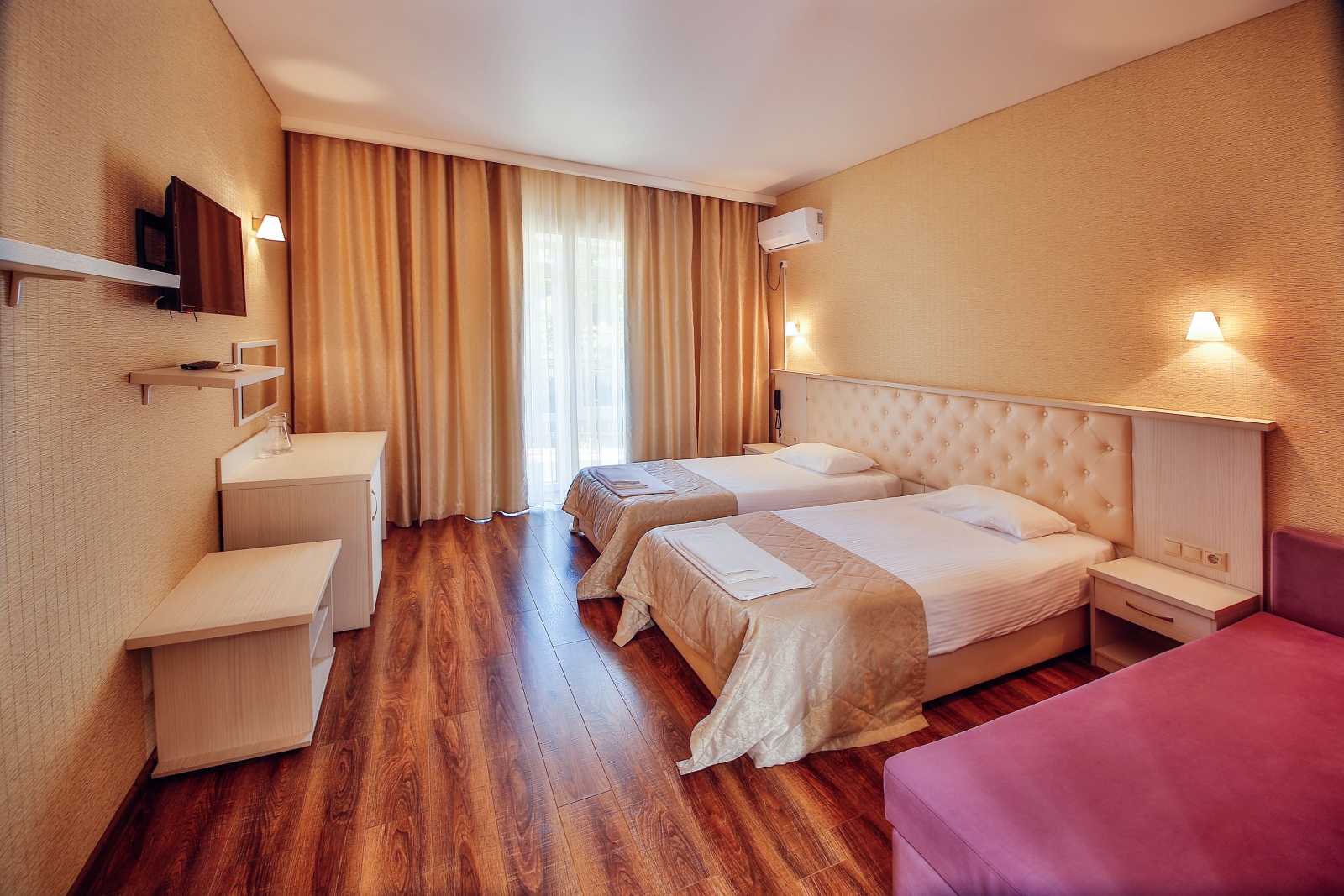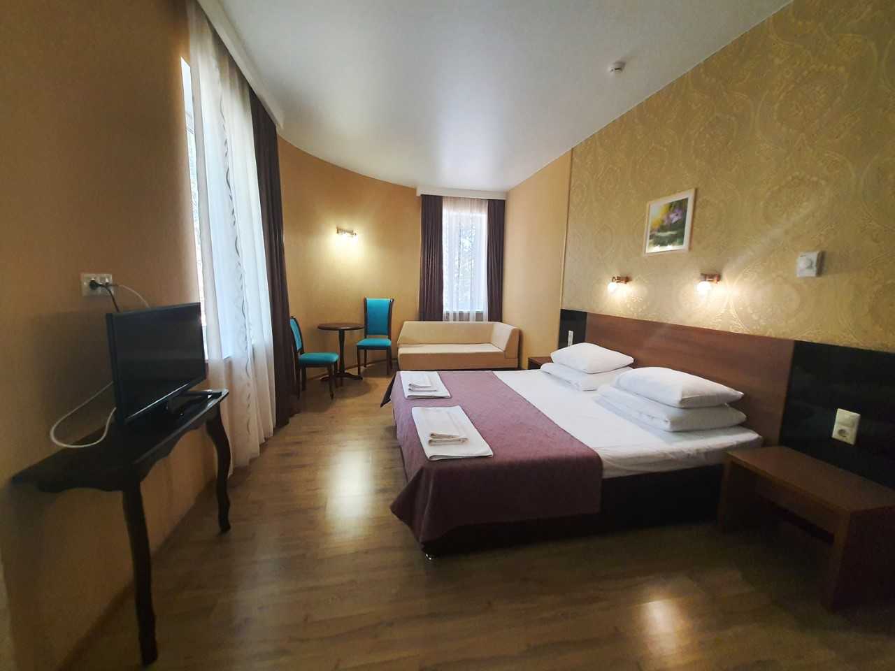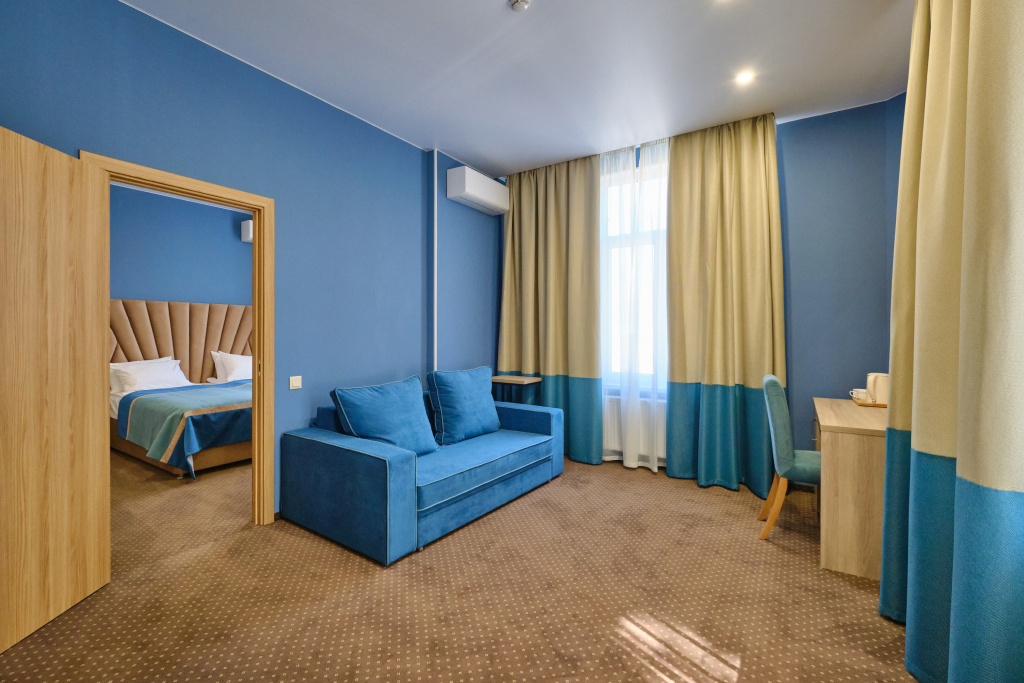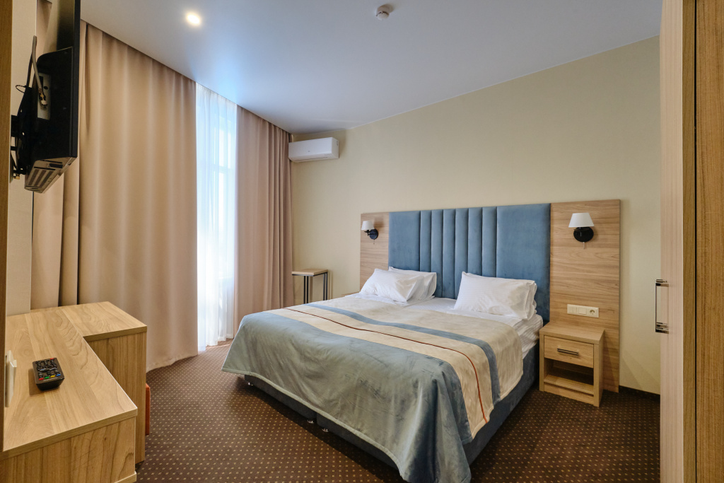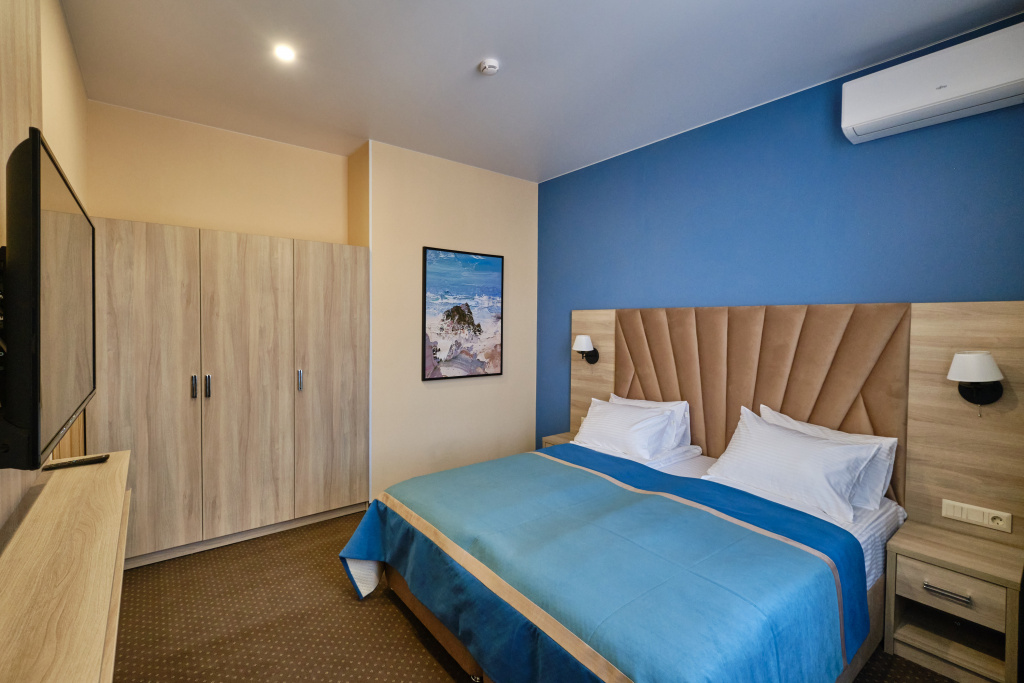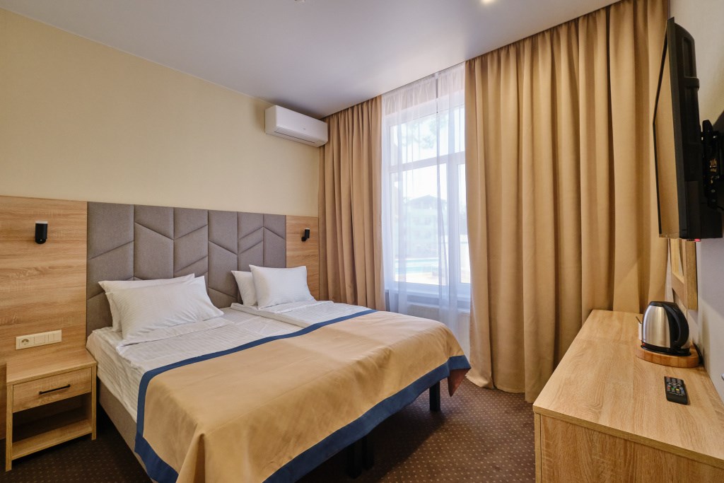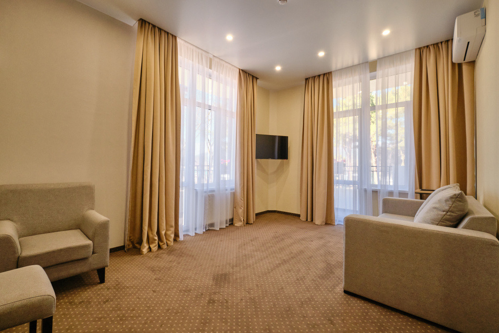 Заселение проходит в номерах категорий: стандарт, сюит, люкс и апартаменты. Здесь развита инфраструктура для занятий спортом: открыты спортивный и тренажёрный залы, волейбольная площадка, теннисные корты, поле для мини-футбола. Для гостей также есть сауна, библиотека, парикмахерская, массажный и косметологический кабинет. Собственный оборудованный пляж находится в 70 метрах.