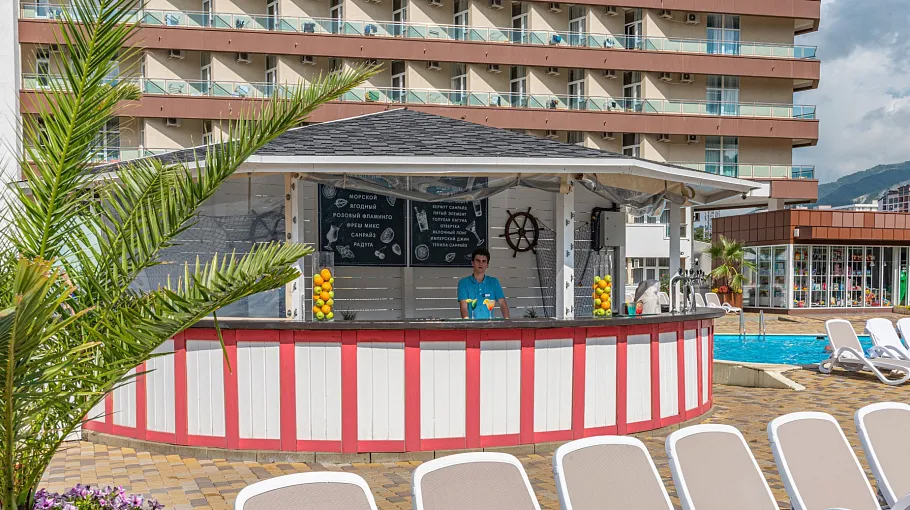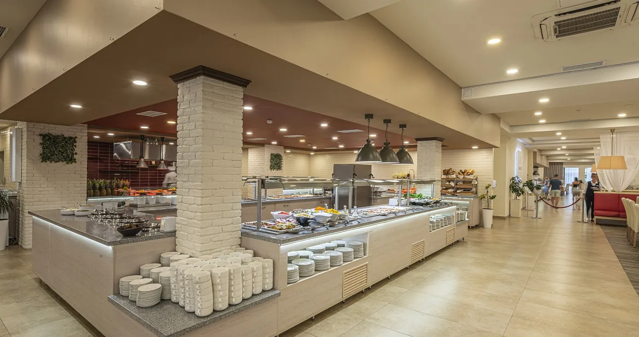 На территории отеля есть несколько замечательных заведений: ресторан с одноименным названием «Biarritz», в котором проходит трехразовое питание по системе «шведский стол», где можно побаловать себя вкуснейшими блюдами и напитками, детское кафе для маленьких гостей пансионата, а также отличные снек-бары с освежающими напитками, пирогами и пиццей, ресторан с мясными и рыбными блюдами, бар около бассейна.
