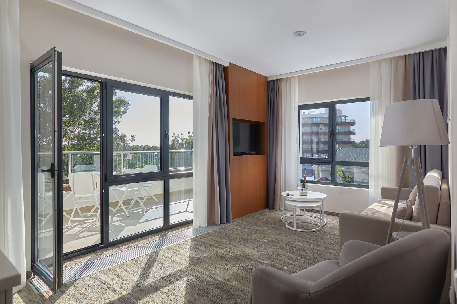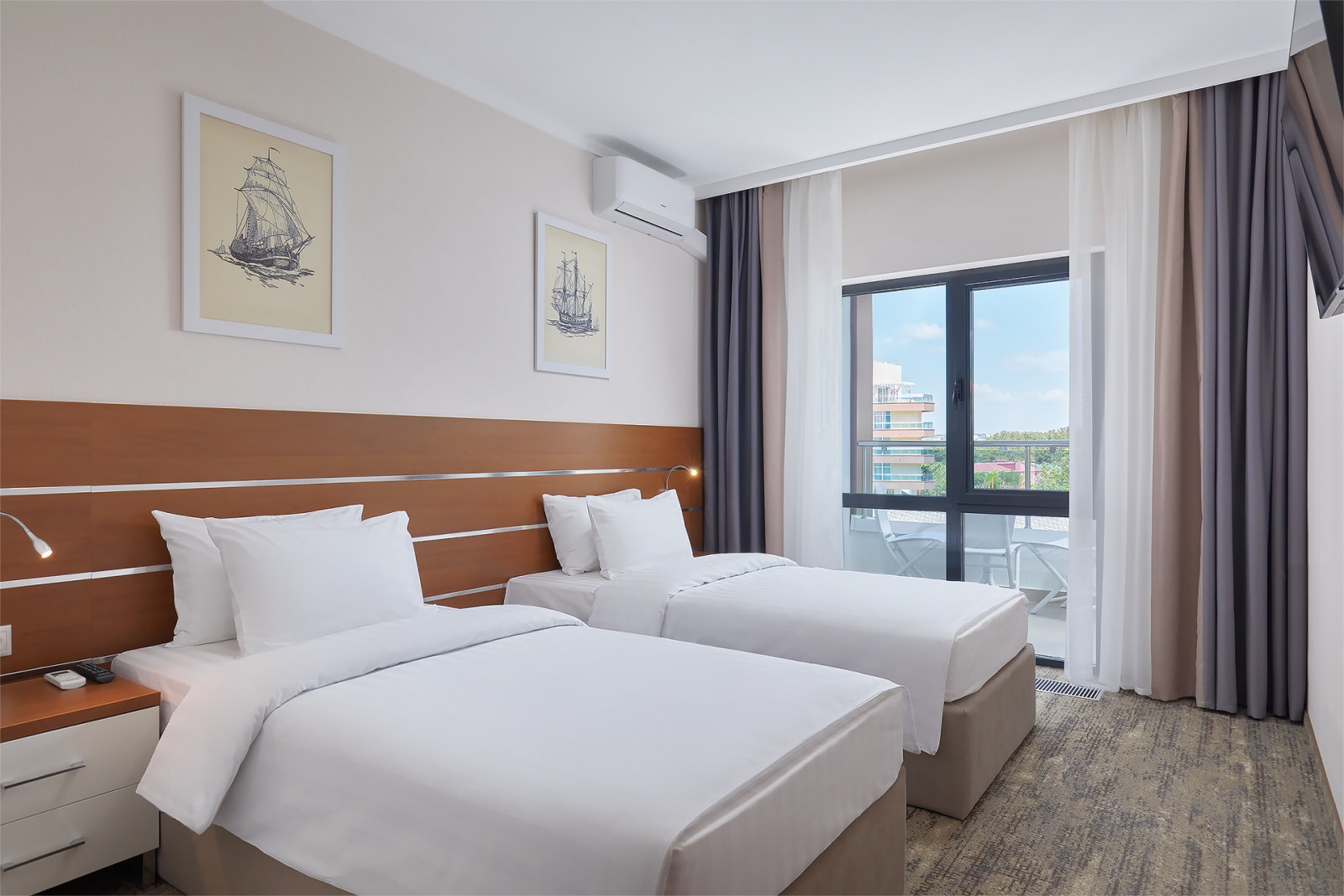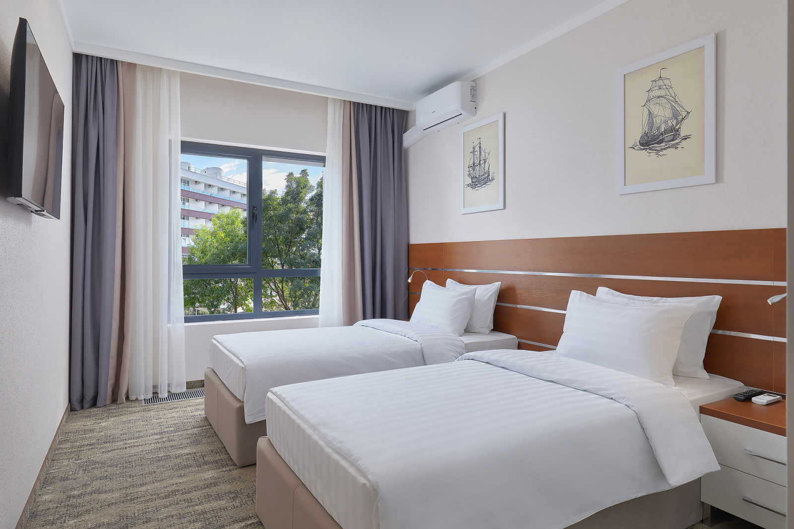 Номерной фонд пансионата представлен двумя жилыми корпусами, включающими в себя различные категории номеров от бюджетных вариантов до роскошного люкса. Жилые корпуса находятся в окружении красивых лужаек, клумб с цветами и архитектурных фигур.