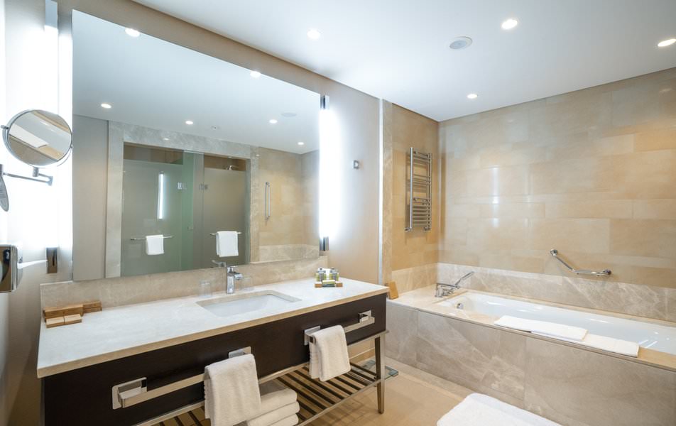 Просторный двухкомнатный номер, который состоит из гостиной, спальни с большой двуспальной кроватью, просторной ванной комнаты и гостевого туалета.