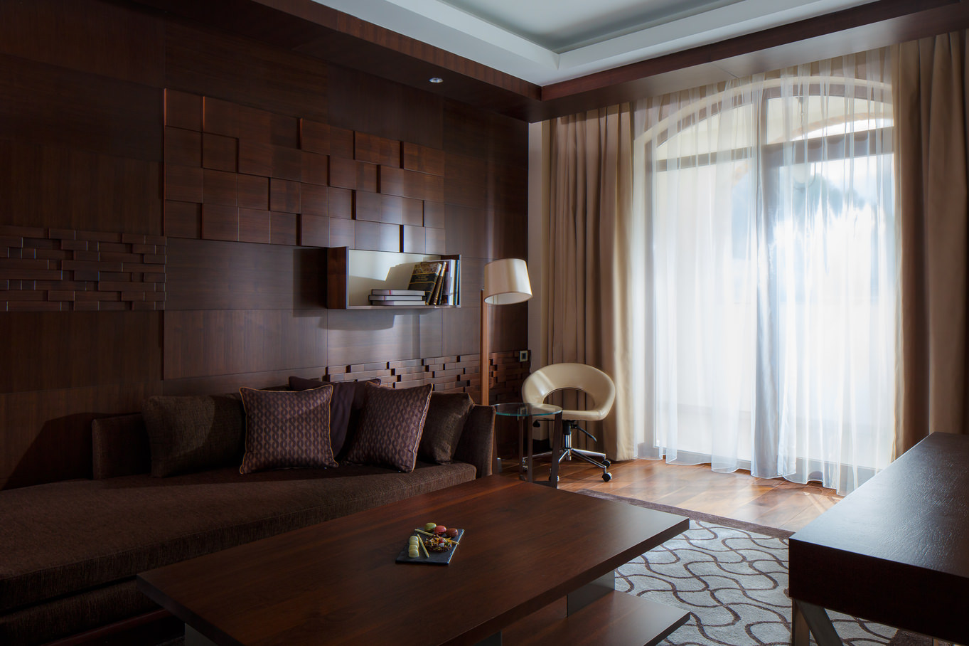Дизайнерский люкс с одной спальней, гостиной, собственной кухней, столовой, рабочим кабинетом, залом для переговоров и гардеробной комнатой.