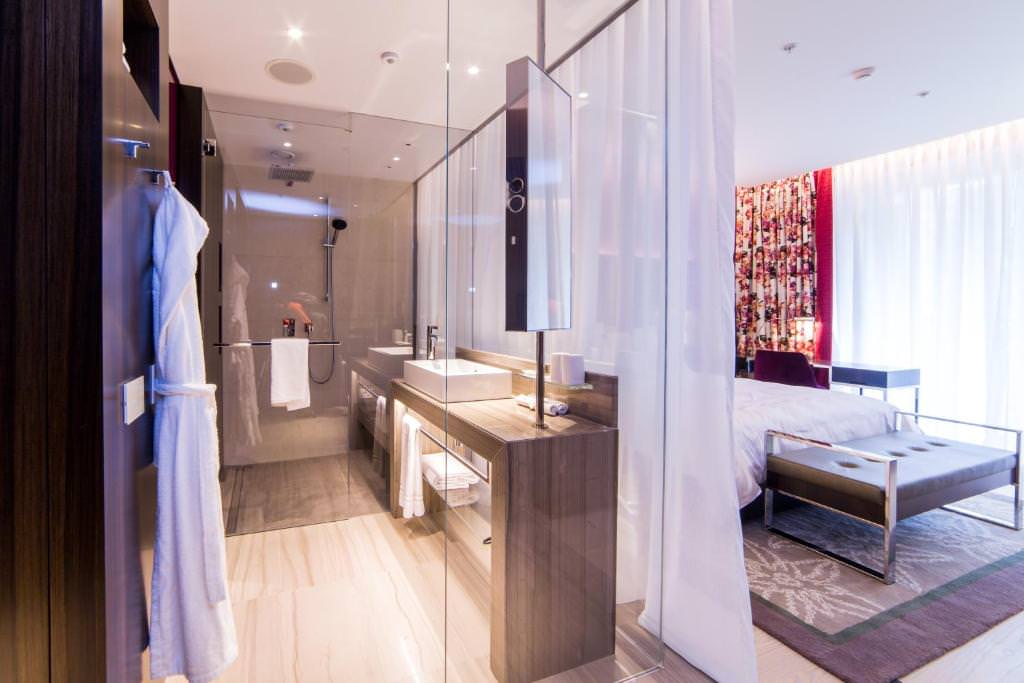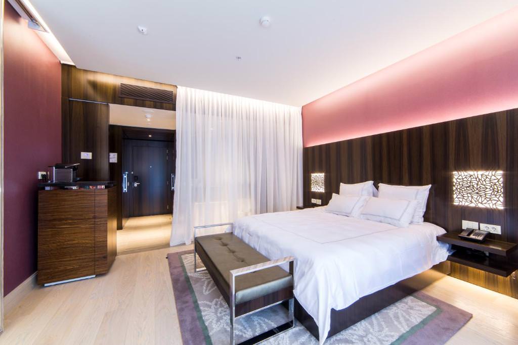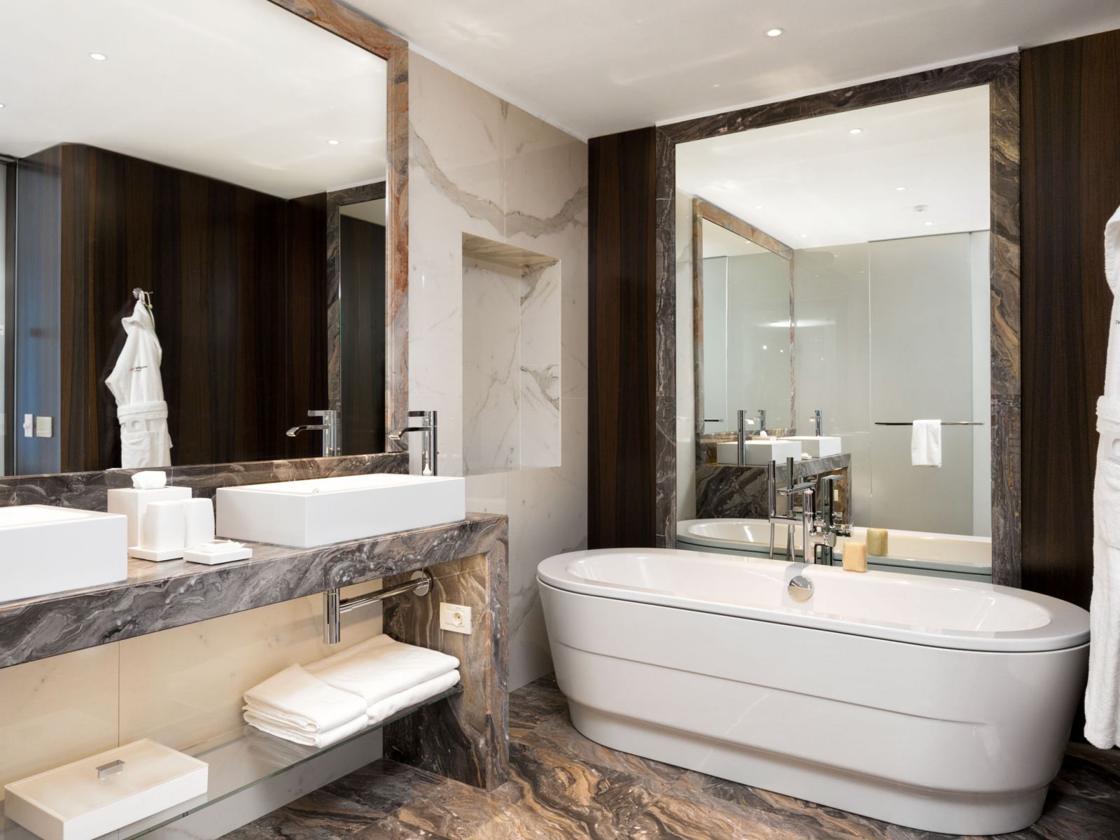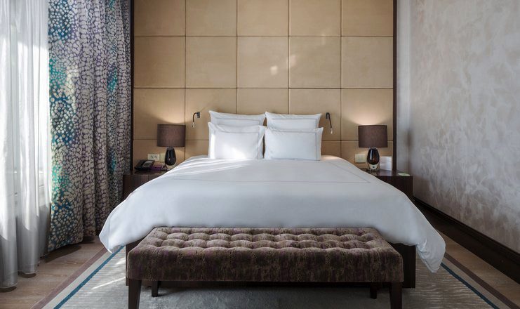 Площадь номера варьируется от 94 до 129 кв.м. В этом пространстве есть двуспальная кровать, кофемашина, кондиционер, утюг с гладильной доской, большой компьютерный стол, мини-бар. Работает беспроводной интернет.
