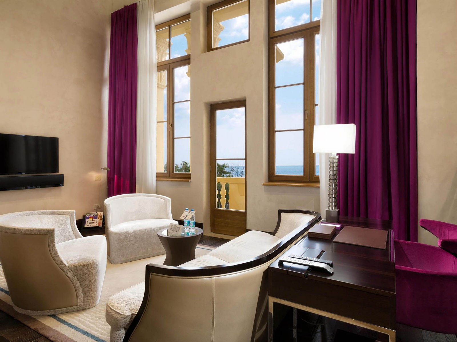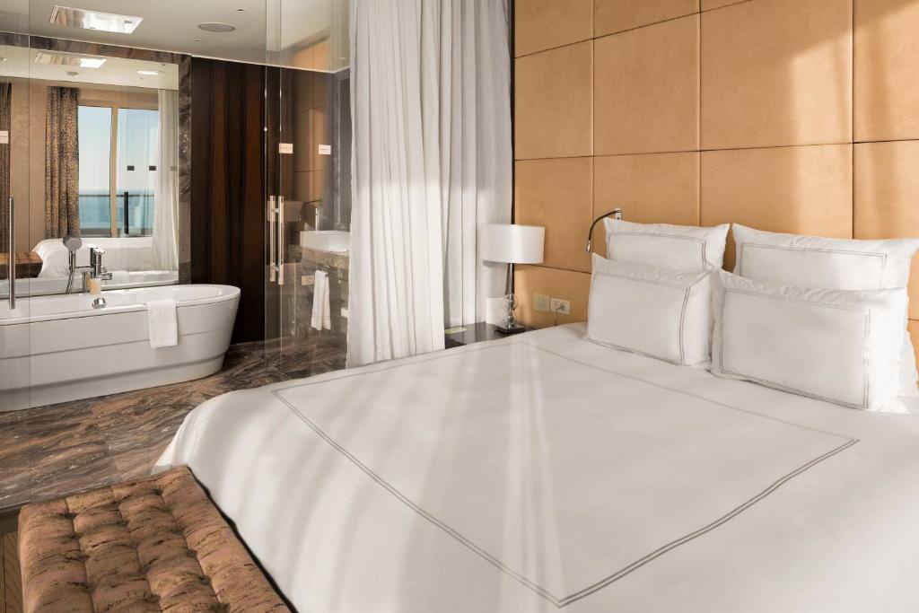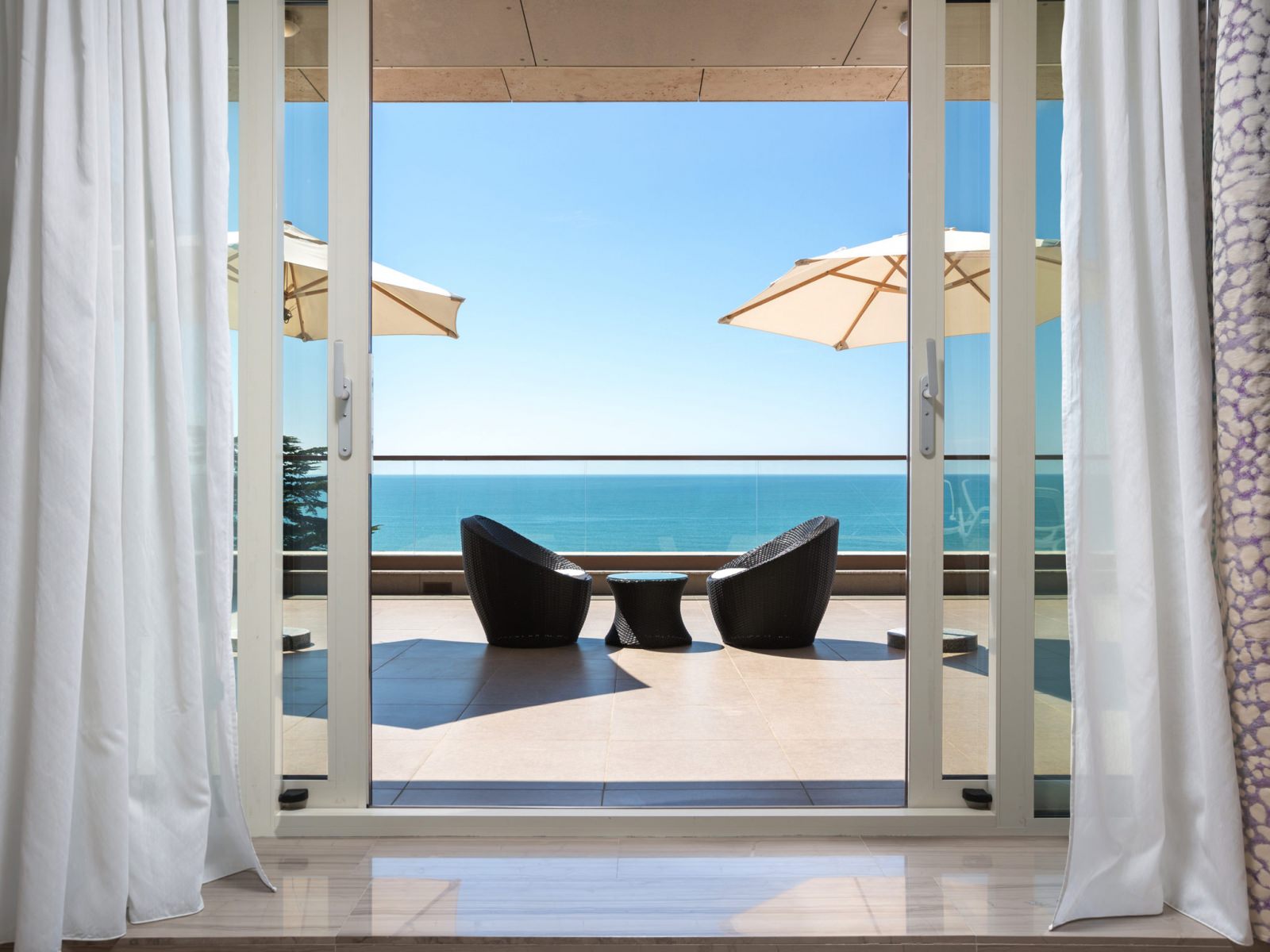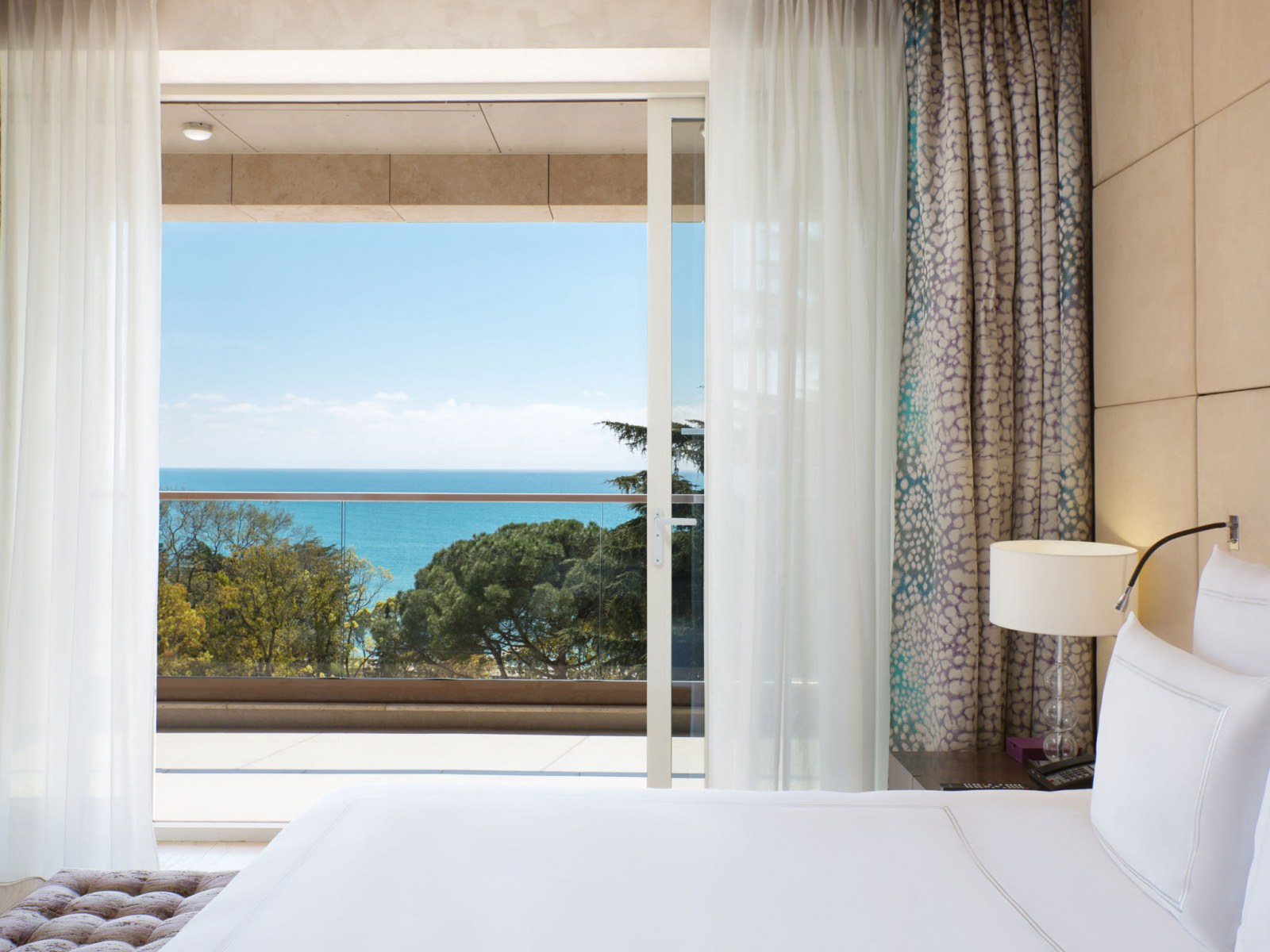 Для сна установлена широкая двуспальная кровать. Из окон открывается вид на море. В наличии кофемашина, мини-бар, минеральная вода, Wi-Fi.
