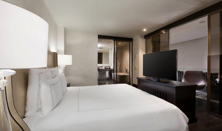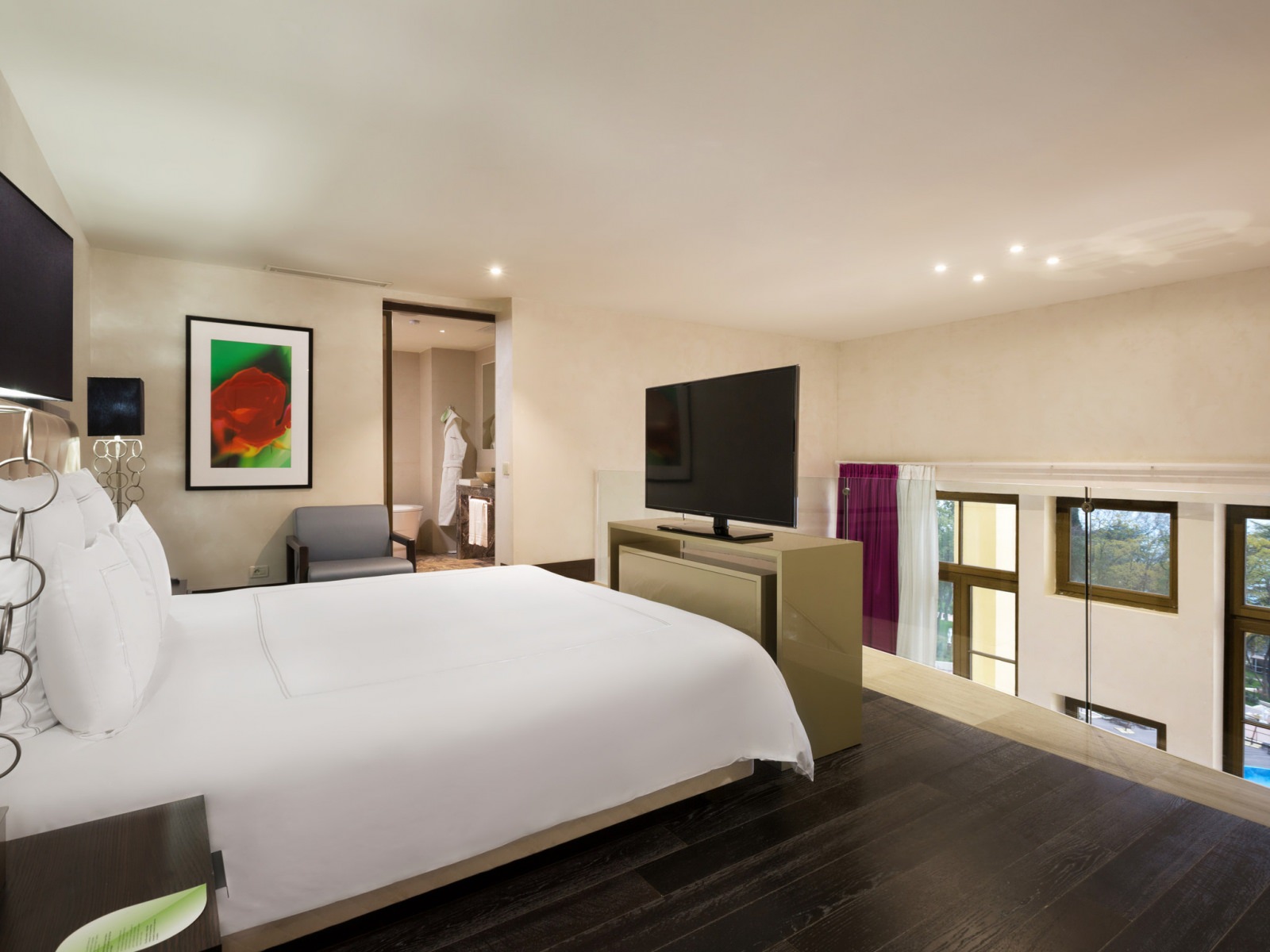 Двухуровневый люкс с видом на парк имеет спальню, гостиную, раздельные ванну и душ, а также балкон.