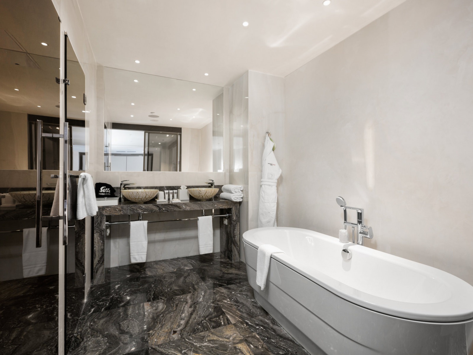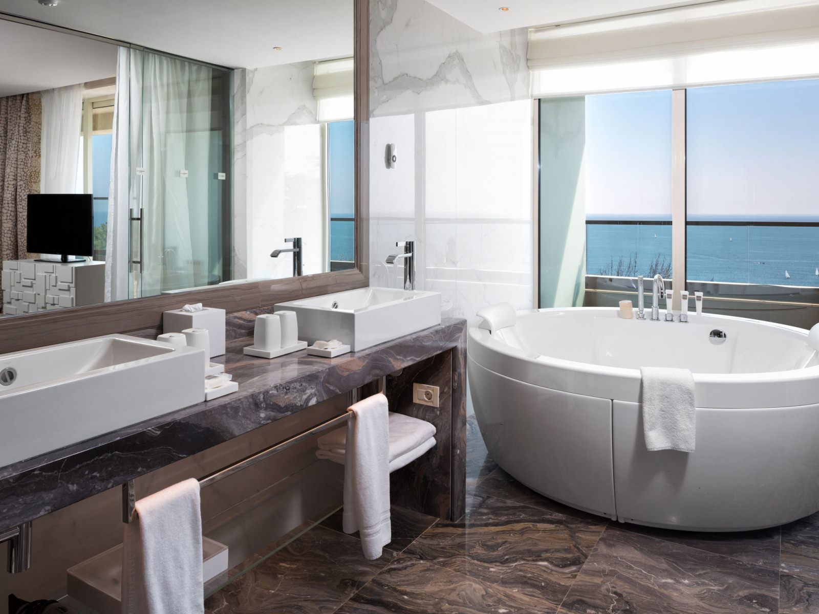 Этот номер отличается от других наличием и душа, и ванны. Здесь установлена большая двуспальная кровать, а из окон открывается вид на парк или море.