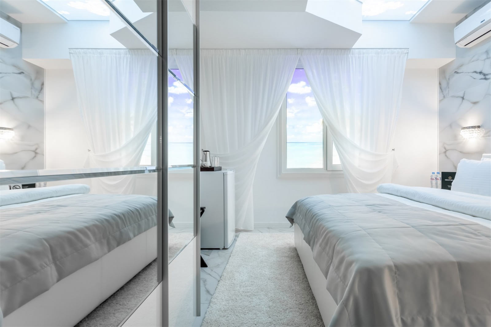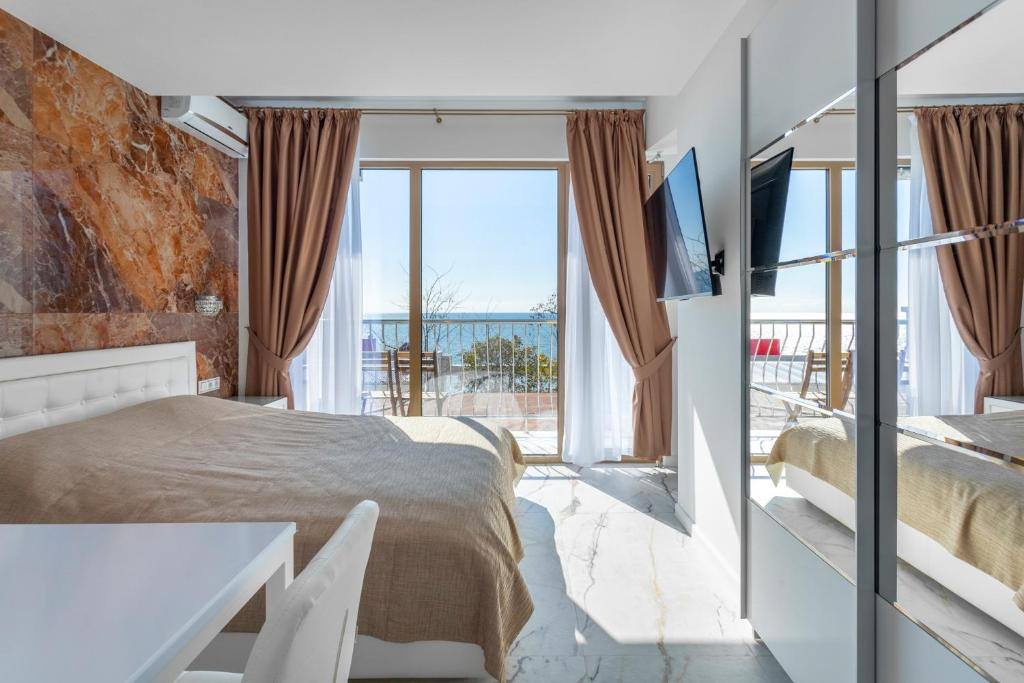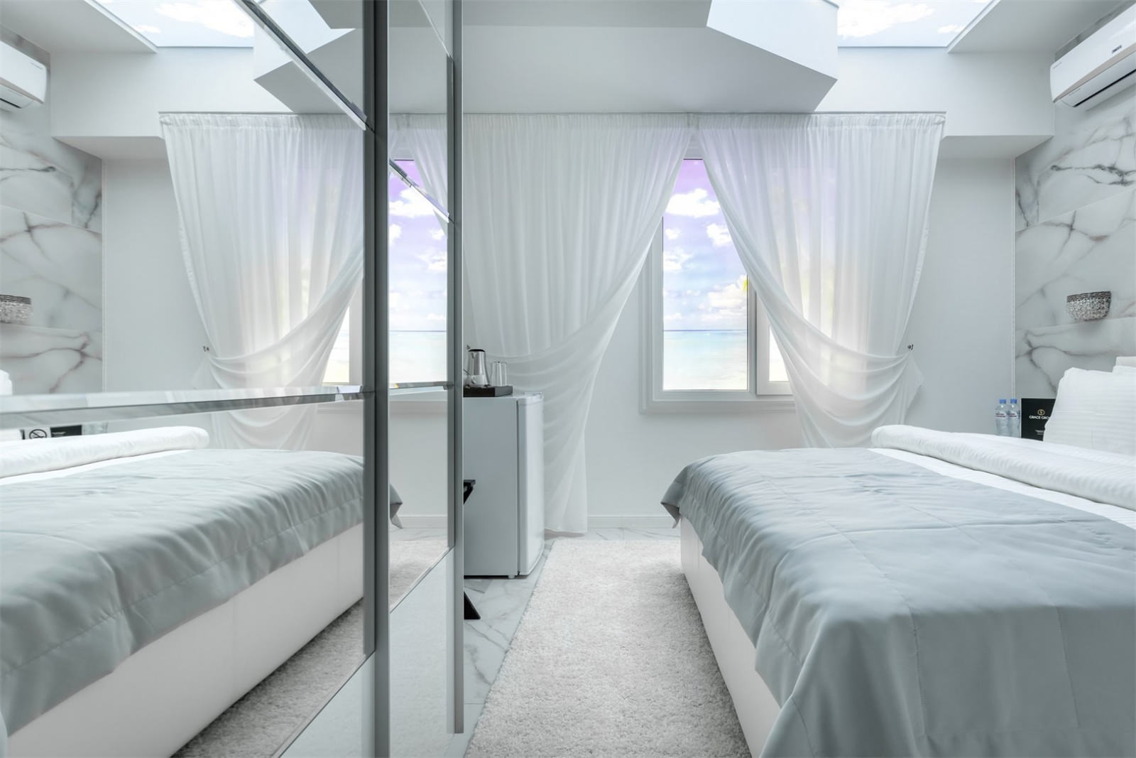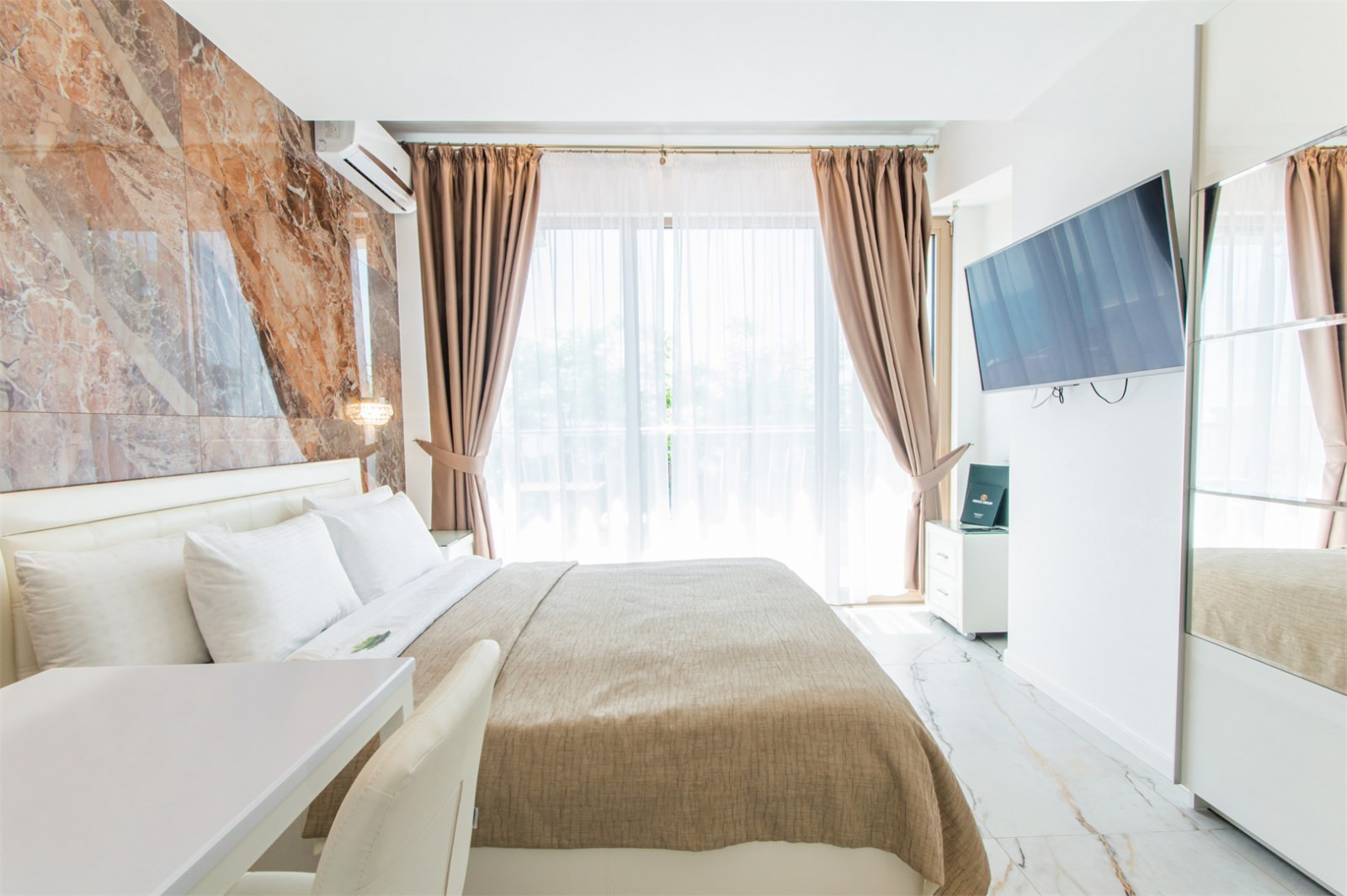 Пятиэтажное здание отеля с лифтом, находится в 300 метрах от морского побережья. Жилой фонд, рассчитанный на 130 человек, предлагает отдыхающим однокомнатные номера разной категории — от Эконома до Сьюта и Люкса. В номерах стильный современный интерьер, выдержанных в светлых тонах с включением мраморных элементов. Каждый номер независимо от степени комфорта оснащен санузлом с душем, кондиционером и укомплектован необходимой техникой — есть телевизор, фен, холодильник. В Студиях оборудована удобная мини-кухня, номера повышенной комфортности оборудованы дополнительной техникой, из ряда комнат открываются панорамные виды на морское побережье.