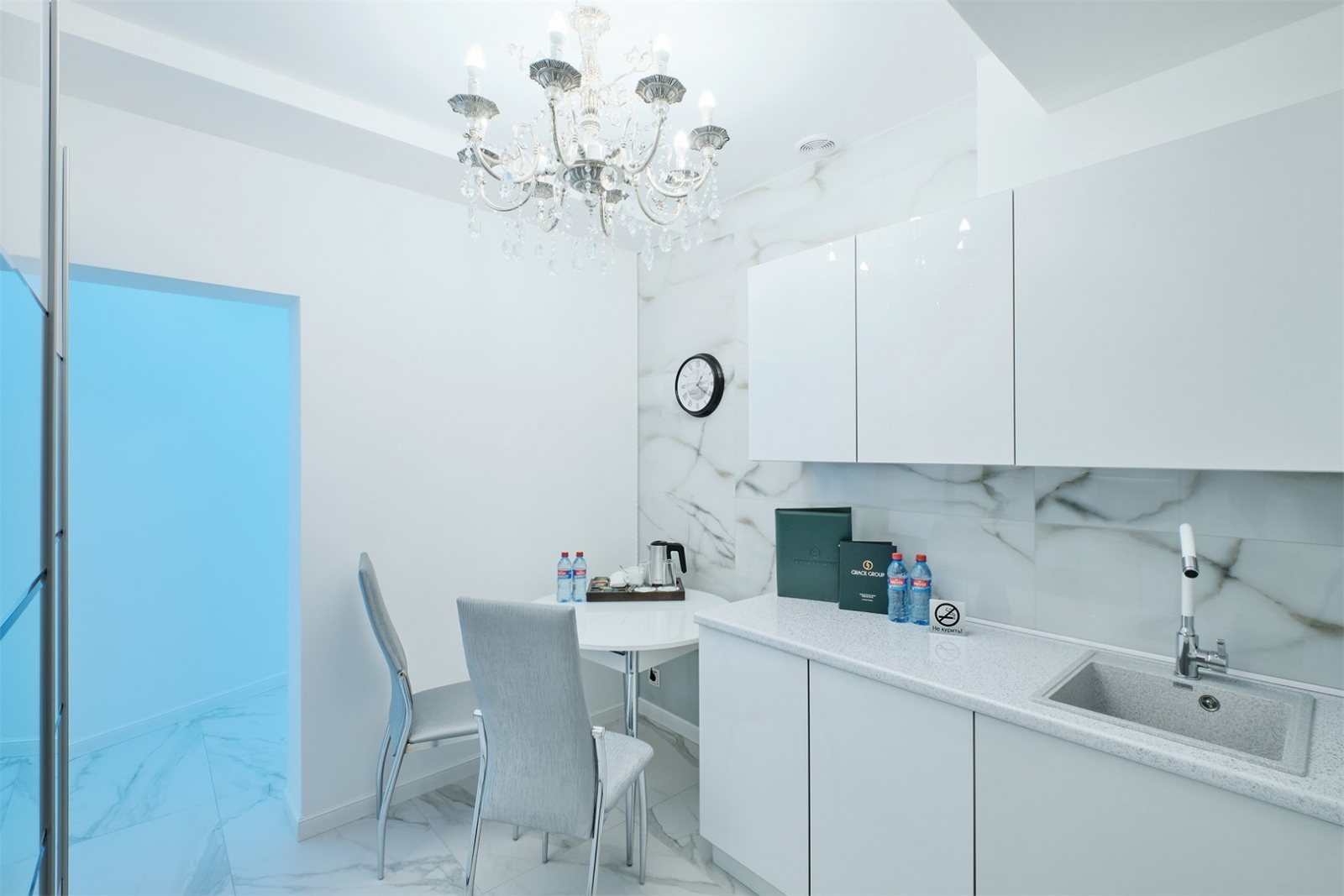 В двухместном номере с кухней класса «Синьор сюит» есть все, чтобы почувствовать уют и комфорт. В просторных апартаментах площадью от 40 кв.м гостям гарантирован качественный и приятных отдых. В номере предусмотрено 2 дополнительных места (диван, кровать).Предназначен для комфортного размещения 2-3 человек. Посещение термальной зоны SPA-центра «Цветок Одиссея» включено в стоимость номера. Проживание детей до 5 лет бесплатно.