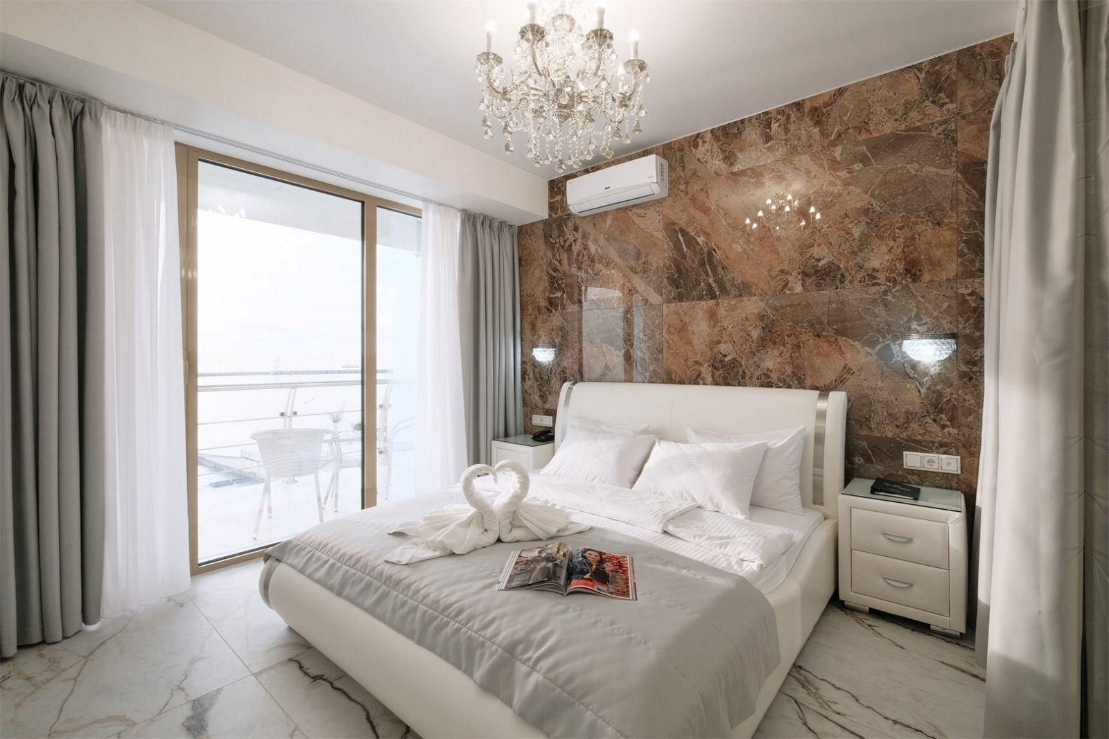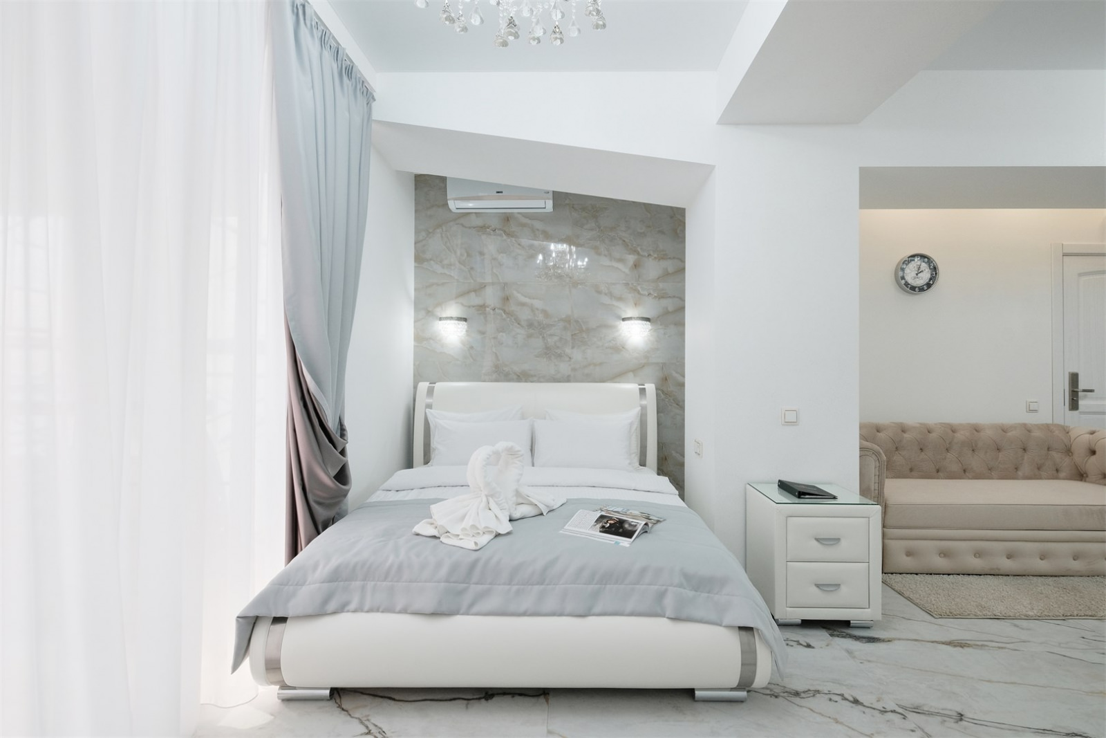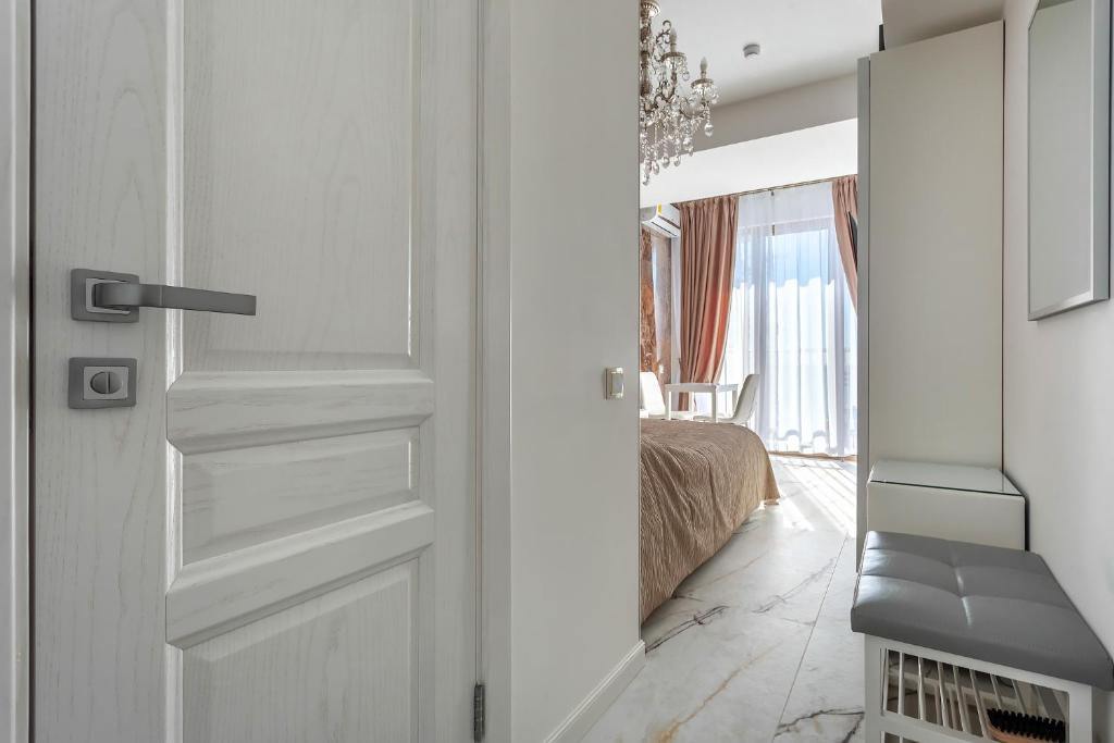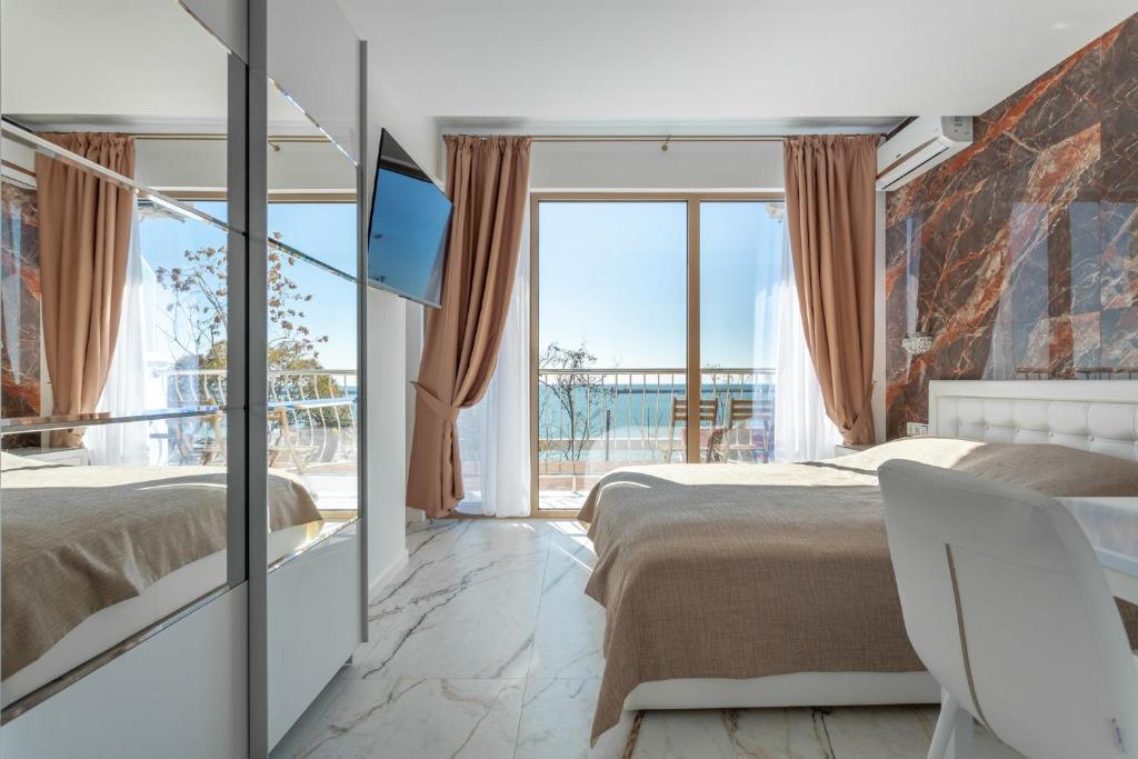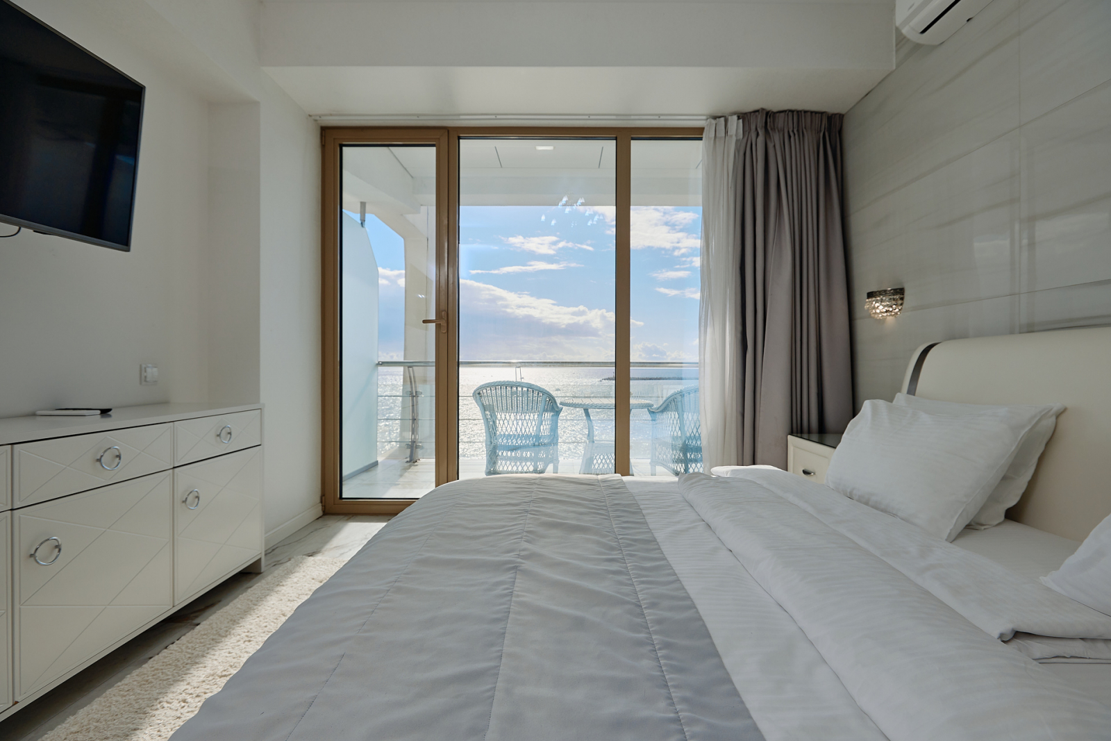 В двухместном номере «Джуниор Сюит» есть все, чтобы почувствовать уют и комфорт. В просторных апартаментах с кухней площадью 29-31 кв.м гостям гарантирован качественный и приятных отдых. Из номера открывается вид на море. Предназначен для комфортного размещения 2-3 человек. В номере предусмотрено 1 или 2 дополнительных места. Посещение термальной зоны SPA-центра «Цветок Одиссея» включено в стоимость номера. Проживание детей до 5 лет бесплатно.