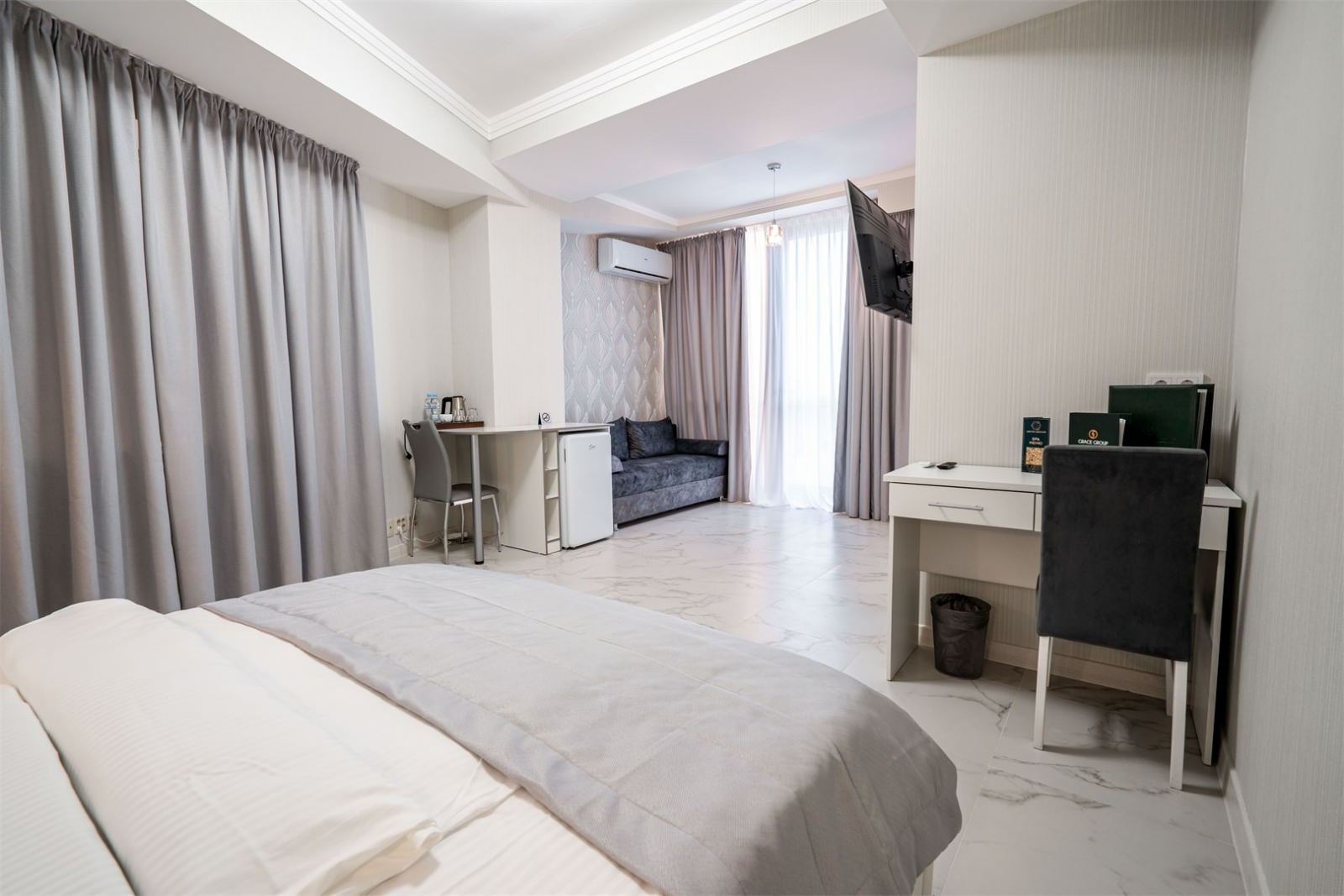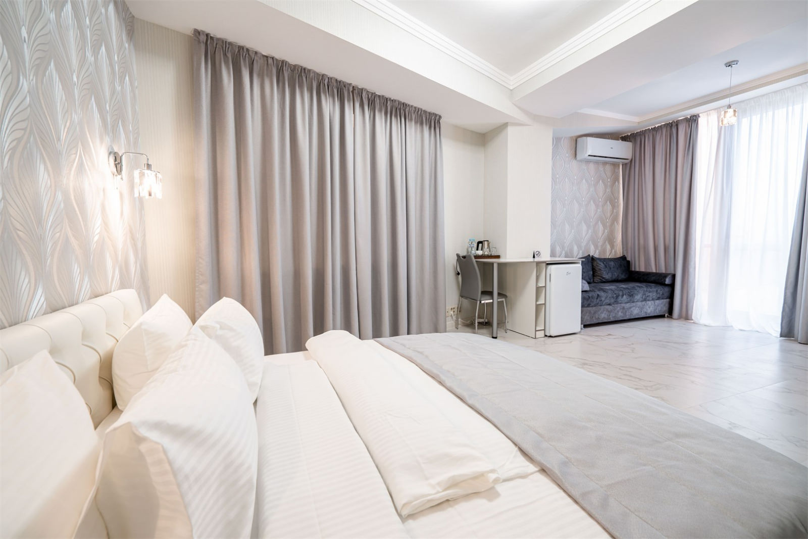 Просторный, светлый номер с кухней и балконом. В номере есть все необходимое для комфортного отдыха: удобная кровать, Wi-Fi, Телевизор, кондиционер, телефон, Мини кухня (без варочной панели) мини холодильник, электрический чайник, стол со стульями, удобный диван, гладильные принадлежности, ванная с душевой кабиной, фен, набор полотенец, халаты и тапочки.