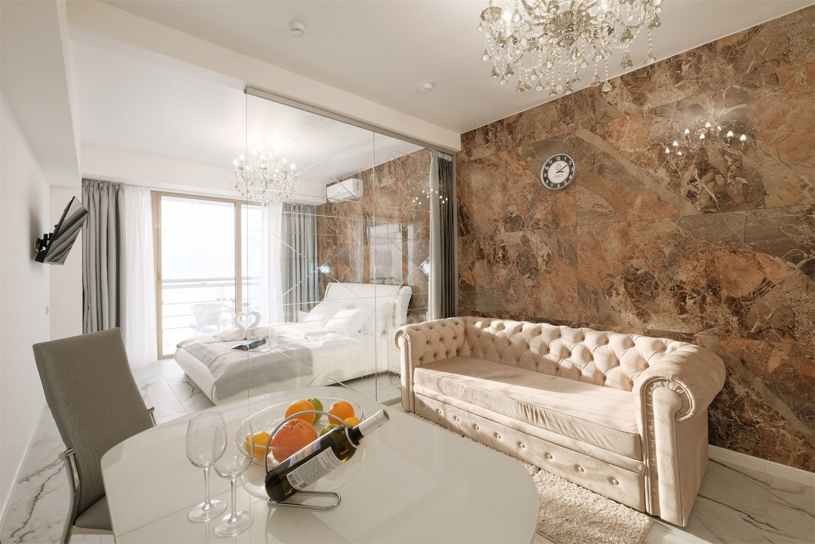 Просторный, однокомнатный двухместный номер с кухней. Есть все необходимое для комфортного пребывания: кровать, диван, телевизор, холодильник, 2 дополнительных места. В ванной комнате имеются гигиенические принадлежности, тапочки, халат. Площадь номера — 35-37 кв.м. В номере есть балкон с видом на море. Посещение термальной зоны SPA-центра «Цветок Одиссея» включено в стоимость номера.
