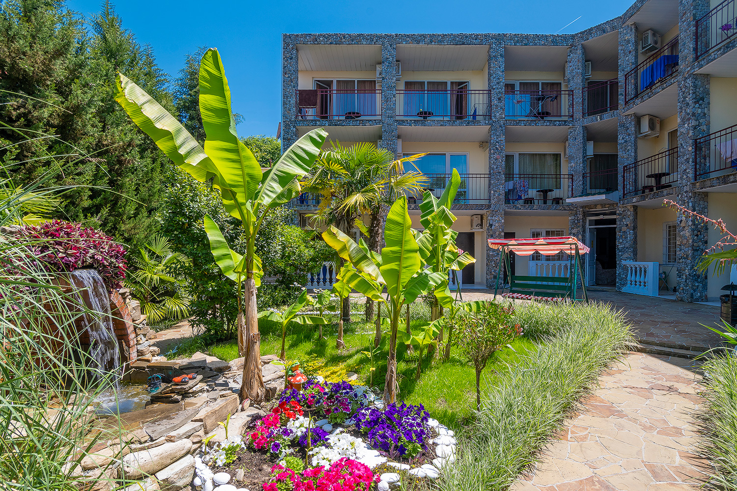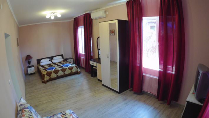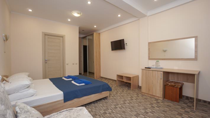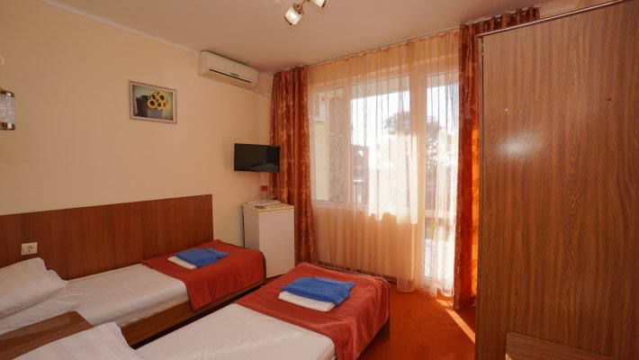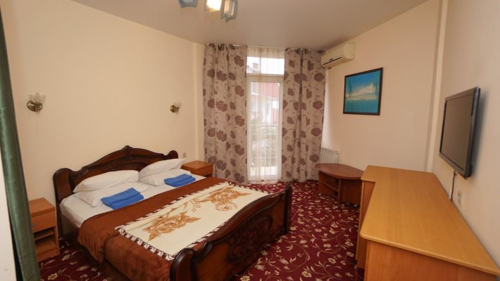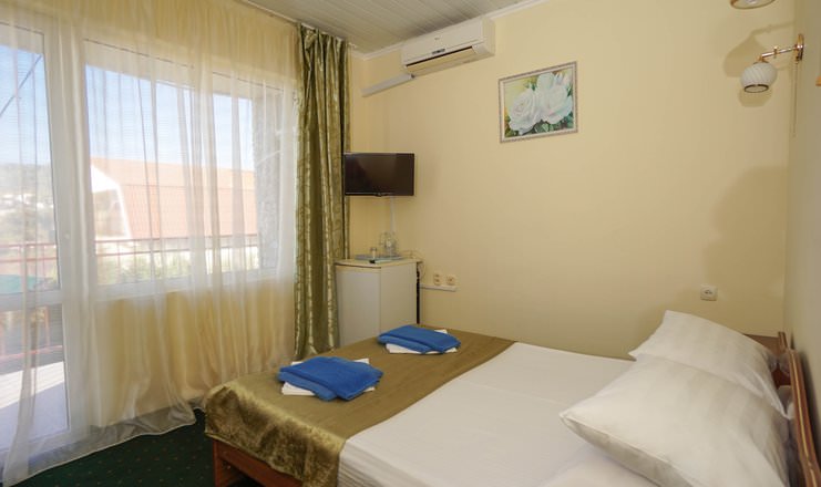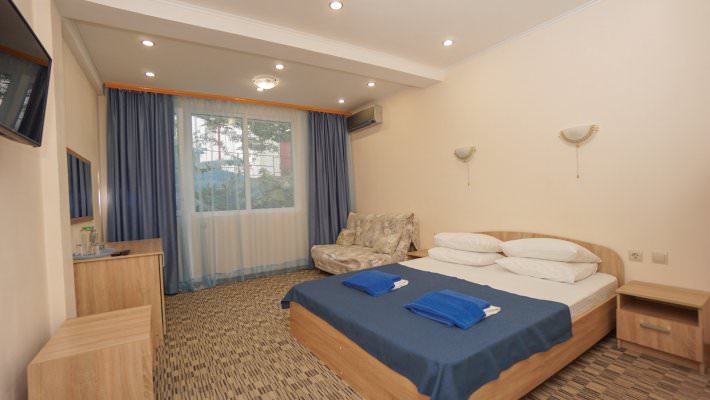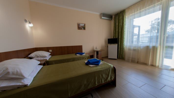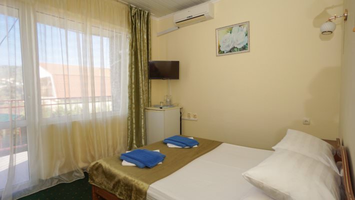 Стандартный номер рассчитан на размещение 3 человек. Есть балкон с видом на море и горы либо сад.