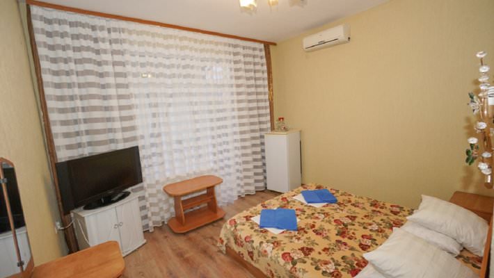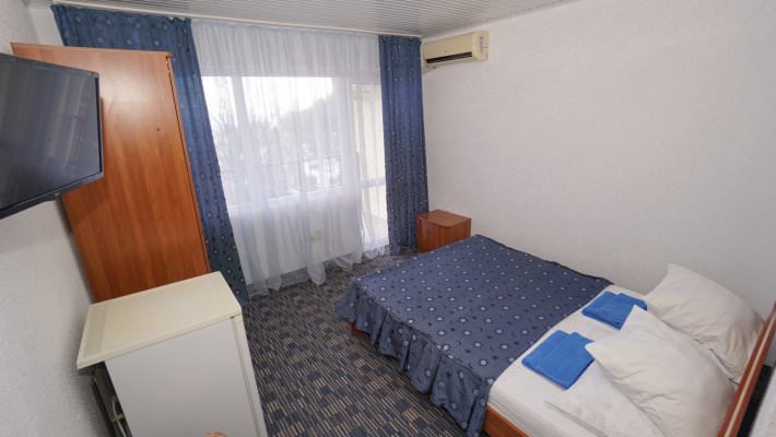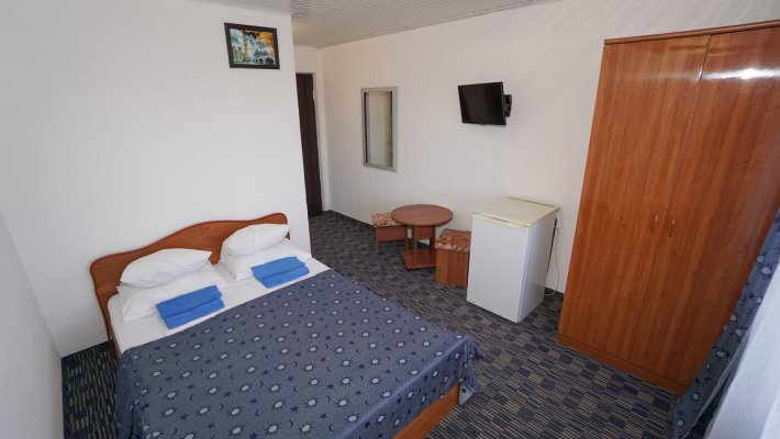 Установлена одна двуспальная либо две односпальные кровати. В наличии кондиционер, телевизор, холодильник.