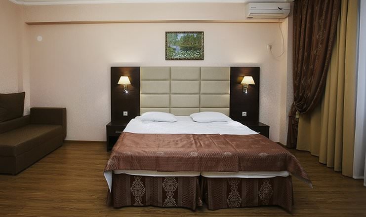 Основные спальные места — две односпальные кровати. Также есть кресло-диван. В наличии кондиционер, телевизор, мини-холодильник.