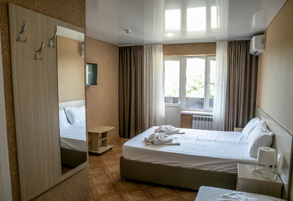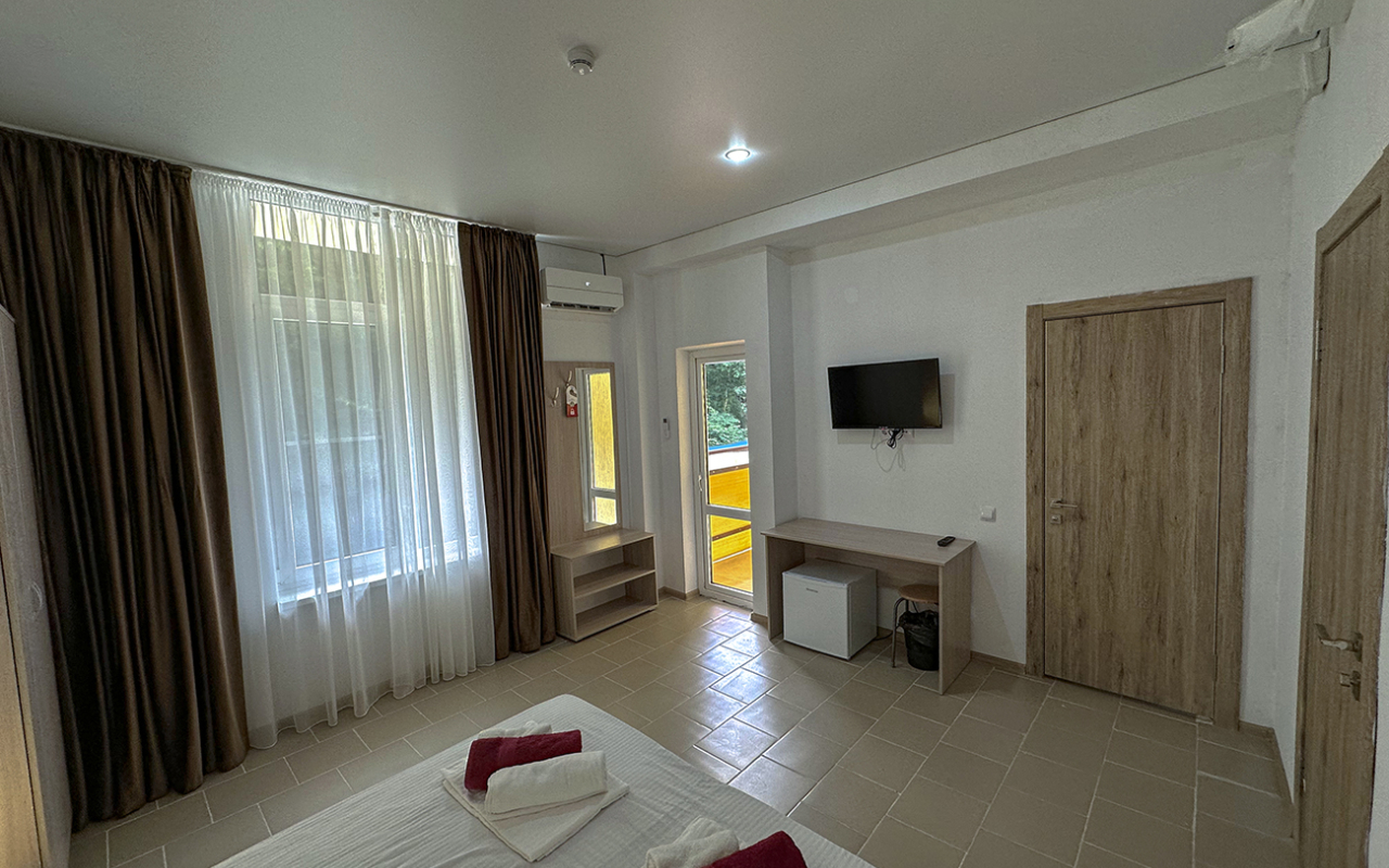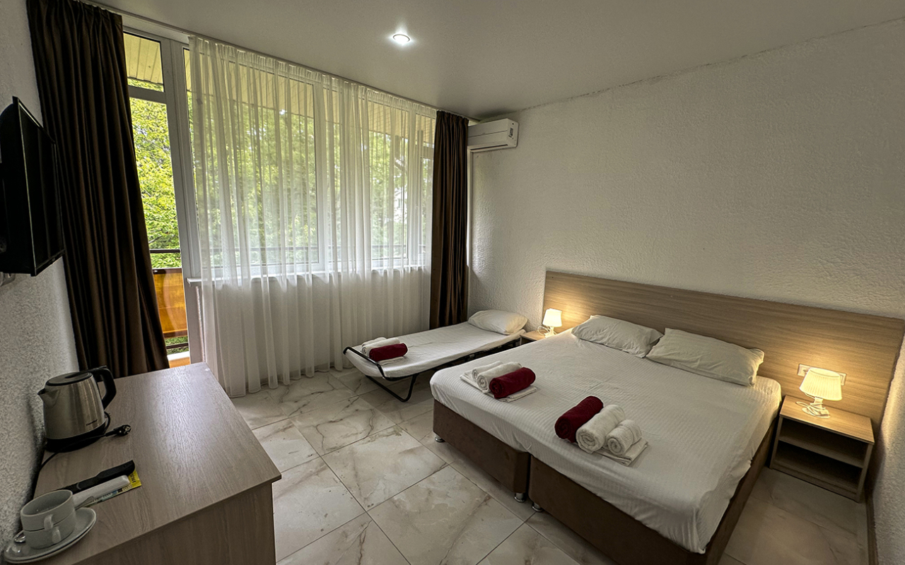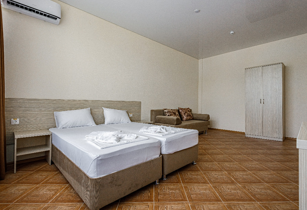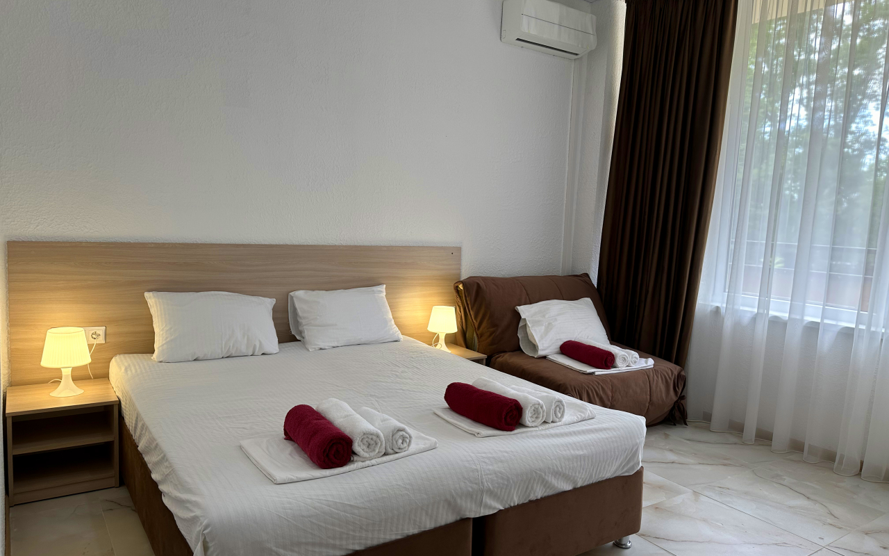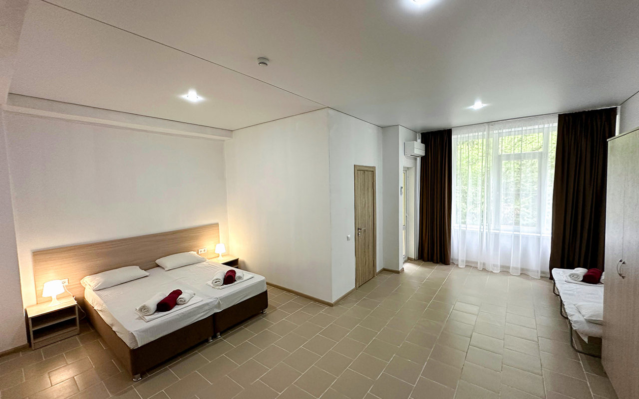 Площадь номера - 30 - 35 кв.м. Возможно размещение 3-х человек на основных местах + 2 дополнительных места.. В номере: душ, туалет, ТВ, холодильник, кондиционер, балкон (не во всех номерах).