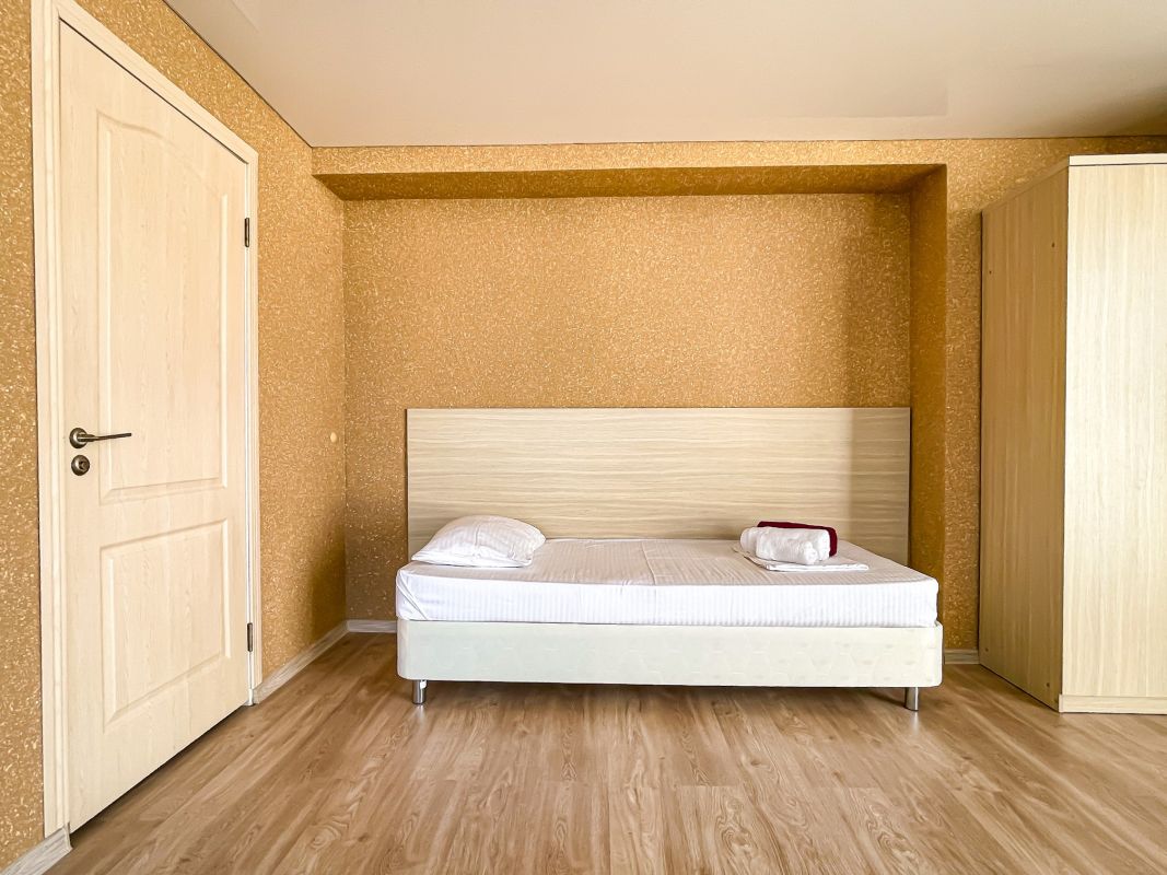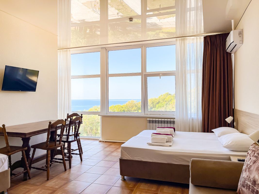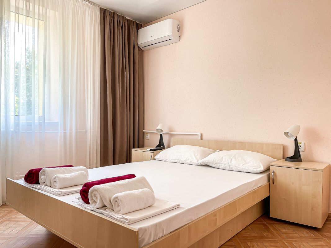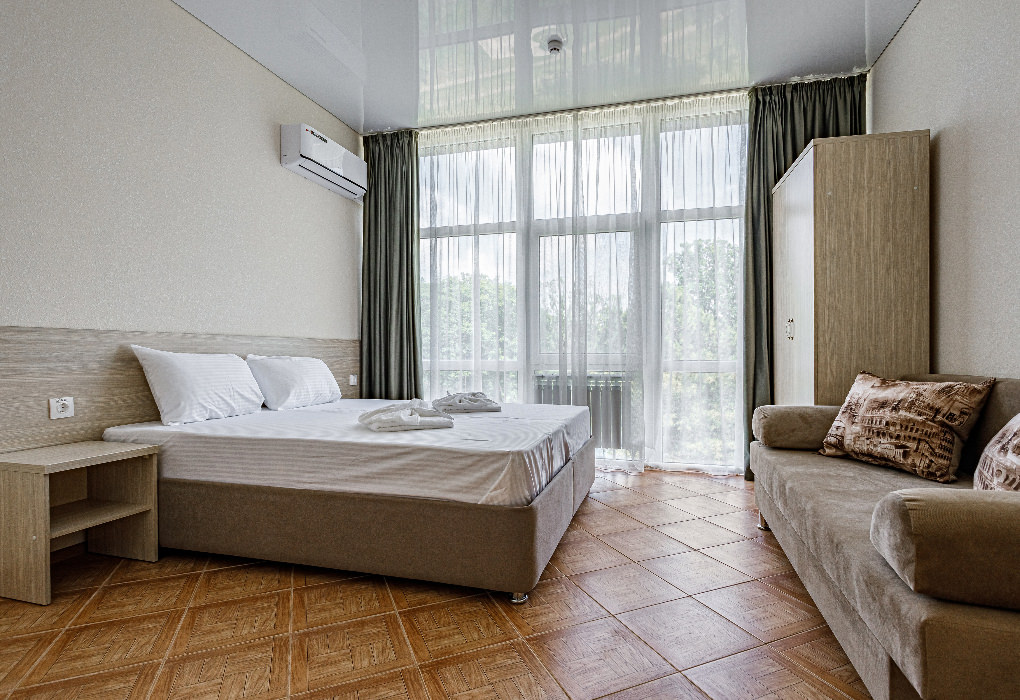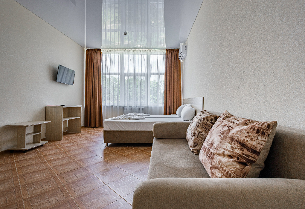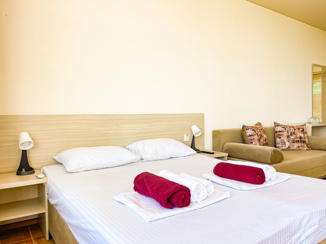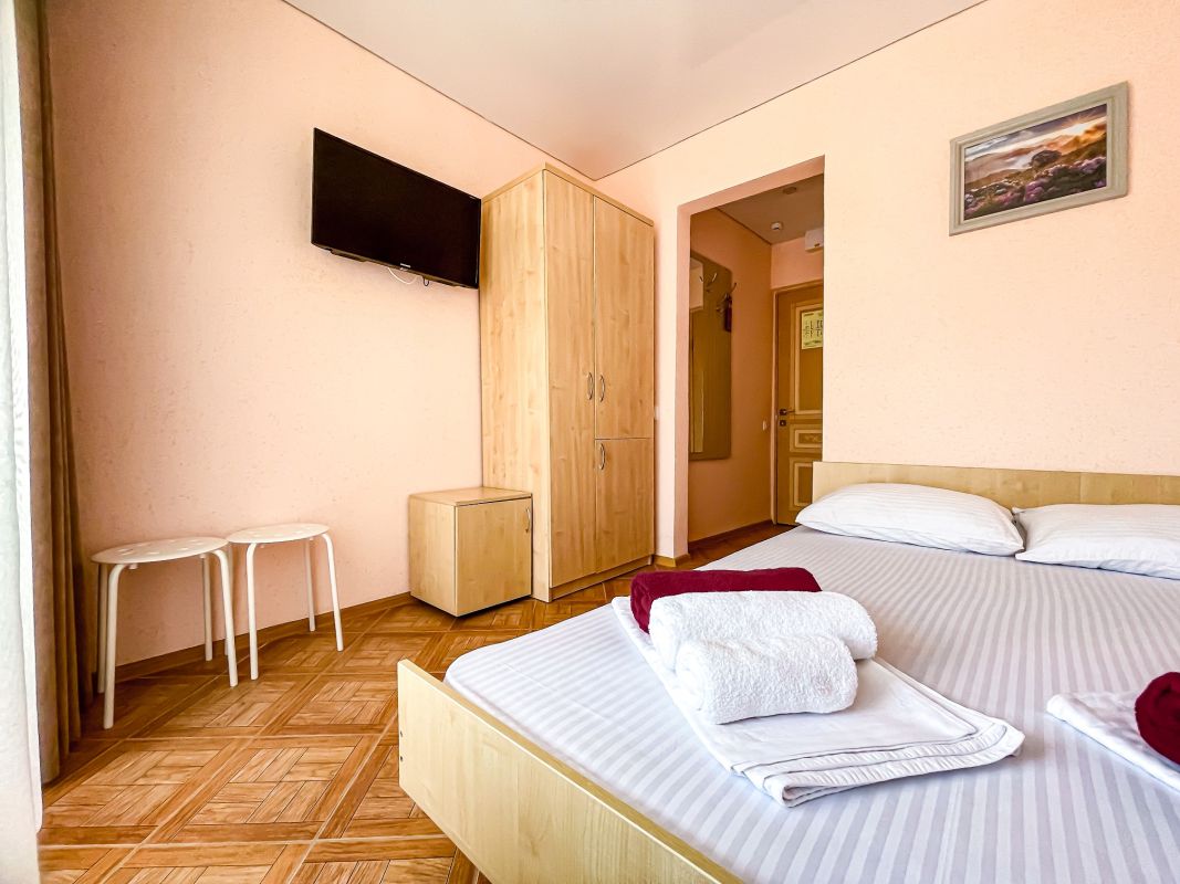 Площадь номера - 30 - 35 кв.м. Возможно размещение 3-х человек на основных местах + 2 дополнительных места.. В номере: душ, туалет, ТВ, холодильник, кондиционер, балкон (не во всех номерах).