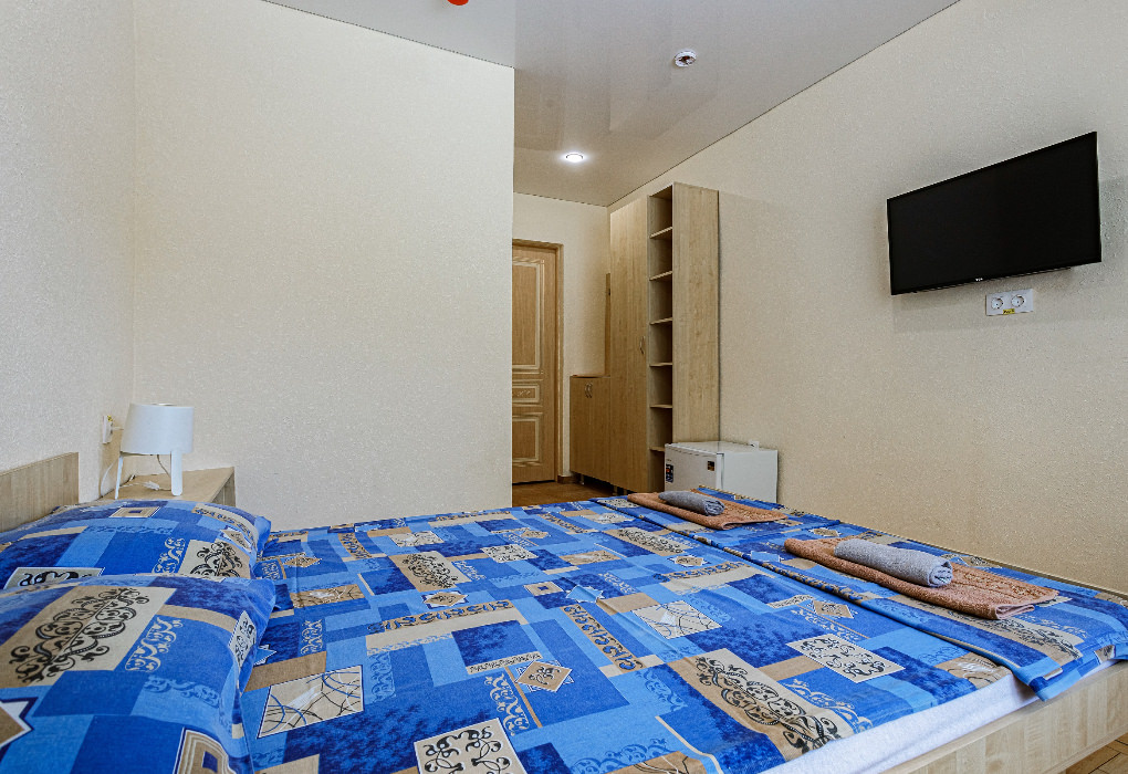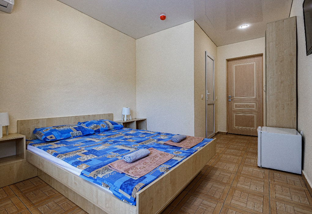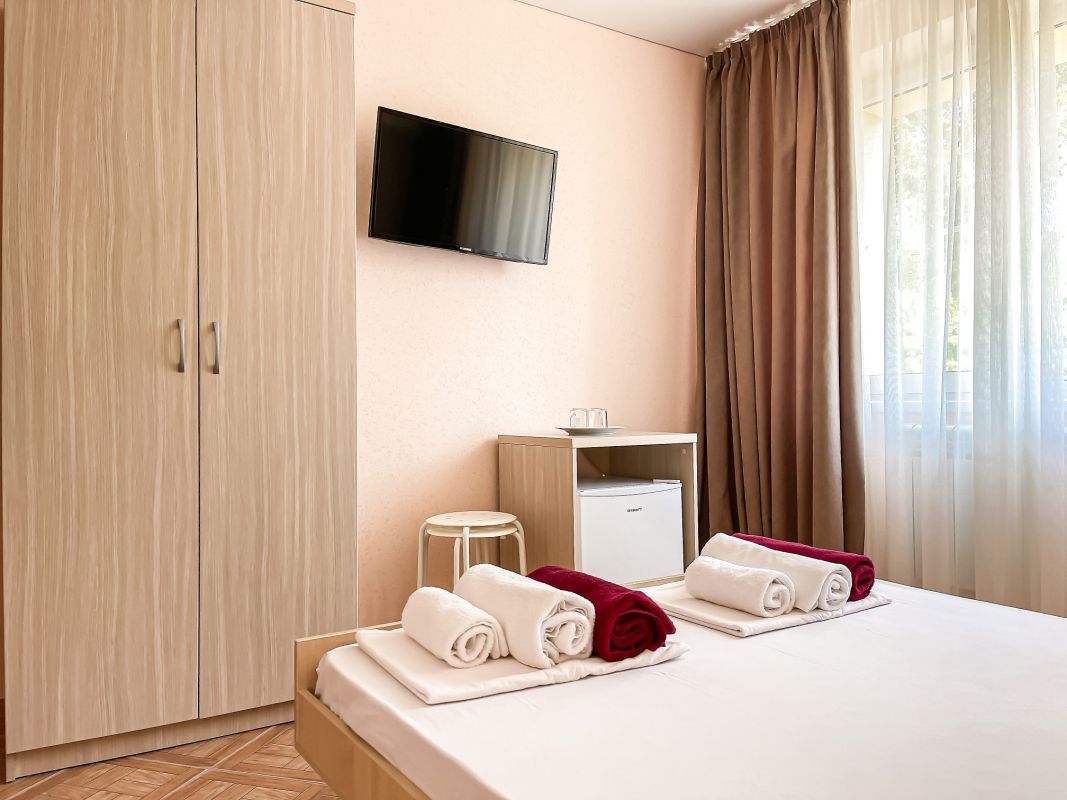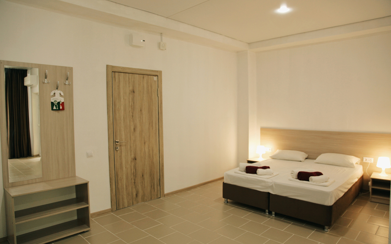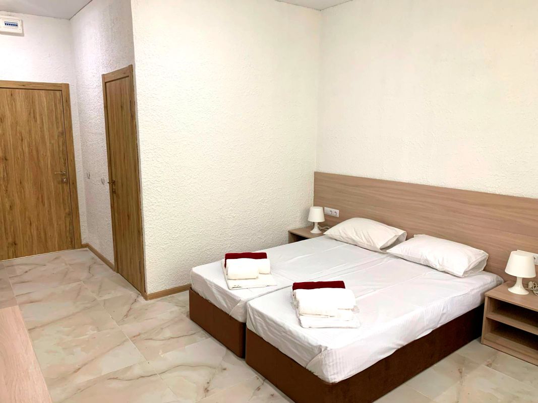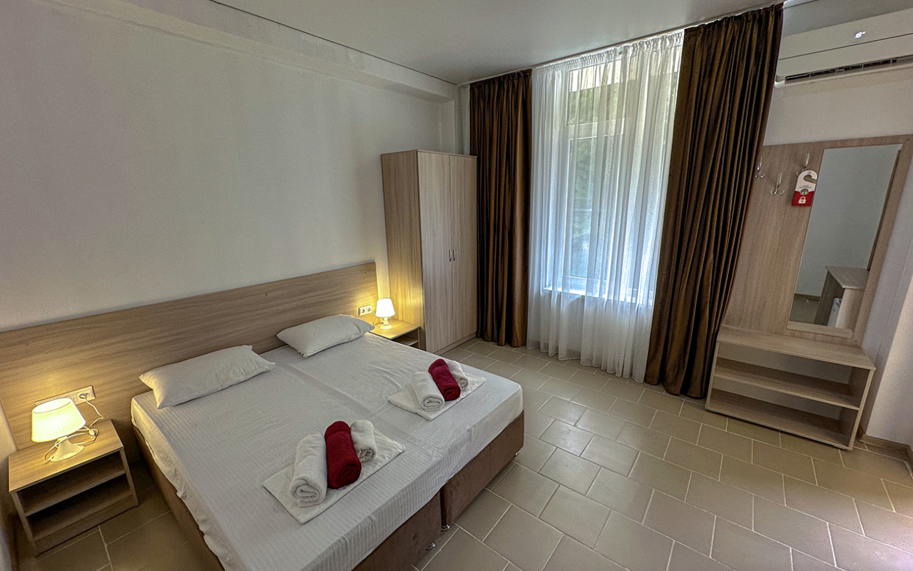 Площадь номера - 20-25 кв.м. 1 комната. 2 осн. места. В номере: телевизор; холодильник; кондиционер; душ; 1-спальные/ 2-спальная кровать; балкон (в части номеров); санузел. 1 доп. место: