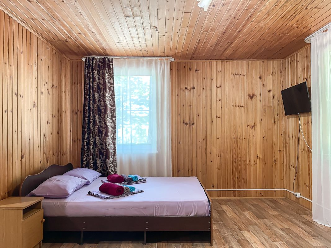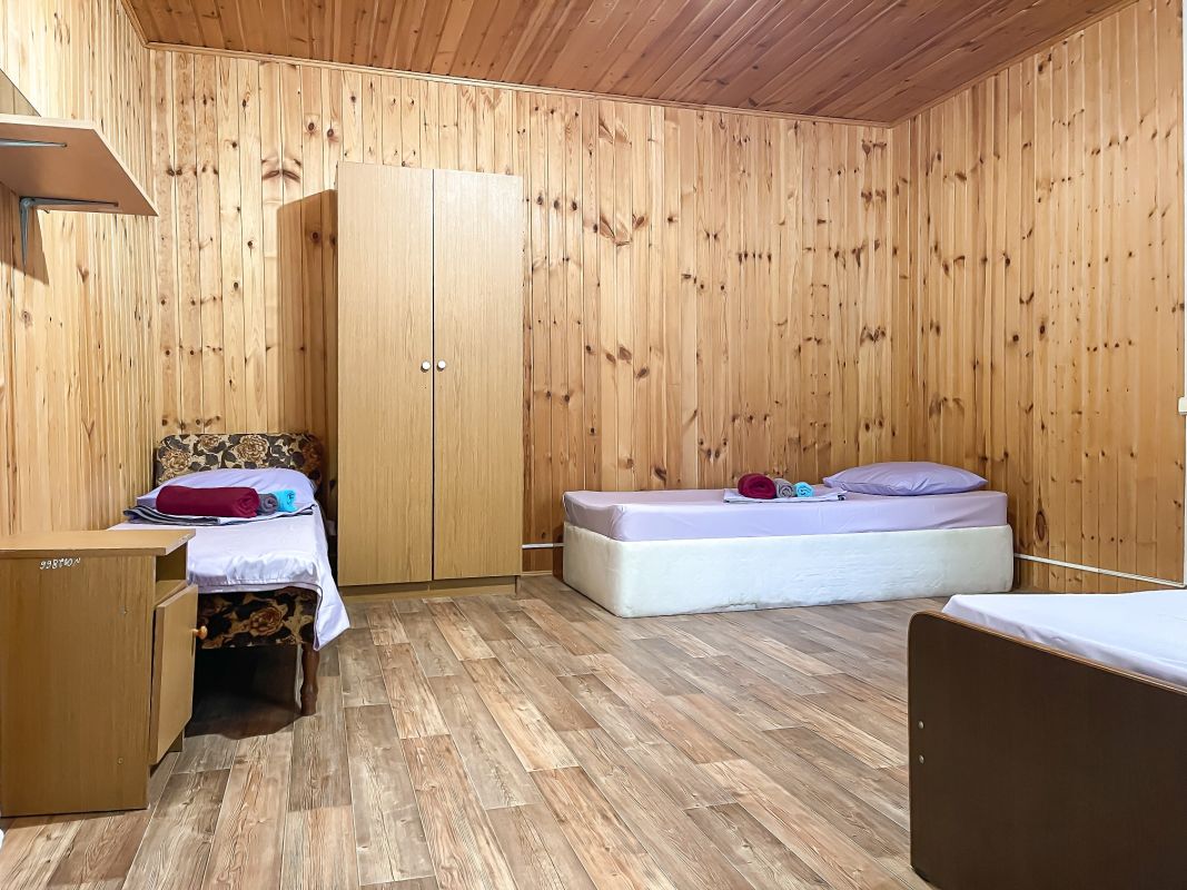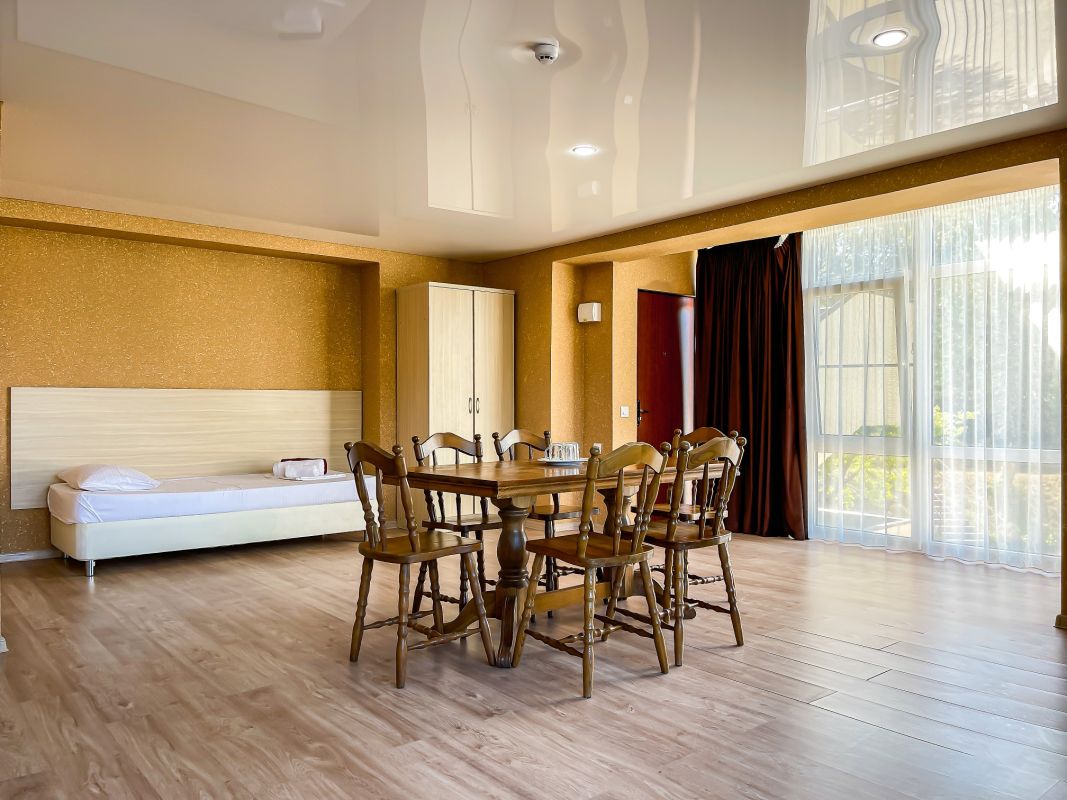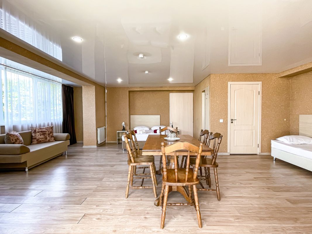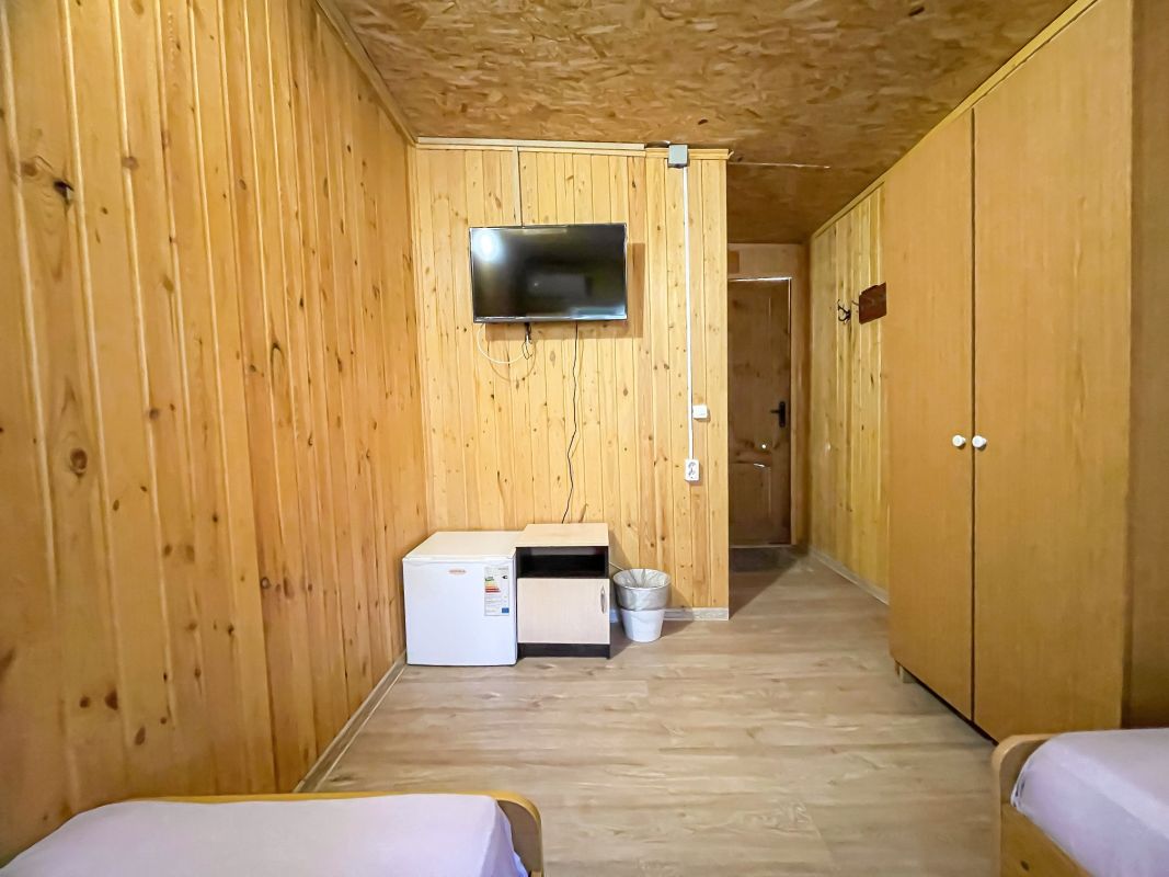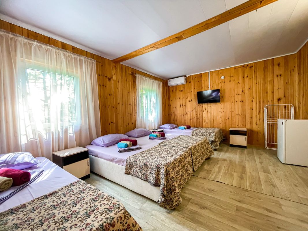 Площадь номера - 52 кв.м. Возможно размещение 3-х человек на основных местах + 2 дополнительных места.. В номере: душ, туалет, ТВ, холодильник, кондиционер.