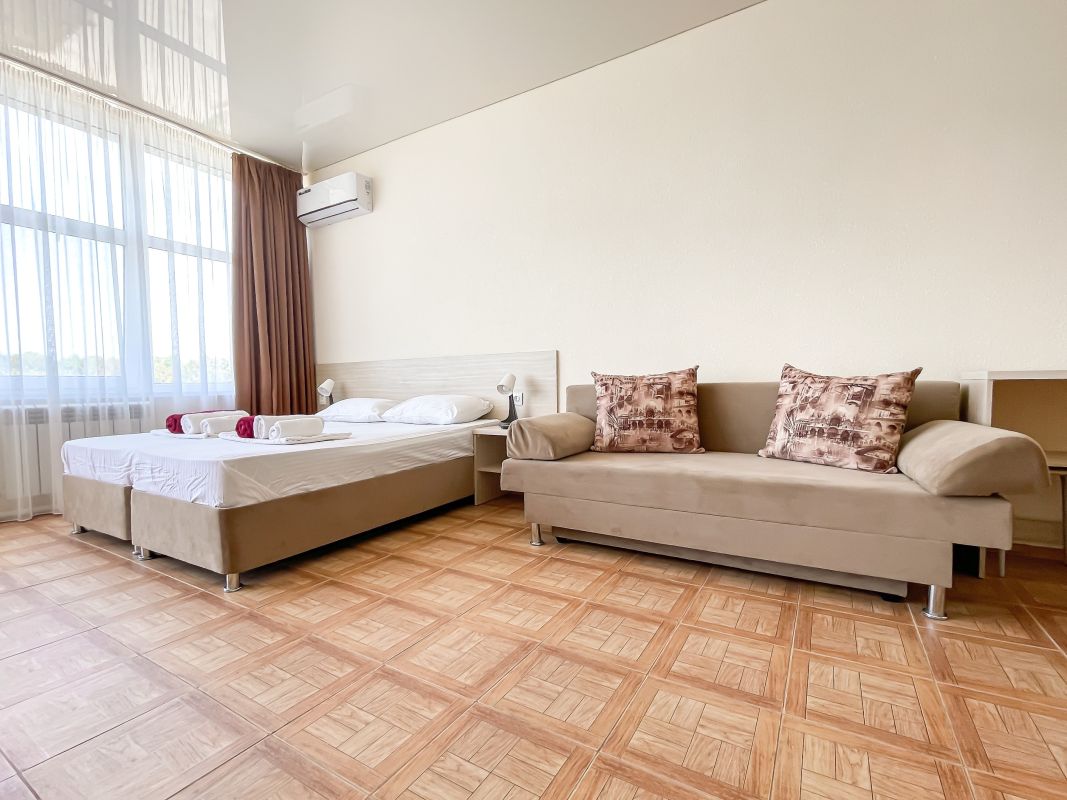 Площадь номера - 35 - 45 кв.м. Возможно размещение 3-х человек на основных местах + 1 доп место.. В номере: душ, туалет, ТВ, холодильник, кондиционер, односпальная кровать, две раздельные кровати, диван, балкон ((не во всех номерах)).