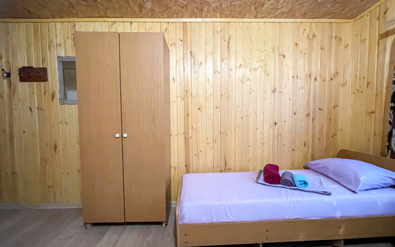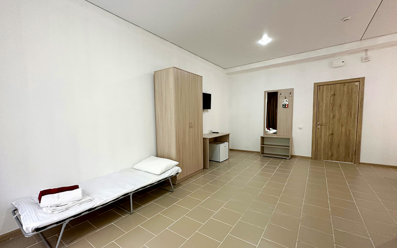 Площадь номера - 10 кв.м. Возможно размещение 1-го человека на основном месте + 1 дополнительное место.. В номере: душ, туалет, ТВ, холодильник, кондиционер, односпальная кровать.